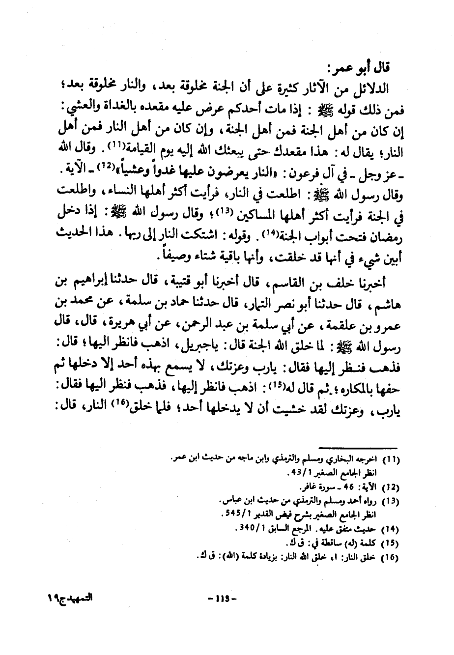 قَالَ أَبُو عُمَرَ الدَّلَائِلُ مِنَ الْآثَارِ كَثِيرَةٌ على أن الجنة ملخوقة بَعْدُ وَالنَّارُ مَخْلُوقَةٌ بَعْدُ فَمِنْ ذَلِكَ قَوْلُهُ صَلَّى اللَّهُ عَلَيْهِ وَسَلَّمَ إِذَا مَاتَ أَحَدُكُمْ عُرِضَ عَلَيْهِ مَقْعَدُهُ بِالْغَدَاةِ وَالْعَشِيِّ إِنْ كَانَ مِنْ أَهْلِ الْجَنَّةِ فَمِنْ أَهْلِ الْجَنَّةِ وَإِنْ كَانَ مِنْ أَهْلِ النَّارِ فَمِنْ أَهْلِ النَّارِ يُقَالُ لَهُ هَذَا مَقْعَدُكَ حَتَّى يَبْعَثَكَ اللَّهُ إِلَيْهِ يَوْمَ الْقِيَامَةِ وَقَالَ اللَّهِ عَزَّ وَجَلَّ فِي آلِ فِرْعَوْنَ النَّارُ يُعْرَضُونَ عَلَيْهَا غُدُوًّا وَعَشِيًّا الْآيَةَ وَقَالَ رَسُولُ اللَّهِ صَلَّى اللَّهُ عَلَيْهِ وَسَلَّمَ اطَّلَعْتُ فِي النَّارِ فَرَأَيْتُ أَكْثَرَ أَهْلِهَا النِّسَاءَ وَاطَّلَعْتُ فِي الْجَنَّةِ فَرَأَيْتُ أَكْثَرَ أَهْلِهَا الْمَسَاكِينَ وَقَالَ رَسُولُ اللَّهِ صَلَّى اللَّهُ عَلَيْهِ وَسَلَّمَ إِذَا دَخَلَ رَمَضَانُ فُتِّحَتْ أَبْوَابُ الْجَنَّةِ وَقَوْلُهُ اشْتَكَتِ النَّارُ إِلَى رَبِّهَا هَذَا الْحَدِيثُ أَبْيَنُ شَيْءٍ فِي أَنَّهَا قَدْ خُلِقَتْ وَأَنَّهَا بَاقِيَةٌ شِتَاءً وَصَيْفًا أَخْبَرَنَا خَلَفُ بْنُ الْقَاسِمِ قَالَ أَخْبَرَنَا أَبُو قُتَيْبَةَ قَالَ حَدَّثَنَا إِبْرَاهِيمُ بْنُ هَاشِمٍ قَالَ حَدَّثَنَا أَبُو نَصْرٍ التَّمَّارُ قَالَ حَدَّثَنَا حَمَّادُ بْنُ سَلَمَةَ عَنْ مُحَمَّدِ بْنِ عَمْرِو بْنِ عَلْقَمَةَ عَنْ أَبِي سَلَمَةَ بْنِ عَبْدِ الرَّحْمَنِ عَنْ أَبِي هُرَيْرَةَ قَالَ قَالَ رَسُولُ اللَّهِ صَلَّى اللَّهُ عَلَيْهِ وَسَلَّمَ لَمَّا خَلَقَ اللَّهُ الْجَنَّةَ قَالَ يَا جِبْرِيلُ اذْهَبْ فَانْظُرْ إِلَيْهَا قَالَ فَذَهَبَ فَنَظَرَ إِلَيْهَا فَقَالَ يَا رَبِّ وَعِزَّتِكَ لَا يَسْمَعُ بِهَذِهِ أَحَدٌ إِلَّا دَخَلَهَا ثُمَّ حَفَّهَا بِالْمَكَارِهِ ثُمَّ قَالَ لَهُ اذْهَبْ فَانْظُرْ إِلَيْهَا فَذَهَبَ فَنَظَرَ إِلَيْهَا فَقَالَ يَا رَبِّ وَعِزَّتِكَ لَقَدْ خَشِيتُ أَنْ لَا يَدْخُلَهَا أَحَدٌ فَلَمَّا خَلَقَ النار قال