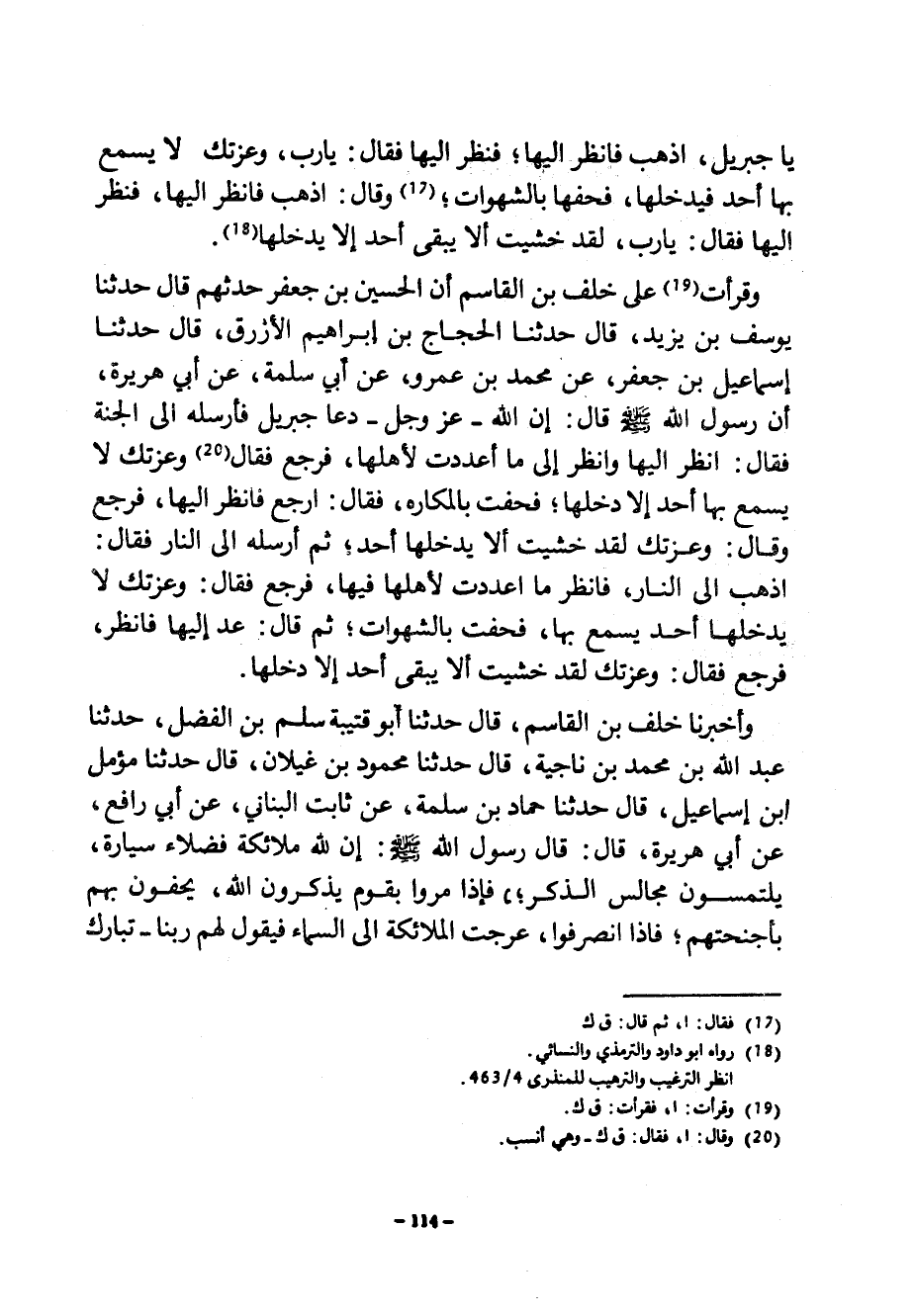 يَا جِبْرِيلُ اذْهَبْ فَانْظُرْ إِلَيْهَا فَنَظَرَ إِلَيْهَا فَقَالَ يَا رَبِّ وَعِزَّتِكَ لَا يَسْمَعُ بِهَا أَحَدٌ فَيَدْخُلُهَا فَحَفَّهَا بِالشَّهَوَاتِ وَقَالَ اذْهَبْ فَانْظُرْ إِلَيْهَا فَنَظَرَ إِلَيْهَا فَقَالَ يَا رَبِّ لَقَدْ شخيت أَلَّا يَبْقَى أَحَدٌ إِلَّا يَدْخُلُهَا وَقَرَأَتُ عَلَى خَلَفِ بْنِ الْقَاسِمِ أَنَّ الْحُسَيْنَ بْنَ جَعْفَرٍ حدثهم قال حدثنا يوسف بن يزد قَالَ حَدَّثَنَا الْحَجَّاجُ بْنُ إِبْرَاهِيمَ الْأَزْرَقُ قَالَ حدثنا إسماعيل بن جفعر عَنْ مُحَمَّدِ بْنِ عَمْرٍو عَنْ أَبِي سَلَمَةَ عَنْ أَبِي هُرَيْرَةَ أَنَّ رَسُولَ اللَّهِ صَلَّى اللَّهُ عَلَيْهِ وَسَلَّمَ قَالَ إِنَّ اللَّهَ عَزَّ وَجَلَّ دَعَا جِبْرِيلَ فَأَرْسَلَهُ إِلَى الْجَنَّةِ فَقَالَ انْظُرْ إِلَيْهَا وَانْظُرْ إِلَى مَا أَعْدَدْتُ لِأَهْلِهَا فَرَجَعَ فَقَالَ وَعِزَّتِكَ لَا يَسْمَعُ بِهَا أَحَدٌ إِلَّا دَخَلَهَا فَحُفَّتْ بِالْمَكَارِهِ فَقَالَ ارْجِعْ فَانْظُرْ إِلَيْهَا فَرَجَعَ وَقَالَ وَعِزَّتِكَ لَقَدْ خَشِيتُ أَلَّا يَدْخُلَهَا أَحَدٌ ثُمَّ أَرْسَلَهُ إِلَى النَّارِ فَقَالَ اذْهَبْ إِلَى النَّارِ فَانْظُرْ مَا أَعْدَدْتُ لِأَهْلِهَا فِيهَا فَرَجَعَ فَقَالَ وَعِزَّتِكَ لَا يَدْخُلُهَا أَحَدٌ يَسْمَعُ بِهَا فَحُفَّتْ بِالشَّهَوَاتِ ثُمَّ قَالَ عُدْ إِلَيْهَا فَانْظُرْ فَرَجَعَ فَقَالَ وَعِزَّتِكَ لَقَدْ خَشِيتُ أَلَّا يَبْقَى أَحَدٌ إِلَّا دَخَلَهَا وَأَخْبَرَنَا خَلَفُ بْنُ الْقَاسِمِ قَالَ حَدَّثَنَا أَبُو قُتَيْبَةَ سَلْمُ بْنُ الْفَضْلِ حَدَّثَنَا عَبْدُ اللَّهِ بْنُ مُحَمَّدِ بْنِ نَاجِيَةَ قَالَ حَدَّثَنَا مَحْمُودُ بْنُ غَيْلَانَ قَالَ حَدَّثَنَا مؤمل ابن إِسْمَاعِيلَ قَالَ حَدَّثَنَا حَمَّادُ بْنُ سَلَمَةَ عَنْ ثَابِتٍ الْبُنَانِيِّ عَنْ أَبِي رَافِعٍ عَنْ أَبِي هُرَيْرَةَ قَالَ قَالَ رَسُولُ اللَّهِ صَلَّى اللَّهُ عَلَيْهِ وَسَلَّمَ إِنَّ لِلَّهِ مَلَائِكَةً فُضَلَاءَ سَيَّارَةً يَلْتَمِسُونَ مَجَالِسَ الذِّكْرِ فَإِذَا مَرُّوا بِقَوْمٍ يَذْكُرُونَ اللَّهَ يَحُفُّونَ بِهِمْ بِأَجْنِحَتِهِمْ فَإِذَا انْصَرَفُوا عَرَجَتِ الْمَلَائِكَةُ إِلَى السَّمَاءِ فَيَقُولُ لَهُمْ رَبُّنَا تَبَارَكَ