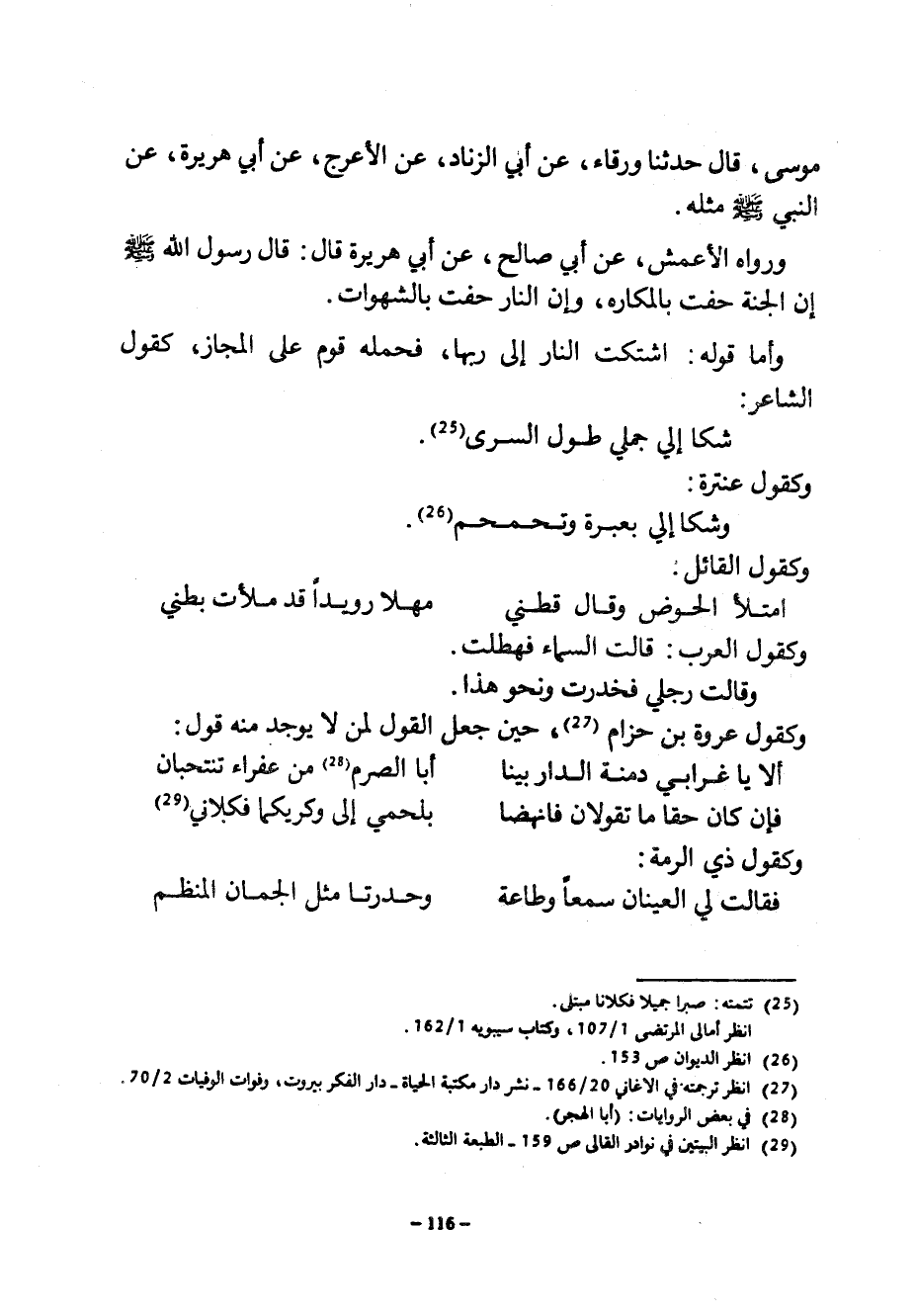 مُوسَى قَالَ حَدَّثَنَا وَرْقَاءُ عَنْ أَبِي الزِّنَادِ عن العرج عَنْ أَبِي هُرَيْرَةَ عَنِ النَّبِيِّ صَلَّى اللَّهُ عَلَيْهِ وَسَلَّمَ مِثْلَهُ وَرَوَاهُ الْأَعْمَشُ عَنْ أَبِي صالح عن هُرَيْرَةَ قَالَ قَالَ رَسُولُ اللَّهِ صَلَّى اللَّهُ عَلَيْهِ وَسَلَّمَ إِنَّ الْجَنَّةَ حُفَّتْ بِالْمَكَارِهِ وَإِنَّ النَّارَ حُفَّتْ بِالشَّهَوَاتِ وَأَمَّا قَوْلُهُ اشْتَكَتِ النَّارُ إِلَى رَبِّهَا فَحَمَلَهُ قَوْمٌ عَلَى الْمَجَازِ كَقَوْلِ الشَّاعِرِ ... شَكَا إِلَيَّ جَمَلِي طُولَ السُّرَى ... وَكَقَوْلِ عَنْتَرَةَ ... وَشَكَا إِلَيَّ بِعَبْرَةٍ وَتَحَمْحُمِ وَكَقَوْلِ الْقَائِلِ ... امْتَلَأَ الْحَوْضُ وَقَالَ قَطْنِي ... مَهْلًا رُوَيْدًا قَدْ مَلَأْتُ بَطْنِي ... وَكَقَوْلِ الْعَرَبِ قَالَتِ السَّمَاءُ فَهَطَلَتْ وَقَالَتْ رِجْلِي فَخَدِرَتْ وَنَحْوَ هَذَا وَكَقَوْلِ عُرْوَةَ بْنِ حِزَامٍ حِينَ جَعَلَ الْقَوْلَ لِمَنْ لَا يُوجَدُ مِنْهُ قَوْلٌ ... أَلَا يَا غُرَابَيْ دِمْنَةِ الدار بينا ... ... أبا الصرم من عفرا تَنْتَحِبَانِ ... ... فَإِنْ كَانَ حَقًّا مَا تَقُولَانِ فَانْهَضَا ... بِلَحْمِي إِلَى وَكْرَيْكُمَا فَكُلَانِي ... ... ... وَكَقَوْلِ ذِي الرُّمَّةِ ... فَقَالَتْ لِيَ الْعَيْنَانِ سَمْعًا وَطَاعَةً ... وَحَدَّرَتَا مِثْلَ الجمان المنظم