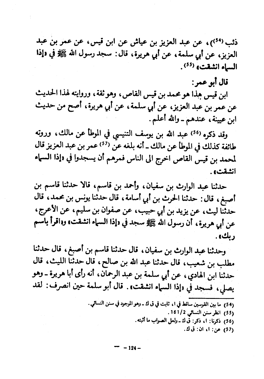 ذِئْبٍ عَنْ عَبْدِ الْعَزِيزِ بْنِ عَيَّاشٍ عَنِ ابْنِ قَيْسٍ عَنْ عُمَرَ بْنِ عَبْدِ الْعَزِيزِ عَنْ أَبِي سَلَمَةَ عَنْ أَبِي هُرَيْرَةَ قَالَ سَجَدَ رَسُولُ اللَّهِ صَلَّى اللَّهُ عَلَيْهِ وَسَلَّمَ فِي إِذَا السَّمَاءُ انْشَقَّتْ قَالَ أَبُو عُمَرَ ابْنُ قَيْسٍ هَذَا هُوَ مُحَمَّدُ بْنُ قَيْسٍ الْقَاصُّ وَهُوَ ثِقَةٌ وَرِوَايَتُهُ لِهَذَا الْحَدِيثِ عَنْ عُمَرَ بْنِ عَبْدِ الْعَزِيزِ عَنْ أَبِي سَلَمَةَ عَنْ أَبِي هُرَيْرَةَ أَصَحُّ مِنْ حَدِيثِ ابْنِ عُيَيْنَةَ عِنْدَهُمْ وَاللَّهُ أَعْلَمُ وَقَدْ ذَكَرَهُ عَبْدُ اللَّهِ بْنُ يُوسُفَ التِّنِّيسِيُّ فِي الْمُوَطَّأِ عَنْ مَالِكٍ وَرَوَتْهُ طَائِفَةٌ كَذَلِكَ فِي الْمُوَطَّأِ عَنْ مَالِكٍ أَنَّهُ بَلَغَهُ عَنْ عُمَرَ بْنِ عَبْدِ الْعَزِيزِ قَالَ لِمُحَمَّدِ بْنِ قَيْسٍ الْقَاصِّ اخْرُجْ إِلَى النَّاسِ فَمُرْهُمْ أَنْ يَسْجُدُوا فِي إِذَا السَّمَاءُ انْشَقَّتْ حَدَّثَنَا عَبْدُ الْوَارِثِ بْنُ سُفْيَانَ وَأَحْمَدُ بْنُ قَاسِمٍ قَالَا حَدَّثَنَا قَاسِمُ بْنُ أَصْبَغَ قَالَ حَدَّثَنَا الْحَرْثُ بْنُ أَبِي أُسَامَةَ قَالَ حَدَّثَنَا يُونُسُ بْنُ مُحَمَّدٍ قَالَ حَدَّثَنَا لَيْثٌ عَنْ يَزِيدَ بْنِ أَبِي حَبِيبٍ عَنْ صَفْوَانَ بْنِ سُلَيْمٍ عَنِ الْأَعْرَجِ عَنْ أَبِي هُرَيْرَةَ أَنَّ رَسُولَ اللَّهِ صَلَّى اللَّهُ عَلَيْهِ وسلم سجد في إذا السماء انشقت واقرأ بِاسْمِ رَبِّكَ وَحَدَّثَنَا عَبْدُ الْوَارِثِ بْنُ سُفْيَانَ قَالَ حَدَّثَنَا قَاسِمُ بْنُ أَصْبَغَ قَالَ حَدَّثَنَا مُطَّلِبُ بْنُ شُعَيْبٍ قَالَ حَدَّثَنَا عَبْدُ اللَّهِ بْنُ صَالِحٍ قَالَ حَدَّثَنَا اللَّيْثُ قَالَ حَدَّثَنَا ابْنُ الْهَادِي عَنْ أَبِي سَلَمَةَ بْنِ عَبْدِ الرحمان أَنَّهُ رَأَى أَبَا هُرَيْرَةَ وَهُوَ يُصَلِّي فَسَجَدَ فِي إِذَا السَّمَاءُ انْشَقَّتْ قَالَ أَبُو سَلَمَةَ حِينَ انْصَرَفَ لَقَدْ