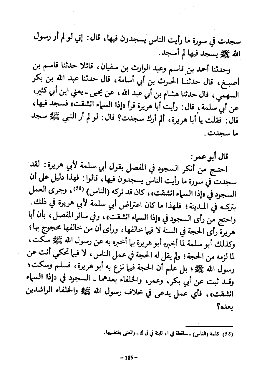 سَجَدْتَ فِي سُورَةٍ مَا رَأَيْتُ النَّاسَ يَسْجُدُونَ فِيهَا قَالَ إِنِّي لَوْ لَمْ أَرَ رَسُولَ اللَّهِ صَلَّى اللَّهُ عَلَيْهِ وَسَلَّمَ يَسْجُدُ فِيهَا لَمْ أَسْجُدْ وَحَدَّثَنَا أَحْمَدُ بْنُ قَاسِمٍ وَعَبْدُ الْوَارِثِ بْنُ سفيان قائلا حَدَّثَنَا قَاسِمُ بْنُ أَصْبَغَ قَالَ حَدَّثَنَا الْحَرْثُ بْنُ أَبِي أُسَامَةَ قَالَ حَدَّثَنَا عَبْدُ اللَّهِ بْنُ بَكْرٍ السَّهْمِيُّ قَالَ حَدَّثَنَا هِشَامُ بْنُ أَبِي عَبْدِ اللَّهِ عَنْ يَحْيَى يَعْنِي ابْنَ أَبِي كَثِيرٍ عَنْ أَبِي سَلَمَةَ قَالَ رَأَيْتُ أَبَا هُرَيْرَةَ قَرَأَ إِذَا السَّمَاءُ انْشَقَّتْ فَسَجَدَ فِيهَا قَالَ فَقُلْتُ يَا أَبَا هُرَيْرَةَ أَلَمْ أَرَكَ سَجَدْتَ قَالَ لَوْ لَمْ أَرَ النَّبِيَّ صَلَّى اللَّهُ عَلَيْهِ وَسَلَّمَ سَجَدَ مَا سَجَدْتُ قَالَ أَبُو عُمَرَ احْتَجَّ مَنْ أَنْكَرَ السُّجُودَ فِي الْمُفَصَّلِ بِقَوْلِ أَبِي سَلَمَةَ لِأَبِي هُرَيْرَةَ لَقَدْ سَجَدْتَ فِي سُورَةٍ مَا رَأَيْتُ النَّاسَ يَسْجُدُونَ فِيهَا قَالُوا فَهَذَا دَلِيلٌ عَلَى أَنَّ السُّجُودَ فِي إِذَا السَّمَاءُ انْشَقَّتْ كَانَ قَدْ تَرَكَهُ (النَّاسُ) وَجَرَى الْعَمَلُ بِتَرْكِهِ فِي الْمَدِينَةِ فلهذا ما كَانَ اعْتِرَاضُ أَبِي سَلَمَةَ لِأَبِي هُرَيْرَةَ فِي ذَلِكَ وَاحْتَجَّ مَنْ رَأَى السُّجُودَ فِي إِذَا السَّمَاءُ انْشَقَّتْ وَفِي سَائِرِ الْمُفَصَّلِ بِأَنَّ أَبَا هُرَيْرَةَ رَأَى الْحُجَّةَ فِي السُّنَّةِ لَا فِيمَا خالفهما ورأى أن من خلافها مَحْجُوجٌ بِهَا وَكَذَلِكَ أَبُو سَلَمَةَ لَمَّا أَخْبَرَهُ أَبُو هُرَيْرَةَ بِمَا أَخْبَرَهُ بِهِ عَنْ رَسُولِ اللَّهِ صَلَّى اللَّهُ عَلَيْهِ وَسَلَّمَ سَكَتَ لِمَا لَزِمَهُ مِنَ الْحُجَّةِ وَلَمْ يَقُلْ لَهُ الْحُجَّةُ فِي عَمَلِ النَّاسِ لَا فِيمَا تَحْكِي أَنْتَ عَنْ رَسُولِ اللَّهِ صَلَّى اللَّهُ عَلَيْهِ وَسَلَّمَ بَلْ عَلِمَ أَنَّ الْحُجَّةَ فِيمَا نَزَعَ بِهِ أَبُو هُرَيْرَةَ فَسَلَّمَ وَسَكَتَ وَقَدْ ثَبَتَ عَنْ أَبِي بَكْرٍ وَعُمَرَ وَالْخُلَفَاءِ بَعْدَهُمَا السُّجُودُ فِي إِذَا السَّمَاءُ انْشَقَّتْ فَأَيُّ عَمَلٍ يُدَّعَى فِي خِلَافِ رَسُولُ اللَّهِ صَلَّى اللَّهُ عَلَيْهِ وَسَلَّمَ وَالْخُلَفَاءُ الرَّاشِدِينَ بَعْدَهُ