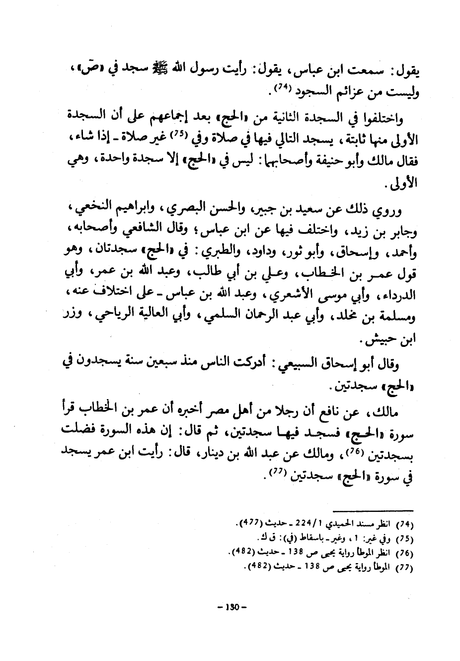 يَقُولُ سَمِعْتُ ابْنَ عَبَّاسٍ يَقُولُ رَأَيْتُ رَسُولَ اللَّهِ صَلَّى اللَّهُ عَلَيْهِ وَسَلَّمَ سَجَدَ فِي ص وَلَيْسَتْ مِنْ عَزَائِمِ السُّجُودِ وَاخْتَلَفُوا فِي السَّجْدَةِ الثَّانِيَةِ مِنَ الْحَجِّ بَعْدَ إِجْمَاعِهِمْ عَلَى أَنَّ السَّجْدَةَ الْأُولَى مِنْهَا ثَابِتَةٌ يَسْجُدُ التَّالِي فِيهَا فِي صَلَاةٍ وَفِي غَيْرِ صَلَاةٍ إِذَا شَاءَ فَقَالَ مَالِكٌ وَأَبُو حَنِيفَةَ وَأَصْحَابُهُمَا لَيْسَ فِي الْحَجِّ إِلَّا سَجْدَةٌ وَاحِدَةٌ وَهِيَ الْأُولَى وَرُوِيَ ذَلِكَ عَنْ سَعِيدِ بْنِ جُبَيْرٍ وَالْحَسَنِ الْبَصْرِيِّ وَإِبْرَاهِيمَ النَّخَعِيِّ وَجَابِرِ بْنِ زَيْدٍ وَاخْتُلِفَ فِيهَا عَنِ ابْنِ عَبَّاسٍ وَقَالَ الشَّافِعِيُّ وَأَصْحَابُهُ وَأَحْمَدُ وَإِسْحَاقُ وَأَبُو ثَوْرٍ وَدَاوُدُ وَالطَّبَرَيُّ فِي الْحَجِّ سَجْدَتَانِ وَهُوَ قَوْلُ عُمَرَ بْنِ الْخَطَّابِ وَعَلِيِّ بْنِ أَبِي طَالِبٍ وَعَبْدِ اللَّهِ بْنِ عُمَرَ وَأَبِي الدَّرْدَاءِ وَأَبِي مُوسَى الْأَشْعَرِيِّ وَعَبْدِ اللَّهِ بْنِ عَبَّاسٍ عَلَى اخْتِلَافٍ عَنْهُ وَمَسْلَمَةُ بن مخلد وأبي عبد الرحمان السلمي وأبي العالية الرياحي وزر ابن حُبَيْشٍ وَقَالَ أَبُو إِسْحَاقَ السَّبِيعِيُّ أَدْرَكْتُ النَّاسَ مُنْذُ سَبْعِينَ سَنَةً يَسْجُدُونَ فِي الْحَجِّ سَجْدَتَيْنِ مَالِكٌ عَنْ نَافِعٍ أَنَّ رَجُلًا مِنْ أَهْلِ مِصْرَ أَخْبَرَهُ أَنَّ عُمَرَ بْنَ الْخَطَّابِ قَرَأَ سُورَةَ الْحَجِّ فَسَجَدَ فِيهَا سَجْدَتَيْنِ ثُمَّ قَالَ إِنَّ هَذِهِ السُّورَةَ فُضِّلَتْ بِسَجْدَتَيْنِ وَمَالِكٌ عَنْ عَبْدِ اللَّهِ بْنِ دِينَارٍ قَالَ رَأَيْتُ ابْنَ عُمَرَ يَسْجُدُ فِي سُورَةِ الْحَجِّ سَجْدَتَيْنِ