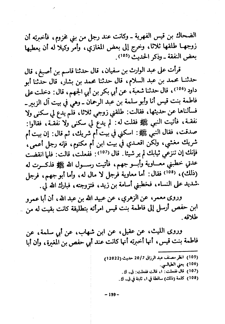 الضَّحَّاكِ بْنِ قَيْسٍ الْفِهْرِيَّةَ وَكَانَتْ عِنْدَ رَجُلٍ مِنْ بَنِي مَخْزُومٍ فَأَخْبَرَتْهُ أَنَّ زَوْجَهَا طَلَّقَهَا ثَلَاثًا وَخَرَجَ إِلَى بَعْضِ الْمَغَازِي وَأَمَرَ وَكِيلًا لَهُ أَنْ يُعْطِيَهَا بَعْضَ النَّفَقَةِ وَذَكَرَ الْحَدِيثَ قَرَأْتُ عَلَى عَبْدِ الْوَارِثِ بْنِ سُفْيَانَ قَالَ حَدَّثَنَا قَاسِمُ بْنُ أَصْبَغَ قَالَ حَدَّثَنَا مُحَمَّدُ بْنُ عَبْدِ السَّلَامِ قَالَ حَدَّثَنَا مُحَمَّدُ بْنُ بَشَّارٍ قَالَ حَدَّثَنَا أَبُو دَاوُدَ قَالَ حَدَّثَنَا شُعْبَةُ عَنْ أَبِي بَكْرِ بْنِ أَبِي الْجَهْمِ قَالَ دَخَلْتُ عَلَى فَاطِمَةَ بِنْتِ قَيْسٍ أَنَا وأبو سلمة بن عبد الرحمان وَهِيَ فِي بَيْتِ آلِ الزُّبَيْرِ فَسَأَلْنَاهَا عَنْ حَدِيثِهَا فَقَالَتْ طَلَّقَنِي زَوْجِي ثَلَاثًا فَلَمْ يَدَعْ لِي سُكْنَى وَلَا نَفَقَةً فَأَتَيْتُ النَّبِيَّ صَلَّى اللَّهُ عَلَيْهِ وَسَلَّمَ فَقُلْتُ لَهُ لَمْ يَدَعْ لِي سُكْنَى وَلَا نَفَقَةً فَقَالُوا صَدَقَتْ فَقَالَ النَّبِيُّ صَلَّى اللَّهُ عَلَيْهِ وَسَلَّمَ اسْكُنِي فِي بَيْتِ أُمِّ شَرِيكٍ ثُمَّ قَالَ إِنَّ بَيْتَ أُمِّ شَرِيكٍ مَغْشِيٌّ وَلَكِنِ اقْعُدِي فِي بَيْتِ ابن ام مكتوم فإنه رجل أَعْمَى فَإِنَّكِ إِنْ تَنْزِعِي ثِيَابَكِ لَمْ يَرَ شَيْئًا قَالَ فَفَعَلَتْ قَالَتْ فَلَمَّا انْقَضَتْ عِدَّتِي خَطَبَنِي مُعَاوِيَةُ وَأَبُو جَهْمٍ فَأَتَيْتُ رَسُولَ اللَّهِ صَلَّى اللَّهُ عَلَيْهِ وَسَلَّمَ فَذَكَرْتُ لَهُ (ذَلِكَ) فَقَالَ أَمَّا مُعَاوِيَةُ فَرَجُلٌ لَا مَالَ لَهُ وَأَمَّا أَبُو جَهْمٍ فَرَجُلٌ شَدِيدٌ عَلَى النِّسَاءِ فَخَطَبَنِي أُسَامَةُ بْنُ زَيْدٍ فَتَزَوَّجْتُهُ فَبَارَكَ اللَّهُ لِي وَرَوَى مَعْمَرٍ عَنِ الزُّهْرِيِّ عَنْ عُبَيْدِ اللَّهِ بْنِ عَبْدِ اللَّهِ أَنْ أَبَا عَمْرِو ابن حَفْصٍ أَرْسَلَ إِلَى فَاطِمَةَ بِنْتَ قَيْسٍ امْرَأَتِهِ بتطليقة كَانَتْ بَقِيَتْ لَهُ مِنْ طَلَاقِهِ وَرَوَى اللَّيْثِ عَنْ عُقَيْلٍ عَنِ ابْنِ شِهَابٍ عَنْ أَبِي سَلَمَةَ عَنْ فَاطِمَةَ بِنْتِ قَيْسٍ أَنَّهَا أَخْبَرَتْهُ أَنَّهَا كَانَتْ عِنْدَ أَبِي حَفْصِ بْنِ الْمُغِيرَةِ وأن أبا
