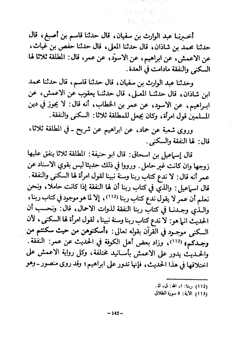 أَخْبَرَنَا عَبْدُ الْوَارِثِ بْنُ سُفْيَانَ قَالَ حَدَّثَنَا قَاسِمُ بْنُ أَصْبَغَ قَالَ حَدَّثَنَا مُحَمَّدُ بْنُ شَاذَانَ قَالَ حَدَّثَنَا الْمُعَلَّى قَالَ حَدَّثَنَا حَفْصُ بْنُ غِيَاثٍ عَنِ الْأَعْمَشِ عَنْ إِبْرَاهِيمَ عَنِ الْأَسْوَدِ عَنْ عُمَرَ قَالَ الْمُطَلَّقَةُ ثَلَاثًا لَهَا السُّكْنَى وَالنَّفَقَةُ مَا دَامَتْ فِي الْعِدَّةِ وَحَدَّثَنَا عَبْدُ الْوَارِثِ بْنُ سُفْيَانَ قَالَ حَدَّثَنَا قاسم قال حدثنا محمد ابن شَاذَانَ قَالَ حَدَّثَنَا الْمُعَلَّى قَالَ حَدَّثَنَا يَعْقُوبُ عَنِ الْأَعْمَشِ عَنْ إِبْرَاهِيمَ عَنِ الْأَسْوَدِ عَنْ عُمَرَ بْنِ الْخَطَّابِ أَنَّهُ قَالَ لَا يَجُوزُ فِي دِينِ الْمُسْلِمِينَ قَوْلُ امْرَأَةٍ وَكَانَ يَجْعَلُ لِلْمُطَلَّقَةِ ثَلَاثًا السُّكْنَى وَالنَّفَقَةَ وَرَوَى شُعْبَةُ عَنْ حَمَّادٍ عَنْ إِبْرَاهِيمَ عَنْ شُرَيْحٍ فِي الْمُطَلَّقَةِ ثَلَاثًا قَالَ لَهَا النَّفَقَةُ وَالسُّكْنَى قَالَ إِسْمَاعِيلُ بْنُ إِسْحَاقَ قَالَ أَبُو حَنِيفَةَ الْمُطَلَّقَةُ ثَلَاثًا يُنْفِقُ عَلَيْهَا زَوْجُهَا وَإِنْ كَانَتْ غَيْرَ حَامِلٍ وَرَوَوْا فِي ذَلِكَ حَدِيثًا لَيْسَ بِقَوِيِّ الْإِسْنَادِ عَنْ عُمَرَ أَنَّهُ قَالَ لَا نَدَعُ كِتَابَ رَبِّنَا وَسُنَّةَ نَبِيِّنَا لِقَوْلِ امْرَأَةٍ لَهَا السُّكْنَى وَالنَّفَقَةُ قَالَ إِسْمَاعِيلُ وَالَّذِي فِي كِتَابِ رَبِّنَا أَنَّ لَهَا النَّفَقَةَ إِذَا كَانَتْ حَامِلًا وَنَحْنُ نَعْلَمُ أَنَّ عُمَرَ لَا يَقُولُ نَدَعُ كِتَابَ رَبِّنَا إِلَّا لِمَا هُوَ مَوْجُودٌ فِي كِتَابِ رَبِّنَا وَالَّذِي وَجَدْنَا فِي كِتَابِ رَبِّنَا النَّفَقَةُ لِذَوَاتِ الْأَحْمَالِ قَالَ وَنَحْسَبُ أَنَّ الْحَدِيثَ إِنَّمَا هُوَ لَا نَدَعُ كِتَابَ رَبِّنَا وَسُنَّةَ نَبِيِّنَا لِقَوْلِ امْرَأَةٍ لَهَا السُّكْنَى لِأَنَّ السُّكْنَى مَوْجُودٌ فِي الْقُرْآنِ بِقَوْلِهِ تَعَالَى أَسْكِنُوهُنَّ مِنْ حَيْثُ سَكَنْتُمْ مِنْ وُجْدِكُمْ وَزَادَ بَعْضُ أَهْلِ الْكُوفَةِ فِي الْحَدِيثِ عَنْ عُمَرَ النَّفَقَةُ وَالْحَدِيثُ يَدُورُ عَلَى الْأَعْمَشِ بِأَسَانِيدَ مُخْتَلِفَةٍ وَكُلُّ رِوَايَةِ الْأَعْمَشِ عَلَى اخْتِلَافِهَا فِي هَذَا الْحَدِيثِ فَإِنَّهَا تَدُورُ عَلَى إِبْرَاهِيمَ وَقَدْ رَوَى مَنْصُورٌ وَهُوَ