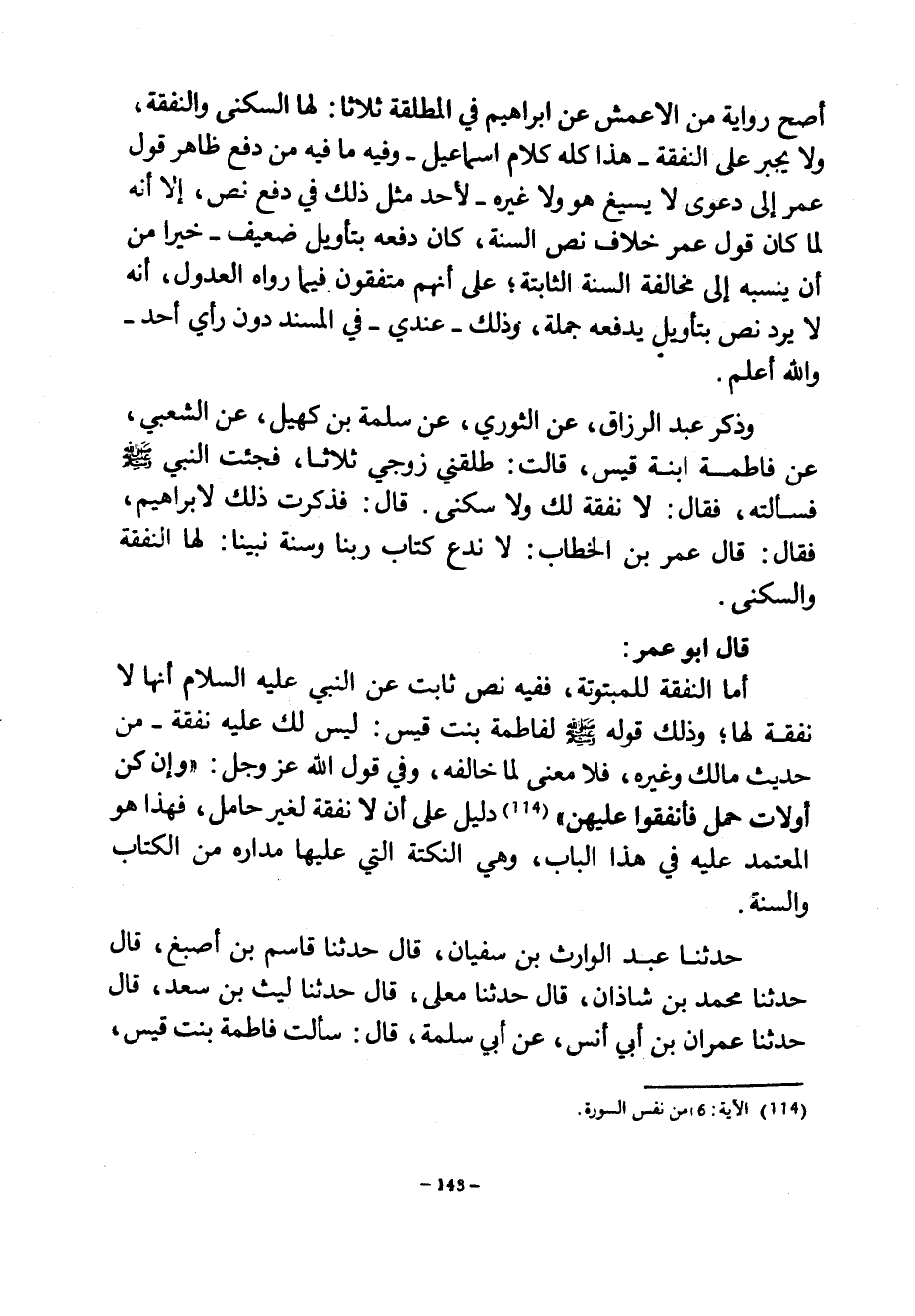 أَصَحُّ رِوَايَةً مِنَ الْأَعْمَشِ عَنْ إِبْرَاهِيمَ فِي الْمُطَلَّقَةِ ثَلَاثًا لَهَا السُّكْنَى وَالنَّفَقَةُ وَلَا يُجْبَرُ عَلَى النَّفَقَةِ هَذَا كُلُّهُ كَلَامُ إِسْمَاعِيلَ وَفِيهِ مَا فِيهِ مِنْ دَفْعِ ظَاهِرِ قَوْلِ عُمَرَ إِلَى دَعْوَى لَا يُسِيغُ هُوَ وَلَا غَيْرُهُ لِأَحَدٍ مِثْلَ ذَلِكَ فِي دَفْعِ نَصٍّ إِلَّا أَنَّهُ لَمَّا كَانَ قَوْلُ عُمَرَ خِلَافَ نَصِّ السُّنَّةِ كَانَ دَفْعُهُ بِتَأْوِيلٍ ضَعِيفٍ خَيْرًا مِنْ أَنْ يَنْسُبَهُ إِلَى مُخَالَفَةِ السُّنَّةِ الثَّابِتَةِ عَلَى أَنَّهُمْ مُتَّفِقُونَ فِيمَا رَوَاهُ الْعُدُولُ أَنَّهُ لَا يُرَدُّ نَصٌّ بِتَأْوِيلٍ يَدْفَعُهُ جُمْلَةً وَذَلِكَ عِنْدِي فِي الْمُسْنَدِ دُونَ رَأْيِ أَحَدٍ وَاللَّهُ أَعْلَمُ وَذَكَرَ عَبْدُ الرَّزَّاقِ عَنِ الثَّوْرِيِّ عَنْ سَلَمَةَ بْنِ كُهَيْلٍ عَنْ الشَّعْبِيِّ عَنْ فَاطِمَةَ ابْنَةِ قَيْسٍ قَالَتْ طَلَّقَنِي زَوْجِي ثَلَاثًا فَجِئْتُ النَّبِيَّ صَلَّى اللَّهُ عَلَيْهِ وَسَلَّمَ فَسَأَلْتُهُ فَقَالَ لَا نَفَقَةَ لَكِ وَلَا سُكْنَى قَالَ فَذَكَرْتُ ذَلِكَ لِإِبْرَاهِيمَ فَقَالَ قَالَ عُمَرُ بْنُ الْخَطَّابِ لَا نَدَعُ كِتَابَ رَبِّنَا وَسُنَّةَ نَبِيِّنَا لَهَا النَّفَقَةُ وَالسُّكْنَى قَالَ أَبُو عُمَرَ أَمَّا النَّفَقَةُ لَلْمَبْتُوتَةِ فَفِيهِ نَصٌّ ثَابِتٌ عَنِ النَّبِيِّ عَلَيْهِ السَّلَامُ أَنَّهَا لَا نَفَقَةَ لَهَا وَذَلِكَ قَوْلُهُ صَلَّى اللَّهُ عَلَيْهِ وَسَلَّمَ لِفَاطِمَةَ بِنْتِ قَيْسٍ لَيْسَ لَكِ عَلَيْهِ نَفَقَةٌ مِنْ حَدِيثِ مَالِكٍ وَغَيْرِهِ فَلَا مَعْنَى لِمَا خَالَفَهُ وَفِي قَوْلِ اللَّهِ عَزَّ وَجَلَّ وَإِنْ كُنَّ أُولَاتِ حَمْلٍ فَأَنْفِقُوا عَلَيْهِنَّ دَلِيلٌ عَلَى أَنْ لَا نَفَقَةَ لِغَيْرِ حَامِلٍ فَهَذَا هُوَ الْمُعْتَمَدُ عَلَيْهِ فِي هَذَا الْبَابِ وَهِيَ النُّكْتَةُ الَّتِي عَلَيْهَا مَدَارُهُ مِنَ الْكِتَابِ وَالسَّنَةِ حَدَّثَنَا عَبْدُ الْوَارِثِ بْنُ سُفْيَانَ قَالَ حَدَّثَنَا قَاسِمُ بْنُ أَصْبَغَ قَالَ حَدَّثَنَا مُحَمَّدُ بْنُ شَاذَانَ قَالَ حَدَّثَنَا مُعَلَّى قَالَ حَدَّثَنَا لَيْثُ بْنُ سَعْدٍ قَالَ حَدَّثَنَا عِمْرَانُ بْنُ أَبِي أَنَسٍ عَنْ أَبِي سَلَمَةَ قَالَ سَأَلْتُ فَاطِمَةَ بِنْتَ قَيْسٍ