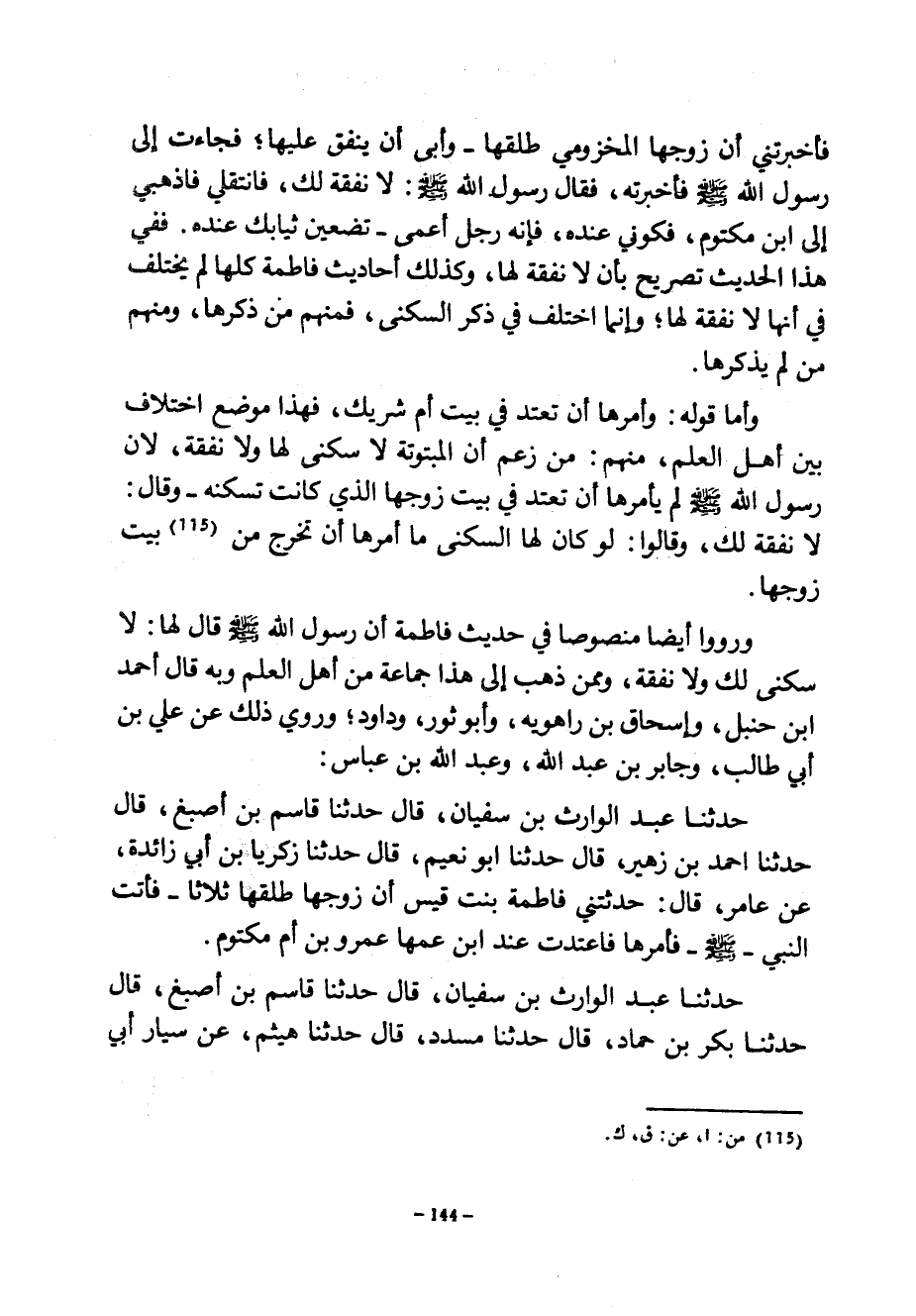 فَأَخْبَرَتْنِي أَنَّ زَوْجَهَا الْمَخْزُومِيَّ طَلَّقَهَا وَأَبَى أَنْ يُنْفِقَ عَلَيْهَا فَجَاءَتْ إِلَى رَسُولِ اللَّهِ صَلَّى اللَّهُ عَلَيْهِ وَسَلَّمَ فَأَخْبَرَتْهُ فَقَالَ رَسُولُ اللَّهِ صَلَّى اللَّهُ عَلَيْهِ وَسَلَّمَ لَا نَفَقَةَ لَكِ فَانْتَقِلِي فَاذْهَبِي إِلَى ابْنِ أُمِّ مَكْتُومٍ فَكُونِي عِنْدَهُ فَإِنَّهُ رَجُلٌ أَعْمَى تَضَعِينَ ثِيَابَكِ عِنْدَهُ فَفِي هَذَا الْحَدِيثِ تَصْرِيحٌ بِأَنْ لَا نَفَقَةَ لَهَا وَكَذَلِكَ أَحَادِيثُ فَاطِمَةَ كُلُّهَا لَمْ يُخْتَلَفْ فِي أَنَّهَا لَا نَفَقَةَ لَهَا وَإِنَّمَا اخْتُلِفَ فِي ذِكْرِ السُّكْنَى فَمِنْهُمْ مَنْ ذَكَرَهَا وَمِنْهُمْ مَنْ لَمْ يَذْكُرْهَا وَأَمَّا قَوْلُهُ وَأَمَرَهَا أَنْ تَعْتَدَّ فِي بَيْتِ أُمِّ شَرِيكٍ فَهَذَا مَوْضِعُ اخْتِلَافٍ بَيْنَ أَهْلِ الْعِلْمِ مِنْهُمْ مَنْ زَعَمَ أَنَّ الْمَبْتُوتَةَ لَا سُكْنَى لَهَا وَلَا نَفَقَةَ لِأَنَّ رَسُولَ اللَّهِ صَلَّى اللَّهُ عَلَيْهِ وَسَلَّمَ لَمْ يَأْمُرْهَا أَنْ تَعْتَدَّ فِي بَيْتِ زَوْجِهَا الَّذِي كَانَتْ تَسْكُنُهُ وَقَالَ لَا نَفَقَةَ لَكِ وَقَالُوا لَوْ كَانَ لَهَا السُّكْنَى مَا أَمَرَهَا أَنْ تَخْرُجَ مِنْ بَيْتِ زَوْجِهَا وَرَوَوْا أَيْضًا مَنْصُوصًا فِي حَدِيثِ فَاطِمَةَ أَنَّ رَسُولَ اللَّهِ صَلَّى اللَّهُ عَلَيْهِ وَسَلَّمَ قَالَ لَهَا لَا سُكْنَى لَكِ وَلَا نَفَقَةَ وَمِمَّنْ ذَهَبَ إِلَى هَذَا جَمَاعَةٌ مِنْ أَهْلِ الْعِلْمِ وَبِهِ قَالَ أحمد ابن حَنْبَلٍ وَإِسْحَاقُ بْنُ رَاهَوَيْهِ وَأَبُو ثَوْرٍ وَدَاوُدُ وَرُوِيَ ذَلِكَ عَنْ عَلِيِّ بْنِ أَبِي طَالِبٍ وَجَابِرِ بْنِ عَبْدِ اللَّهِ وَعَبْدِ اللَّهِ بْنِ عَبَّاسٍ حَدَّثَنَا عَبْدُ الْوَارِثِ بْنُ سُفْيَانَ قَالَ حَدَّثَنَا قَاسِمُ بْنُ أَصْبَغَ قَالَ حَدَّثَنَا أَحْمَدُ بْنُ زُهَيْرٍ قَالَ حَدَّثَنَا أَبُو نُعَيْمٍ قَالَ حَدَّثَنَا زَكَرِيَّا بْنُ أَبِي زَائِدَةَ عَنْ عَامِرٍ قَالَ حَدَّثَتْنِي فَاطِمَةُ بِنْتُ قَيْسٍ أَنَّ زَوْجَهَا طَلَّقَهَا ثَلَاثًا فَأَتَتِ النَّبِيَّ صَلَّى اللَّهُ عَلَيْهِ وَسَلَّمَ فَأَمَرَهَا فَاعْتَدَّتْ عِنْدَ ابْنِ عَمِّهَا عَمْرِو بْنِ أُمِّ مَكْتُومٍ حَدَّثَنَا عَبْدُ الْوَارِثِ بْنُ سُفْيَانَ قَالَ حَدَّثَنَا قَاسِمُ بْنُ أَصْبَغَ قَالَ حَدَّثَنَا بَكْرُ بْنُ حَمَّادٍ قَالَ حَدَّثَنَا مُسَدَّدٌ قَالَ حَدَّثَنَا هَيْثَمٌ عَنْ سَيَّارٍ أَبِي