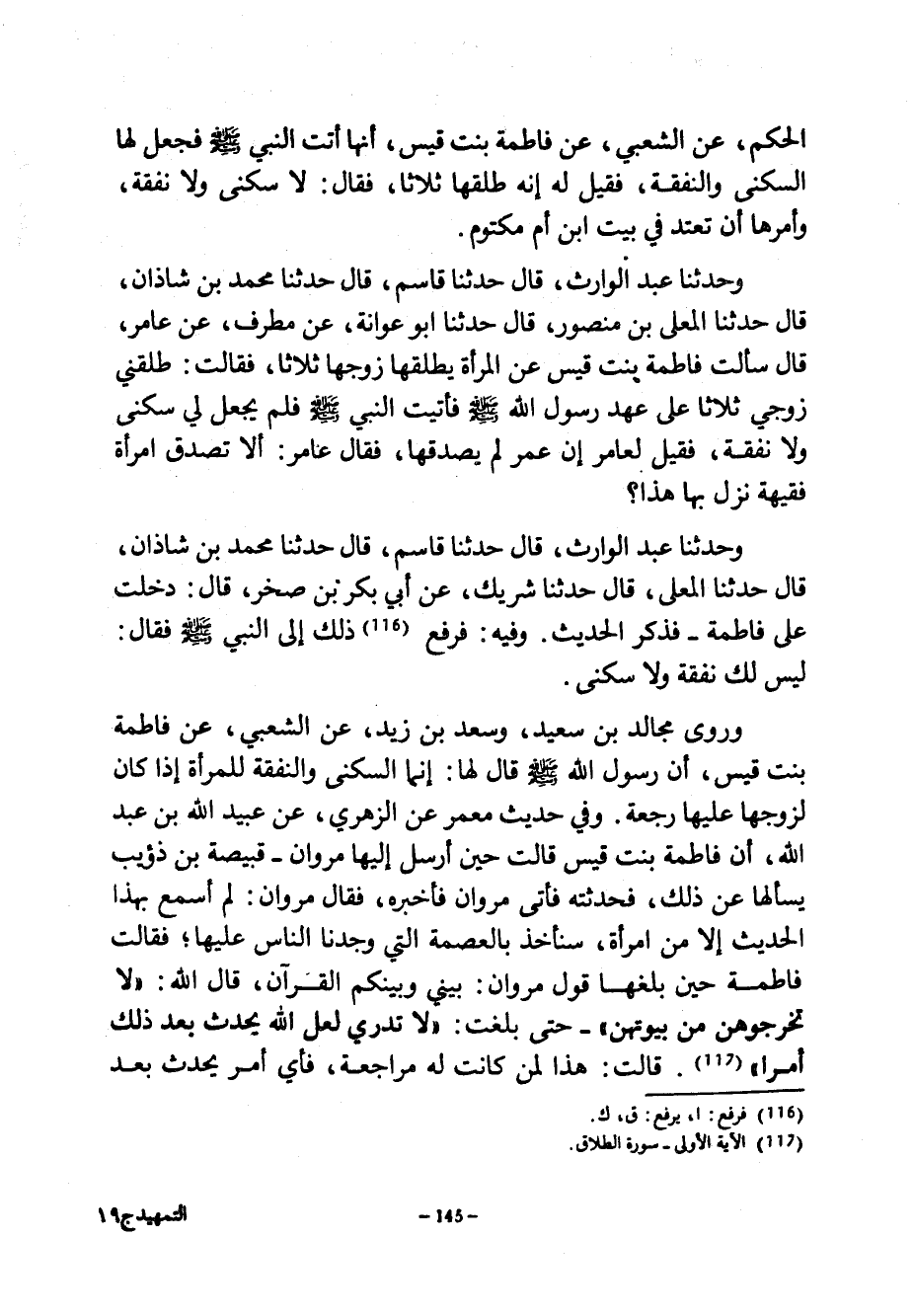 الْحَكَمِ عَنِ الشَّعْبِيِّ عَنْ فَاطِمَةَ بِنْتِ قَيْسٍ أَنَّهَا أَتَتِ النَّبِيَّ صَلَّى اللَّهُ عَلَيْهِ وَسَلَّمَ فَجَعَلَ لَهَا السُّكْنَى وَالنَّفَقَةَ فَقِيلَ لَهُ إِنَّهُ طَلَّقَهَا ثَلَاثًا فَقَالَ لَا سُكْنَى وَلَا نَفَقَةَ وَأَمَرَهَا أَنْ تَعْتَدَّ فِي بَيْتِ ابْنِ أُمِّ مَكْتُومٍ وَحَدَّثَنَا عَبْدُ الْوَارِثِ قَالَ حَدَّثَنَا قَاسِمٌ قَالَ حَدَّثَنَا مُحَمَّدُ بْنُ شَاذَانَ قَالَ حَدَّثَنَا الْمُعَلَّى بْنُ مَنْصُورٍ قَالَ حَدَّثَنَا أَبُو عَوَانَةَ عَنْ مُطَرِّفٍ عَنْ عَامِرٍ قَالَ سَأَلْتُ فَاطِمَةَ بِنْتَ قَيْسٍ عَنِ الْمَرْأَةِ يُطَلِّقُهَا زَوْجُهَا ثَلَاثًا فَقَالَتْ طَلَّقَنِي زَوْجِي ثَلَاثًا عَلَى عَهْدِ رَسُولِ اللَّهِ صَلَّى اللَّهُ عَلَيْهِ وَسَلَّمَ فَأَتَيْتُ النَّبِيَّ صَلَّى اللَّهُ عَلَيْهِ وَسَلَّمَ فَلَمْ يَجْعَلْ لِي سُكْنَى وَلَا نَفَقَةً فَقِيلَ لِعَامِرٍ إِنَّ عُمَرَ لَمْ يُصَدِّقْهَا فَقَالَ عَامِرٌ أَلَا تُصَدِّقُ امْرَأَةً فَقِيهَةً نَزَلَ بِهَا هَذَا وَحَدَّثَنَا عَبْدُ الْوَارِثِ قَالَ حَدَّثَنَا قَاسِمٌ قَالَ حَدَّثَنَا مُحَمَّدُ بْنُ شَاذَانَ قَالَ حَدَّثَنَا الْمُعَلَّى قَالَ حَدَّثَنَا شَرِيكٌ عَنْ أَبِي بَكْرِ بْنِ صَخْرٍ قَالَ دَخَلْتُ عَلَى فَاطِمَةَ فَذَكَرَ الْحَدِيثَ وَفِيهِ فَرُفِعَ ذَلِكَ إِلَى النَّبِيِّ صَلَّى اللَّهُ عَلَيْهِ وَسَلَّمَ فَقَالَ لَيْسَ لَكِ نَفَقَةٌ وَلَا سُكْنَى وَرَوَى مُجَالِدُ بْنُ سَعِيدٍ وَسَعْدُ بْنُ زَيْدٍ عَنِ الشَّعْبِيِّ عَنْ فَاطِمَةَ بِنْتِ قَيْسٍ أَنَّ رَسُولَ اللَّهِ صَلَّى اللَّهُ عَلَيْهِ وَسَلَّمَ قَالَ لَهَا إِنَّمَا السُّكْنَى وَالنَّفَقَةُ لِلْمَرْأَةِ إِذَا كَانَ لِزَوْجِهَا عَلَيْهَا رَجْعَةٌ وَفِي حَدِيثِ مَعْمَرٍ عَنِ الزُّهْرِيِّ عَنْ عُبَيْدِ اللَّهِ بْنِ عَبْدِ اللَّهِ أَنَّ فَاطِمَةَ بِنْتَ قَيْسٍ قَالَتْ حِينَ أَرْسَلَ إِلَيْهَا مَرْوَانُ قَبِيصَةَ بْنَ ذُؤَيْبٍ يَسْأَلُهَا عَنْ ذَلِكَ فَحَدَّثَتْهُ فَأَتَى مَرْوَانَ فَأَخْبَرَهُ فَقَالَ مَرْوَانُ لَمْ أَسْمَعْ بِهَذَا الْحَدِيثِ إِلَّا مِنِ امْرَأَةٍ سَنَأْخُذُ بِالْعِصْمَةِ الَّتِي وَجَدْنَا النَّاسَ عَلَيْهَا فَقَالَتْ فَاطِمَةُ حِينَ بَلَغَهَا قَوْلُ مَرْوَانَ بَيْنِي وَبَيْنَكُمُ الْقُرْآنُ قَالَ اللَّهُ لَا تُخْرِجُوهُنَّ مِنْ بُيُوتِهِنَّ حَتَّى بَلَغَتْ لَا تَدْرِي لَعَلَّ اللَّهَ يُحْدِثُ بَعْدَ ذَلِكَ أَمْرًا قَالَتْ هَذَا لِمَنْ كَانَتْ لَهُ مُرَاجَعَةٌ فَأَيُّ أَمْرٍ يَحْدُثُ بَعْدَ