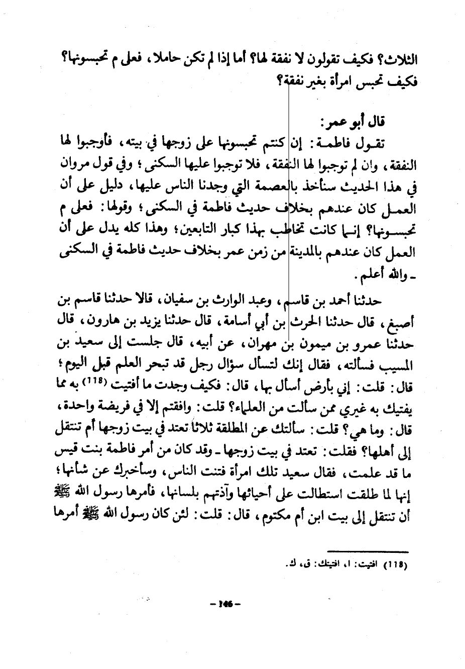 الثَّلَاثِ فَكَيْفَ تَقُولُونَ لَا نَفَقَةَ لَهَا أَمَّا إذا لم تكن حاملا فعلىم تَحْبِسُونَهَا فَكَيْفَ تُحْبَسُ امْرَأَةٌ بِغَيْرِ نَفَقَةٍ قَالَ أَبُو عُمَرَ تَقُولُ فَاطِمَةُ إِنْ كُنْتُمْ تَحْبِسُونَهَا عَلَى زَوْجِهَا فِي بَيْتِهِ فَأَوْجِبُوا لَهَا النَّفَقَةَ وَإِنْ لَمْ تُوجِبُوا لَهَا النَّفَقَةَ فَلَا تُوجِبُوا عَلَيْهَا السُّكْنَى وَفِي قَوْلِ مَرْوَانَ فِي هَذَا الْحَدِيثِ سَنَأْخُذُ بِالْعِصْمَةِ الَّتِي وَجَدْنَا النَّاسَ عَلَيْهَا دَلِيلٌ عَلَى أَنَّ الْعَمَلَ كَانَ عِنْدَهُمْ بِخِلَافِ حديث فاطمة في السكنى وقولها فعلىم تَحْبِسُونَهَا إِنَّمَا كَانَتْ تُخَاطِبُ بِهَذَا كِبَارَ التَّابِعِينَ وَهَذَا كُلُّهُ يَدُلُّ عَلَى أَنَّ الْعَمَلَ كَانَ عِنْدَهُمْ بِالْمَدِينَةِ مِنْ زَمَنِ عُمَرَ بِخِلَافِ حَدِيثِ فَاطِمَةَ فِي السُّكْنَى وَاللَّهُ أَعْلَمُ حَدَّثَنَا أَحْمَدُ بْنُ قَاسِمٍ وَعَبْدُ الْوَارِثِ بْنُ سُفْيَانَ قَالَا حَدَّثَنَا قَاسِمُ بْنُ أَصْبَغَ قَالَ حَدَّثَنَا الْحَرْثُ بْنُ أَبِي أُسَامَةَ قَالَ حَدَّثَنَا يَزِيدُ بْنُ هَارُونَ قَالَ حَدَّثَنَا عَمْرُو بْنُ مَيْمُونِ بْنِ مِهْرَانَ عَنْ أَبِيهِ قَالَ جَلَسْتُ إِلَى سَعِيدِ بْنِ الْمُسَيَّبِ فَسَأَلْتُهُ فَقَالَ إِنَّكَ لَتَسْأَلُ سُؤَالَ رَجُلٍ قَدْ تَبَحَّرَ الْعِلْمَ قَبْلَ الْيَوْمِ قَالَ قُلْتُ إِنِّي بِأَرْضٍ أُسْأَلُ بِهَا قَالَ فَكَيْفَ وَجَدْتَ مَا أَفْتَيْتُ بِهِ مِمَّا يُفْتِيكَ بِهِ غيري ممن سألت من العلماء قلت وافقتم إِلَّا فِي فَرِيضَةٍ وَاحِدَةٍ قَالَ وَمَا هِيَ قُلْتُ سَأَلْتُكَ عَنِ الْمُطَلَّقَةِ ثَلَاثًا تَعْتَدُّ فِي بَيْتِ زَوْجِهَا أَمْ تَنْتَقِلُ إِلَى أَهْلِهَا فَقُلْتَ تَعْتَدُّ فِي بَيْتِ زَوْجِهَا وَقَدْ كَانَ مِنْ أَمْرِ فَاطِمَةَ بِنْتِ قَيْسٍ مَا قَدْ عَلِمْتَ فَقَالَ سَعِيدٌ تِلْكَ امْرَأَةٌ فَتَنَتِ النَّاسَ وَسَأُخْبِرُكَ عَنْ شَأْنِهَا إِنَّهَا لَمَّا طُلِّقَتْ اسْتَطَالَتْ عَلَى أحيائها وَآذَتْهُمْ بِلِسَانِهَا فَأَمَرَهَا رَسُولُ اللَّهِ صَلَّى اللَّهُ عَلَيْهِ وَسَلَّمَ أَنْ تَنْتَقِلَ إِلَى بَيْتِ ابْنِ أُمِّ مَكْتُومٍ قَالَ قُلْتُ لَئِنْ كَانَ رَسُولُ اللَّهِ صَلَّى اللَّهُ عَلَيْهِ وَسَلَّمَ أَمَرَهَا
