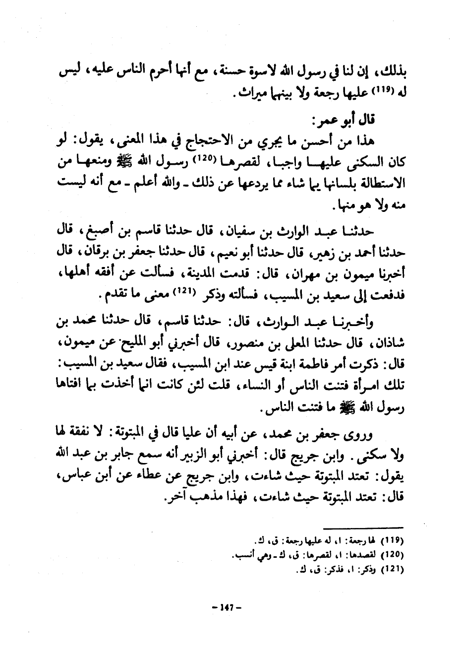 بِذَلِكَ إِنَّ لَنَا فِي رَسُولِ اللَّهِ لَأُسْوَةً حَسَنَةً مَعَ أَنَّهَا أَحْرَمُ النَّاسِ عَلَيْهِ لَيْسَ لَهُ عَلَيْهَا رَجْعَةٌ وَلَا بَيْنَهُمَا مِيرَاثٌ قَالَ أَبُو عُمَرَ هَذَا مِنْ أَحْسَنِ مَا يَجْرِي مِنْ الِاحْتِجَاجِ فِي هَذَا الْمَعْنَى يَقُولُ لَوْ كَانَ السُّكْنَى عَلَيْهَا وَاجِبًا لَقَصَرَهَا رَسُولُ اللَّهِ صَلَّى اللَّهُ عَلَيْهِ وَسَلَّمَ وَمَنَعَهَا مِنْ الِاسْتِطَالَةِ بِلِسَانِهَا بِمَا شَاءَ مِمَّا يَرْدَعُهَا عَنْ ذَلِكَ وَاللَّهُ أَعْلَمُ مَعَ أَنَّهُ لَيْسَتْ مِنْهُ وَلَا هُوَ مِنْهَا حَدَّثَنَا عَبْدُ الْوَارِثِ بْنُ سُفْيَانَ قَالَ حَدَّثَنَا قَاسِمُ بْنُ أَصْبَغَ قَالَ حَدَّثَنَا أَحْمَدُ بْنُ زُهَيْرٍ قَالَ حَدَّثَنَا أَبُو نُعَيْمٍ قَالَ حَدَّثَنَا جَعْفَرُ بْنُ بُرْقَانَ قَالَ أَخْبَرَنَا مَيْمُونِ بْنِ مِهْرَانَ قَالَ قَدِمْتُ الْمَدِينَةَ فَسَأَلْتُ عَنْ أَفْقَهِ أَهْلِهَا فَدُفِعْتُ إِلَى سَعِيدِ بْنِ الْمُسَيَّبِ فَسَأَلْتُهُ وَذَكَرَ مَعْنَى مَا تَقَدَّمَ وَأَخْبَرَنَا عَبْدُ الْوَارِثِ قَالَ حَدَّثَنَا قَاسِمٌ قَالَ حَدَّثَنَا مُحَمَّدُ بْنُ شَاذَانَ قَالَ حَدَّثَنَا الْمُعَلَّى بْنُ مَنْصُورٍ قَالَ أَخْبَرَنِي أَبُو الْمُلَيْحِ عَنْ مَيْمُونٍ قَالَ ذَكَرْتُ أَمْرَ فَاطِمَةَ ابْنَةِ قَيْسٍ عِنْدَ ابْنِ الْمُسَيَّبِ فَقَالَ سَعِيدُ بْنُ الْمُسَيَّبِ تِلْكَ امْرَأَةٌ فَتَنَتِ النَّاسَ أَوِ النِّسَاءَ قُلْتُ لَئِنْ كَانَتْ إِنَّمَا أَخَذَتْ بِمَا أَفْتَاهَا رَسُولُ اللَّهِ صَلَّى اللَّهُ عَلَيْهِ وَسَلَّمَ مَا فَتَنَتِ النَّاسَ وَرَوَى جَعْفَرُ بْنُ مُحَمَّدٍ عَنْ أَبِيهِ أَنَّ عَلِيًّا قَالَ فِي الْمَبْتُوتَةِ لَا نَفَقَةَ لَهَا وَلَا سُكْنَى وَابْنُ جُرَيْجٍ قَالَ أَخْبَرَنِي أَبُو الزُّبَيْرِ أَنَّهُ سَمِعَ جَابِرَ بْنَ عَبْدِ اللَّهِ يَقُولُ تَعْتَدُّ الْمَبْتُوتَةُ حَيْثُ شَاءَتْ وَابْنُ جُرَيْجٍ عَنْ عَطَاءٍ عَنِ ابْنِ عَبَّاسٍ قَالَ تَعْتَدُّ الْمَبْتُوتَةُ حَيْثُ شَاءَتْ فَهَذَا مَذْهَبٌ آخَرُ