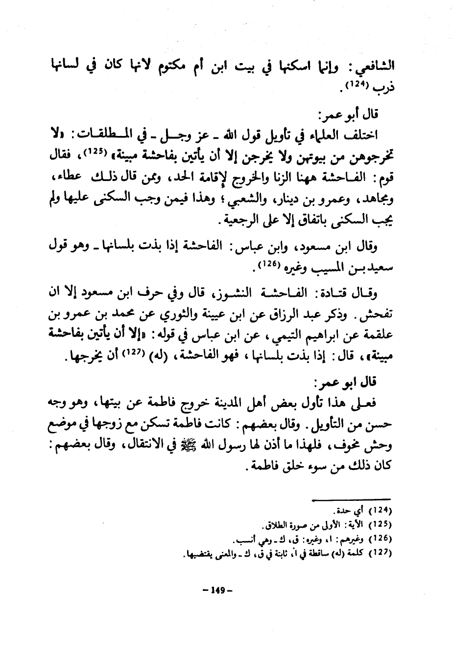 الشَّافِعِيُّ وَإِنَّمَا أَسْكَنَهَا فِي بَيْتِ ابْنِ أُمِّ مَكْتُومٍ لِأَنَّهَا كَانَ فِي لِسَانِهَا ذَرَبٌ قَالَ أَبُو عُمَرَ اخْتَلَفَ الْعُلَمَاءُ فِي تَأْوِيلِ قَوْلِ اللَّهِ عَزَّ وَجَلَّ فِي الْمُطْلِقَاتِ لَا تُخْرِجُوهُنَّ من بويتهن ولا يخرجن إلا أن يأتين بافحشة مبينة فقال قوم الفاحشة ههنا الزِّنَا وَالْخُرُوجُ لِإِقَامَةِ الْحَدِّ وَمِمَّنْ قَالَ ذَلِكَ عَطَاءٌ وَمُجَاهِدٌ وَعَمْرُو بْنُ دِينَارٍ وَالشَّعْبِيُّ وَهَذَا فِيمَنْ وَجَبَ السُّكْنَى عَلَيْهَا وَلَمْ يَجِبِ السُّكْنَى بِاتِّفَاقٍ إِلَّا عَلَى الرَّجْعِيَّةِ وَقَالَ ابْنُ مَسْعُودٍ وَابْنُ عَبَّاسٍ الْفَاحِشَةُ إِذَا بَذَتْ بِلِسَانِهَا وَهُوَ قَوْلُ سَعِيدِ بْنِ الْمُسَيَّبِ وَغَيْرِهِ وَقَالَ قَتَادَةُ الْفَاحِشَةُ النُّشُوزُ قَالَ وَفِي حَرْفِ ابْنِ مَسْعُودٍ إِلَّا أَنْ تُفْحِشَ وَذَكَرَ عَبْدُ الرَّزَّاقِ عَنِ ابْنِ عُيَيْنَةَ وَالثَّوْرِيِّ عَنْ مُحَمَّدِ بْنِ عَمْرِو بْنِ عَلْقَمَةَ عَنْ إِبْرَاهِيمَ التَّيْمِيِّ عَنِ ابْنِ عَبَّاسٍ فِي قَوْلِهِ إِلَّا أَنْ يَأْتِينَ بِفَاحِشَةٍ مُبَيِّنَةٍ قَالَ إِذَا بَذَتْ بِلِسَانِهَا فَهُوَ الْفَاحِشَةُ (لَهُ) أَنْ يُخْرِجَهَا قَالَ أَبُو عُمَرَ فَعَلَى هَذَا تَأَوَّلَ بَعْضُ أَهْلِ الْمَدِينَةِ خُرُوجَ فَاطِمَةَ عَنْ بَيْتِهَا وَهُوَ وَجْهٌ حَسَنٌ مِنَ التَّأْوِيلِ وَقَالَ بَعْضُهُمْ كَانَتْ فَاطِمَةُ تَسْكُنُ مَعَ زَوْجِهَا فِي مَوْضِعٍ وَحِشٍ مُخَوِّفٍ فَلِهَذَا مَا أَذِنَ لَهَا رَسُولُ اللَّهِ صَلَّى اللَّهُ عَلَيْهِ وَسَلَّمَ فِي الِانْتِقَالِ وَقَالَ بَعْضُهُمْ كَانَ ذَلِكَ مِنْ سُوءِ خُلُقِ فَاطِمَةَ