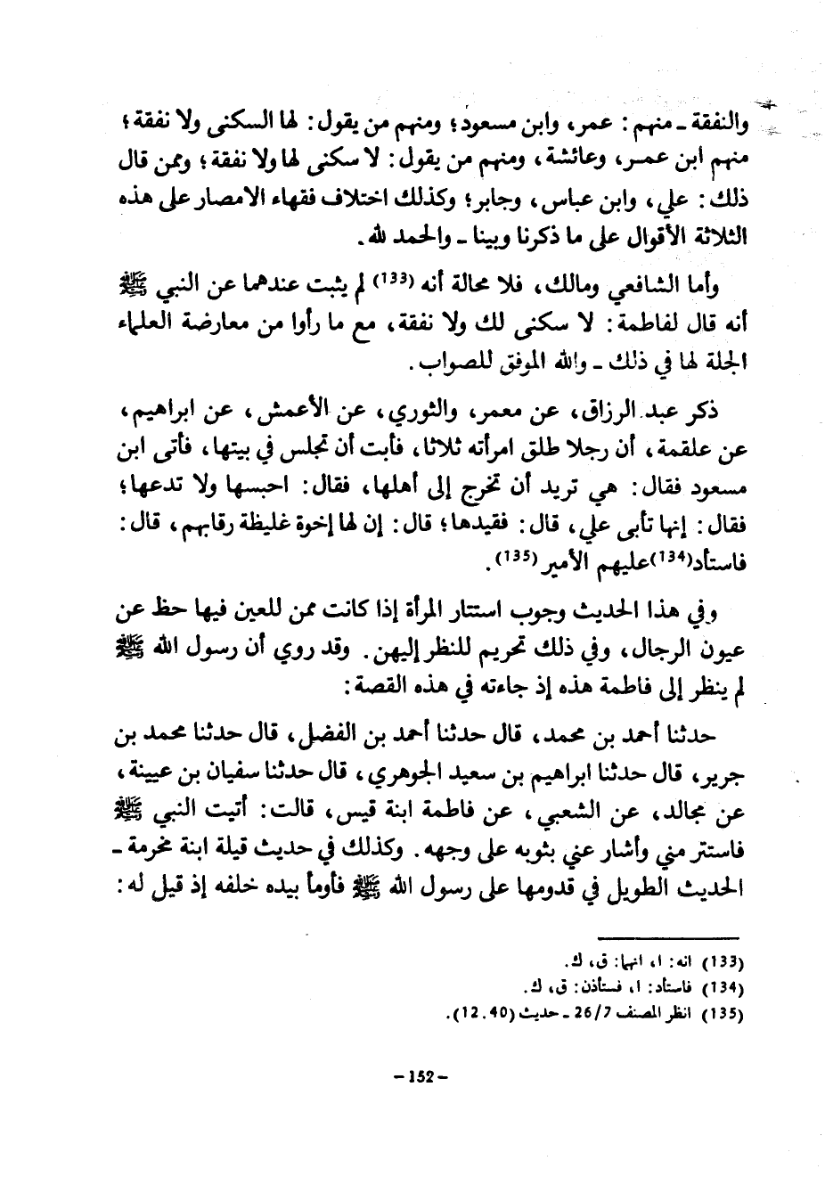 وَالنَّفَقَةُ مِنْهُمْ عُمَرُ وَابْنُ مَسْعُودٍ وَمِنْهُمْ مَنْ يَقُولُ لَهَا السُّكْنَى وَلَا نَفَقَةَ مِنْهُمْ ابْنُ عُمَرَ وَعَائِشَةُ وَمِنْهُمْ مَنْ يَقُولُ لَا سُكْنَى لَهَا وَلَا نَفَقَةَ وَمِمَّنْ قَالَ ذَلِكَ عَلِيٌّ وَابْنُ عَبَّاسٍ وَجَابِرٌ وَكَذَلِكَ اخْتِلَافُ فُقَهَاءِ الْأَمْصَارِ عَلَى هَذِهِ الثَّلَاثَةِ الْأَقْوَالِ عَلَى مَا ذَكَرْنَا وَبَيَّنَّا وَالْحَمْدُ لِلَّهِ وَأَمَّا الشَّافِعِيُّ وَمَالِكٌ فَلَا مَحَالَةَ أَنَّهُ لَمْ يَثْبُتْ عِنْدَهُمَا عَنِ النَّبِيِّ صَلَّى اللَّهُ عَلَيْهِ وَسَلَّمَ أَنَّهُ قَالَ لِفَاطِمَةَ لَا سُكْنَى لَكِ وَلَا نَفَقَةَ مَعَ مَا رَأَوْا مِنْ مُعَارَضَةِ الْعُلَمَاءِ الْجِلَّةِ لَهَا فِي ذَلِكَ وَاللَّهُ الْمُوَفِّقُ لِلصَّوَابِ ذَكَرَ عَبْدُ الرَّزَّاقِ عَنْ مَعْمَرٍ وَالثَّوْرِيُّ عَنِ الْأَعْمَشِ عَنْ إِبْرَاهِيمَ عَنْ عَلْقَمَةَ أَنَّ رَجُلًا طَلَّقَ امْرَأَتَهُ ثَلَاثًا فَأَبَتْ أَنْ تَجْلِسَ فِي بَيْتِهَا فَأَتَى ابْنَ مسعود فقال هي تريد تَخْرُجَ إِلَى أَهْلِهَا فَقَالَ احْبِسْهَا وَلَا تَدَعْهَا فَقَالَ إِنَّهَا تَأْبَى عَلَيَّ قَالَ فَقَيِّدْهَا قَالَ إِنَّ لَهَا إِخْوَةً غَلِيظَةً رِقَابُهِمْ قَالَ فَاسْتَأْدِ عَلَيْهِمُ الْأَمِيرَ وَفِي هَذَا الْحَدِيثِ وُجُوبُ اسْتِتَارِ الْمَرْأَةِ إِذَا كَانَتْ مِمَّنْ لِلْعَيْنِ فِيهَا حَظٌّ عن عيون الرجال وف ذَلِكَ تَحْرِيمٌ لِلنَّظَرِ إِلَيْهِنَّ وَقَدْ رُوِيَ أَنَّ رَسُولَ اللَّهِ صَلَّى اللَّهُ عَلَيْهِ وسلم لم يَنْظُرْ إِلَى فَاطِمَةَ هَذِهِ إِذْ جَاءَتْهُ فِي هَذِهِ الْقِصَّةِ حَدَّثَنَا أَحْمَدُ بْنُ مُحَمَّدٍ قَالَ حَدَّثَنَا أَحْمَدُ بْنُ الْفَضْلِ قَالَ حَدَّثَنَا مُحَمَّدُ بْنُ جَرِيرٍ قَالَ حَدَّثَنَا إِبْرَاهِيمُ بْنُ سَعِيدٍ الْجَوْهَرِيُّ قَالَ حَدَّثَنَا سُفْيَانُ بْنُ عُيَيْنَةَ عَنْ مُجَالِدٍ عَنِ الشَّعْبِيِّ عَنْ فَاطِمَةَ ابْنَةِ قَيْسٍ قَالَتْ أَتَيْتُ النَّبِيَّ صَلَّى اللَّهُ عَلَيْهِ وَسَلَّمَ فَاسْتَتَرَ مِنِّي وَأَشَارَ عَنِّي بِثَوْبِهِ عَلَى وَجْهِهِ وَكَذَلِكَ فِي حَدِيثِ قَيْلَةَ ابْنَةِ مَخْرَمَةَ الْحَدِيثَ الطَّوِيلِ فِي قُدُومِهَا عَلَى رَسُولِ اللَّهِ صَلَّى اللَّهُ عَلَيْهِ وَسَلَّمَ فَأَوْمَأَ بِيَدِهِ خَلْفَهُ إِذْ قيل له