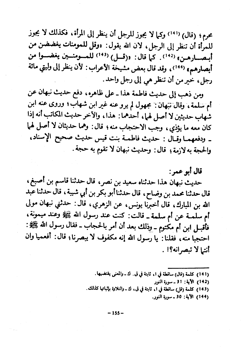 مَحْرَمٍ (قَالَ) وَكَمَا لَا يَجُوزُ لِلرَّجُلِ أَنْ يَنْظُرَ إِلَى الْمَرْأَةِ فَكَذَلِكَ لَا يَجُوزُ لِلْمَرْأَةِ أَنْ تَنْظُرَ إِلَى الرَّجُلِ لِأَنَّ اللَّهَ يَقُولُ وقل للمؤمنات يغضضن من أبصارهن كم قَالَ (قُلْ) لِلْمُؤْمِنِينَ يَغُضُّوا مِنْ أَبْصَارِهِمْ وَقَدْ قَالَ بَعْضُ مَشْيَخَةِ الْأَعْرَابِ لَأَنْ يَنْظُرَ إِلَى وَلِيَّتِي مِائَةُ رَجُلٍ خَيْرٌ مِنْ أَنْ تَنْظُرَ هِيَ إِلَى رَجُلٍ وَاحِدٍ وَمَنْ ذَهَبَ إِلَى حَدِيثِ فَاطِمَةَ هَذَا عَلَى ظَاهِرِهِ دَفَعَ حَدِيثَ نَبْهَانَ عَنْ أُمِّ سَلَمَةَ وَقَالَ نَبْهَانُ مَجْهُولٌ لَمْ يَرْوِ عَنْهُ غَيْرُ ابْنِ شِهَابٍ وَرَوَى عَنْهُ ابْنُ شِهَابٍ حَدِيثَيْنِ لَا أَصْلَ لَهُمَا أَحَدُهُمَا هَذَا وَالْآخَرُ حَدِيثُ الْمُكَاتِبِ أَنَّهُ إِذَا كَانَ مَعَهُ مَا يُؤْذِي وَجَبَ الِاحْتِجَابُ مِنْهُ قَالَ وَهُمَا حَدِيثَانِ لَا أَصْلَ لَهُمَا وَدَفَعَهُمَا وَقَالَ حَدِيثُ فَاطِمَةَ بِنْتِ قَيْسٍ حَدِيثٌ صَحِيحُ الْإِسْنَادِ وَالْحُجَّةُ بِهِ لَازِمَةٌ قَالَ وَحَدِيثُ نَبْهَانَ لَا تَقُومُ بِهِ حُجَّةٌ قَالَ أَبُو عُمَرَ حَدِيثُ نَبْهَانَ هَذَا حَدَّثَنَاهُ سَعِيدُ بْنُ نَصْرٍ قَالَ حَدَّثَنَا قَاسِمُ بْنُ أَصْبَغَ قَالَ حَدَّثَنَا مُحَمَّدُ بْنُ وَضَّاحٍ قَالَ حَدَّثَنَا أَبُو بَكْرِ بْنُ أَبِي شَيْبَةَ قَالَ حَدَّثَنَا عَبْدُ اللَّهِ بْنُ الْمُبَارَكِ قَالَ أَخْبَرَنَا يُونُسُ عَنِ الزُّهْرِيِّ قَالَ حَدَّثَنِي نَبْهَانُ مَوْلَى أُمِّ سَلَمَةَ عَنْ أُمِّ سَلَمَةَ قَالَتْ كُنْتُ عِنْدَ رَسُولِ اللَّهِ صَلَّى اللَّهُ عَلَيْهِ وَسَلَّمَ وَعِنْدَ مَيْمُونَةَ فَأَقْبَلَ ابْنُ أُمِّ مَكْتُومٍ وَذَلِكَ بَعْدَ أَنْ أُمِرَ بِالْحِجَابِ فَقَالَ رَسُولُ اللَّهِ صَلَّى اللَّهُ عَلَيْهِ وَسَلَّمَ احْتَجِبَا مِنْهُ فَقُلْنَا يَا رَسُولَ اللَّهِ إنه مكفوف لا يبصرنا قال أفعيماوان أَنْتُمَا لَا تُبْصِرَانِهِ