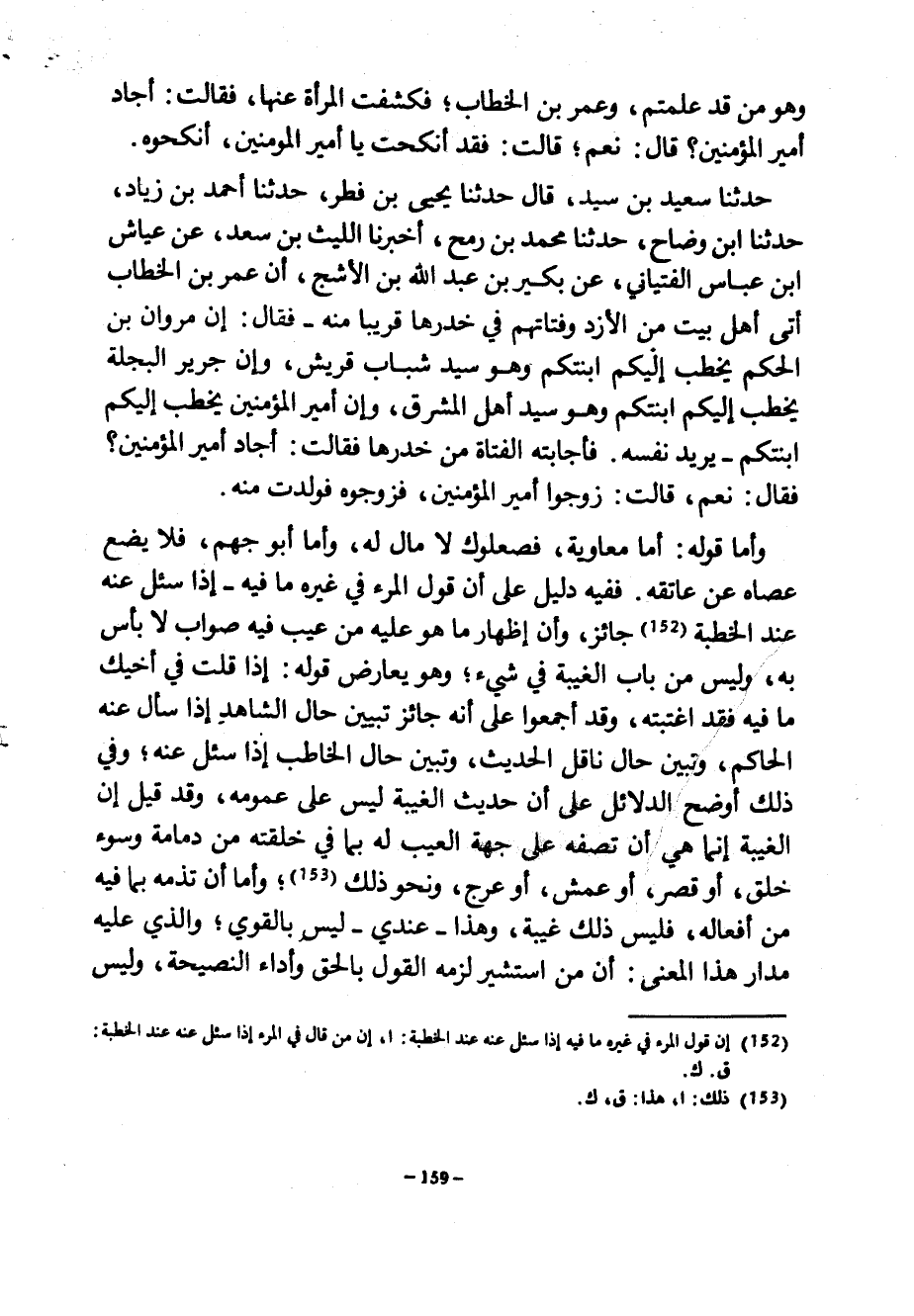 وَهُوَ مَنْ قَدْ عَلِمْتُمْ وَعُمَرُ بْنُ الْخَطَّابِ فكشفت المرأة عنها فقالت أجاد أمير المؤمنين قَالَ نَعَمْ قَالَتْ فَقَدْ أُنْكِحْتَ يَا أَمِيرَ المؤمنين أَنْكِحُوهُ حَدَّثَنَا سَعِيدُ بْنُ سَيِّدٍ قَالَ حَدَّثَنَا يَحْيَى بْنُ فِطْرٍ حَدَّثَنَا أَحْمَدُ بْنُ زِيَادٍ حَدَّثَنَا ابْنُ وَضَّاحٍ حَدَّثَنَا مُحَمَّدُ بْنُ رُمْحٍ أخبرنا الليث بن سعد عن عياش ابن عَبَّاسٍ الْفِتْيَانِيِّ عَنْ بُكَيْرِ بْنِ عَبْدِ اللَّهِ بْنِ الْأَشَجِّ أَنَّ عُمَرَ بْنَ الْخَطَّابِ أَتَى أَهْلَ بَيْتٍ مِنَ الْأَزْدِ وَفَتَاتُهُمْ فِي خِدْرِهَا قَرِيبًا مِنْهُ فَقَالَ إِنَّ مَرْوَانَ بْنَ الْحَكَمِ يَخْطُبُ إِلَيْكُمُ ابْنَتَكُمْ وَهُوَ سَيِّدُ شَبَابِ قُرَيْشٍ وَإِنَّ جَرِيرَ الْبَجْلَةِ يَخْطُبُ إِلَيْكُمُ ابْنَتَكُمْ وَهُوَ سيد أهل المشرق وإن أمير المؤمنين يَخْطُبُ إِلَيْكُمُ ابْنَتَكُمْ يُرِيدُ نَفْسَهُ فَأَجَابَتْهُ الْفَتَاةُ من خدرها فقالت أجاد امير المؤمنين فَقَالَ نَعَمْ قَالَتْ زَوِّجُوا أَمِيرَ الْمُؤْمِنِينَ فَزَوَّجُوهُ فولدت منه وأما قوله أما معاوية فصلعوك لا مال له وأما أبو جهم فلايضع عَصَاهُ عَنْ عَاتِقِهِ فَفِيهِ دَلِيلٌ عَلَى أَنَّ قَوْلَ الْمَرْءِ فِي غَيْرِهِ مَا فِيهِ إِذَا سُئِلَ عَنْهُ عِنْدَ الْخِطْبَةِ جَائِزٌ وَأَنَّ إِظْهَارَ مَا هُوَ عَلَيْهِ مِنْ عَيْبٍ فِيهِ صَوَابٌ لَا بَأْسَ بِهِ وَلَيْسَ مِنْ بَابِ الْغَيْبَةِ فِي شَيْءٍ وَهُوَ يُعَارِضُ قَوْلَهُ إِذَا قُلْتَ فِي أَخِيكَ مَا فِيهِ فَقَدِ اغْتَبْتَهُ وَقَدْ أَجْمَعُوا عَلَى أَنَّهُ جَائِزٌ تَبْيِينُ حَالِ الشَّاهِدِ إِذَا سَأَلَ عَنْهُ الْحَاكِمُ وَتَبَيُّنُ حَالِ نَاقِلِ الْحَدِيثِ وَتَبَيُّنُ حَالِ الْخَاطِبِ إِذَا سُئِلَ عَنْهُ وَفِي ذَلِكَ أَوْضَحُ الدَّلَائِلِ عَلَى أَنَّ حَدِيثَ الْغَيْبَةِ لَيْسَ عَلَى عُمُومِهِ وَقَدْ قِيلَ إِنَّ الْغَيْبَةَ إِنَّمَا هِيَ أَنْ تَصِفَهُ عَلَى جِهَةِ الْعَيْبِ لَهُ بِمَا فِي خِلْقَتِهِ مِنْ دَمَامَةٍ وَسُوءِ خُلُقٍ أَوْ قِصَرٍ أَوْ عَمَشٍ أَوْ عَرَجٍ وَنَحْوِ ذَلِكَ وَأَمَّا أَنْ تَذُمَّهُ بِمَا فِيهِ مِنْ أَفْعَالِهِ فَلَيْسَ ذَلِكَ غَيْبَةً وَهَذَا عِنْدِي لَيْسَ بِالْقَوِيِّ وَالَّذِي عَلَيْهِ مَدَارُ هَذَا الْمَعْنَى أَنَّ مَنِ اسْتُشِيرَ لَزِمَهُ الْقَوْلُ بِالْحَقِّ وَأَدَاءُ النَّصِيحَةِ وَلَيْسَ