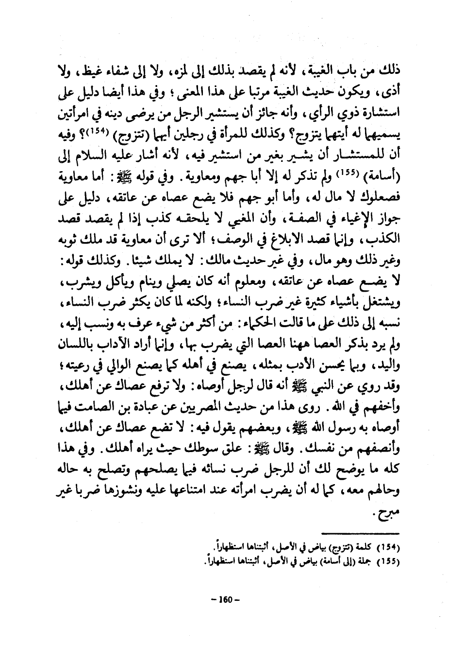 ذَلِكَ مِنْ بَابِ الْغَيْبَةِ لِأَنَّهُ لَمْ يَقْصِدْ بِذَلِكَ إِلَى لَمْزِهِ وَلَا إِلَى شِفَاءِ غَيْظٍ وَلَا أَذًى وَيَكُونُ حَدِيثُ الْغَيْبَةِ مُرَتَّبًا عَلَى هَذَا الْمَعْنَى وَفِي هَذَا أَيْضًا دَلِيلٌ عَلَى اسْتِشَارَةِ ذَوِي الرَّأْيِ وَأَنَّهُ جَائِزٌ أَنْ يَسْتَشِيرَ الرَّجُلُ مَنْ يَرْضَى دِينَهُ فِي امْرَأَتَيْنِ يُسَمِّيهِمَا لَهُ أَيَّتَهُمَا يَتَزَوَّجُ وَكَذَلِكَ لِلْمَرْأَةِ فِي رَجُلَيْنِ أَيَّهُمَا (تَتَزَوَّجُ) وَفِيهِ أَنَّ لِلْمُسْتَشَارِ أَنْ يُشِيرَ بِغَيْرِ مَنِ اسْتُشِيرَ فِيهِ لِأَنَّهُ أَشَارَ عَلَيْهِ السَّلَامُ إِلَى (أُسَامَةَ) وَلَمْ تَذْكُرْ لَهُ إِلَّا أَبَا جَهْمٍ وَمُعَاوِيَةَ وَفِي قَوْلِهِ صَلَّى اللَّهُ عليه وسلم أما معاوية فصلعوك لَا مَالَ لَهُ وَأَمَّا أَبُو جَهْمٍ فَلَا يَضَعُ عَصَاهُ عَنْ عَاتِقِهِ دَلِيلٌ عَلَى جَوَازِ الْإِغْيَاءِ فِي الصِّفَةِ وَأَنَّ الْمُغَيِّيَ لَا يَلْحَقُهُ كَذِبٌ إِذَا لَمْ يَقْصِدْ قَصْدَ الْكَذِبِ وَإِنَّمَا قَصَدَ الْإِبْلَاغَ فِي الْوَصْفِ أَلَا تَرَى أَنَّ مُعَاوِيَةَ قَدْ مَلَكَ ثَوْبَهُ وَغَيْرَ ذَلِكَ وَهُوَ مَالٌ وَفِي غَيْرِ حَدِيثِ مَالِكٍ لَا يَمْلِكُ شَيْئًا وَكَذَلِكَ قَوْلُهُ لَا يَضَعُ عَصَاهُ عَنْ عَاتِقِهِ وَمَعْلُومٌ أَنَّهُ كَانَ يُصَلِّي وَيَنَامُ وَيَأْكُلُ وَيَشْرَبُ وَيَشْتَغِلُ بِأَشْيَاءَ كَثِيرَةٍ غَيْرِ ضَرْبِ النِّسَاءِ وَلَكِنَّهُ لَمَّا كَانَ يُكْثِرُ ضَرْبَ النِّسَاءِ نَسَبَهُ إِلَى ذَلِكَ عَلَى مَا قَالَتِ الْحُكَمَاءُ مَنْ أَكْثَرَ مِنْ شَيْءٍ عُرِفَ بِهِ وَنُسِبَ إِلَيْهِ ولم يرد بذكر العصا ههنا الْعَصَا الَّتِي يُضْرَبُ بِهَا وَإِنَّمَا أَرَادَ الْآدَابَ بِاللِّسَانِ وَالْيَدِ وَبِمَا يَحْسُنُ الْأَدَبُ بِمِثْلِهِ يَصْنَعُ فِي أَهْلِهِ كَمَا يَصْنَعُ الْوَالِي فِي رَعِيَّتِهِ وَقَدْ رُوِيَ عَنِ النَّبِيِّ صَلَّى اللَّهُ عَلَيْهِ وَسَلَّمَ أَنَّهُ قَالَ لِرَجُلٍ أَوْصَاهُ وَلَا تَرْفَعْ عصاك عن أهلك وأخفهم في الله رورى هذا من حيدث الْمِصْرِيِّينَ عَنْ عُبَادَةَ بْنِ الصَّامِتِ فِيمَا أَوْصَاهُ بِهِ رَسُولُ اللَّهِ صَلَّى اللَّهُ عَلَيْهِ وَسَلَّمَ وبعضهم يقول فيه لاتضع عَصَاكَ عَنْ أَهْلِكَ وَأَنْصِفْهُمْ مِنْ نَفْسِكَ وَقَالَ صَلَّى اللَّهُ عَلَيْهِ وَسَلَّمَ عَلِّقْ سَوْطَكَ حَيْثُ يَرَاهُ أَهْلُكَ وَفِي هَذَا كُلِّهِ مَا يُوَضِّحُ لَكَ أَنَّ لِلرَّجُلِ ضَرْبَ نِسَائِهِ فِيمَا يُصْلِحُهُمْ وَتَصْلُحُ بِهِ حَالُهُ وَحَالُهُمْ مَعَهُ كَمَا لَهُ أَنْ يَضْرِبَ امْرَأَتَهُ عِنْدَ امْتِنَاعِهَا عَلَيْهِ وَنُشُوزِهَا ضَرْبًا غَيْرَ مُبَرِّحٍ