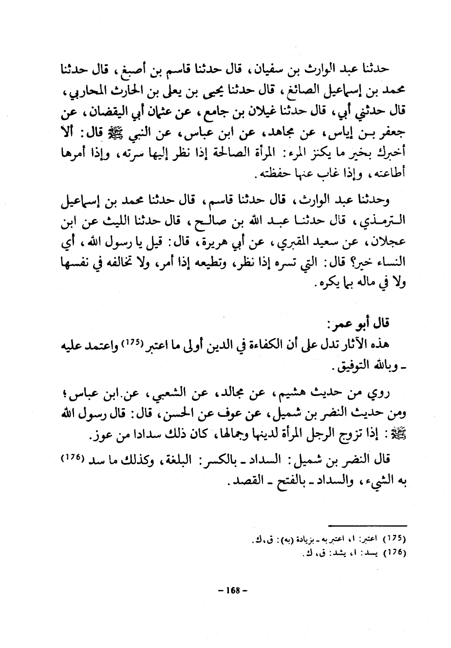 حَدَّثَنَا عَبْدُ الْوَارِثِ بْنُ سُفْيَانَ قَالَ حَدَّثَنَا قَاسِمُ بْنُ أَصْبَغَ قَالَ حَدَّثَنَا مُحَمَّدُ بْنُ إِسْمَاعِيلَ الصَّائِغُ قَالَ حَدَّثَنَا يَحْيَى بْنُ يَعْلَى بْنِ الْحَارِثِ الْمُحَارِبِيُّ قَالَ حَدَّثَنِي أَبِي قَالَ حَدَّثَنَا غَيْلَانُ بْنُ جَامِعٍ عَنْ عُثْمَانَ أَبِي الْيَقْضَانِ عَنْ جَعْفَرِ بْنِ إِيَاسٍ عَنْ مُجَاهِدٍ عَنِ ابْنِ عَبَّاسٍ عَنِ النَّبِيِّ صَلَّى اللَّهُ عَلَيْهِ وَسَلَّمَ قَالَ أَلَا أُخْبِرُكَ بِخَيْرِ مَا يَكْنِزُ الْمَرْءُ الْمَرْأَةُ الصَّالِحَةُ إِذَا نَظَرَ إِلَيْهَا سَرَّتْهُ وَإِذَا أَمَرَهَا أَطَاعَتْهُ وَإِذَا غَابَ عَنْهَا حَفِظَتْهُ وَحَدَّثَنَا عَبْدُ الْوَارِثِ قَالَ حَدَّثَنَا قَاسِمٌ قَالَ حدثنا محمد بن عيال التِّرْمِذِيُّ قَالَ حَدَّثَنَا عَبْدُ اللَّهِ بْنُ صَالِحٍ قَالَ حَدَّثَنَا اللَّيْثُ عَنِ ابْنِ عَجْلَانَ عَنْ سَعِيدٍ الْمَقْبُرِيِّ عَنْ أَبِي هُرَيْرَةَ قَالَ قِيلَ يَا رَسُولَ اللَّهِ أَيُّ النِّسَاءِ خَيْرٌ قَالَ الَّتِي تَسُرُّهُ إِذَا نَظَرَ وَتُطِيعُهُ إِذَا أَمَرَ وَلَا تُخَالِفُهُ فِي نَفْسِهَا وَلَا فِي مَالِهِ بِمَا يَكْرَهُ قَالَ أَبُو عُمَرَ هَذِهِ الْآثَارُ تَدُلُّ عَلَى أَنَّ الْكَفَاءَةَ فِي الدِّينِ أَوْلَى مَا اعْتُبِرَ وَاعْتُمِدَ عَلَيْهِ وَبِاللَّهِ التَّوْفِيقُ رُوِيَ مِنْ حَدِيثِ هُشَيْمٍ عَنْ مُجَالِدٍ عَنِ الشَّعْبِيِّ عَنِ ابْنِ عَبَّاسٍ وَمِنْ حَدِيثِ النَّضْرِ بْنِ شُمَيْلٍ عَنْ عَوْفٍ عَنِ الْحَسَنِ قَالَ قَالَ رَسُولُ اللَّهِ صَلَّى اللَّهُ عَلَيْهِ وسلم إذا تَزَوَّجَ الرَّجُلُ الْمَرْأَةَ لِدِينِهَا وَجِمَالِهَا كَانَ ذَلِكَ سِدَادًا مِنْ عَوَزٍ قَالَ النَّضْرُ بْنُ شُمَيْلٍ السِّدَادُ بِالْكَسْرِ الْبُلْغَةُ وَكَذَلِكَ مَا سُدَّ بِهِ الشَّيْءُ وَالسَّدَادُ بِالْفَتْحِ الْقَصْدُ