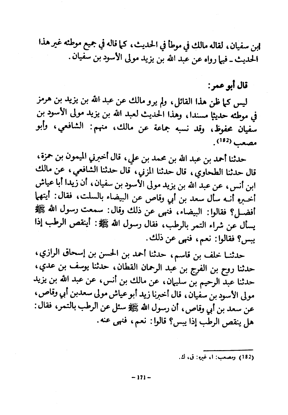 ابن سفيان لقاله مالك في موطأ فِي الْحَدِيثِ كَمَا قَالَهُ فِي جَمِيعِ مُوَطَّئِهِ غَيْرَ هَذَا الْحَدِيثِ فِيمَا رَوَاهُ عَنْ عَبْدِ اللَّهِ بْنِ يَزِيدَ مَوْلَى الْأَسْوَدِ بْنِ سفيان قَالَ أَبُو عُمَرَ لَيْسَ كَمَا ظَنَّ هَذَا الْقَائِلُ وَلَمْ يَرْوِ مَالِكٌ عَنْ عَبْدِ اللَّهِ بْنِ يَزِيدَ بْنِ هُرْمُزَ فِي مُوَطَّئِهِ حَدِيثًا مُسْنَدًا وَهَذَا الْحَدِيثُ لِعَبْدِ اللَّهِ بْنِ يَزِيدَ مَوْلَى الْأَسْوَدِ بْنِ سُفْيَانَ مَحْفُوظٌ وَقَدْ نَسَبَهُ جماعة من مَالِكٍ مِنْهُمُ الشَّافِعِيُّ وَأَبُو مُصْعَبٍ حَدَّثَنَا أَحْمَدُ بْنُ عَبْدِ اللَّهِ بْنِ مُحَمَّدِ بْنِ عَلِيٍّ قَالَ أَخْبَرَنِي الْمَيْمُونُ بْنُ حَمْزَةَ قَالَ حَدَّثَنَا الطَّحَاوِيُّ قَالَ حَدَّثَنَا الْمُزَنِيُّ قَالَ حَدَّثَنَا الشَّافِعِيُّ عن مالك ابن أَنَسٍ عَنْ عَبْدِ اللَّهِ بْنِ يَزِيدَ مَوْلَى الْأَسْوَدِ بْنِ سُفْيَانَ أَنَّ زَيْدًا أَبَا عَيَّاشٍ أَخْبَرَهُ أَنَّهُ سَأَلَ سَعْدَ بْنَ أَبِي وَقَّاصٍ عَنِ الْبَيْضَاءِ بِالسُّلْتِ فَقَالَ أَيَّتُهُمَا أَفْضَلُ فَقَالُوا الْبَيْضَاءُ فَنَهَى عَنْ ذَلِكَ وَقَالَ سَمِعْتُ رَسُولَ الله صلى الله عليه وسلم يسأل عن شِرَاءِ التَّمْرِ بِالرُّطَبِ فَقَالَ رَسُولُ اللَّهِ صَلَّى اللَّهُ عَلَيْهِ وَسَلَّمَ أَيَنْقُصُ الرُّطَبُ إِذَا يَبِسَ فَقَالُوا نَعَمْ فَنَهَى عَنْ ذَلِكَ حَدَّثَنَا خَلَفُ بْنُ قَاسِمٍ حَدَّثَنَا أَحْمَدُ بْنُ الْحَسَنِ بْنِ إِسْحَاقَ الرَّازِيُّ حَدَّثَنَا رَوْحُ بْنُ الْفَرَجِ بْنِ عبد الرحمان الْقَطَّانُ حَدَّثَنَا يُوسُفُ بْنُ عَدِيٍّ حَدَّثَنَا عَبْدُ الرَّحِيمِ بْنُ سُلَيْمَانَ عَنْ مَالِكِ بْنِ أَنَسٍ عَنْ عَبْدِ اللَّهِ بْنِ يَزِيدَ مَوْلَى الْأَسْوَدِ بْنِ سُفْيَانَ قَالَ أَخْبَرَنَا زَيْدٌ أَبُو عَيَّاشٍ مَوْلَى سَعْدِ بْنِ أَبِي وَقَّاصٍ عَنْ سَعْدِ بْنِ أَبِي وَقَّاصٍ أَنَّ رَسُولَ اللَّهِ صَلَّى اللَّهُ عَلَيْهِ وَسَلَّمَ سُئِلَ عَنِ الرُّطَبِ بِالتَّمْرِ فَقَالَ هَلْ يَنْقُصُ الرُّطَبُ إِذَا يَبِسَ قَالُوا نَعَمْ فَنَهَى عَنْهُ