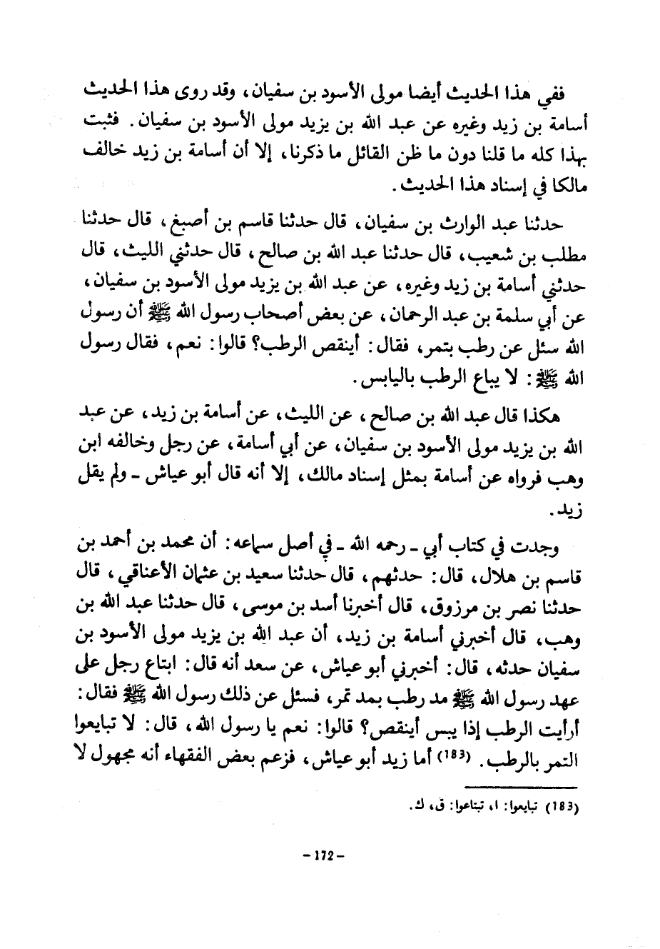 فَفِي هَذَا الْحَدِيثِ أَيْضًا مَوْلَى الْأَسْوَدِ بْنِ سُفْيَانَ وَقَدْ رَوَى هَذَا الْحَدِيثَ أُسَامَةُ بْنُ زَيْدٍ وَغَيْرُهُ عَنْ عَبْدِ اللَّهِ بْنِ يَزِيدَ مَوْلَى الْأَسْوَدِ بْنِ سُفْيَانَ فَثَبَتَ بِهَذَا كُلِّهِ مَا قُلْنَا دُونَ مَا ظَنَّ الْقَائِلُ مَا ذَكَرْنَا إِلَّا أَنَّ أُسَامَةَ بْنَ زَيْدٍ خَالَفَ مَالِكًا فِي إِسْنَادِ هَذَا الْحَدِيثِ حَدَّثَنَا عَبْدُ الْوَارِثِ بْنُ سُفْيَانَ قَالَ حَدَّثَنَا قَاسِمُ بْنُ أَصْبَغَ قَالَ حَدَّثَنَا مُطَّلِبُ بْنُ شُعَيْبٍ قَالَ حَدَّثَنَا عَبْدُ اللَّهِ بْنُ صَالِحٍ قَالَ حَدَّثَنِي اللَّيْثُ قَالَ حَدَّثَنِي أُسَامَةُ بْنُ زَيْدٍ وَغَيْرُهُ عَنْ عَبْدِ اللَّهِ بْنِ يَزِيدَ مَوْلَى الْأَسْوَدِ بْنِ سُفْيَانَ عَنْ أَبِي سَلَمَةَ بْنِ عَبْدِ الرحمان عَنْ بَعْضُ أَصْحَابِ رَسُولِ اللَّهِ صَلَّى اللَّهُ عَلَيْهِ وَسَلَّمَ أَنَّ رَسُولَ اللَّهِ سُئِلَ عَنْ رُطَبٍ بِتَمْرٍ فَقَالَ أَيَنْقُصُ الرُّطَبُ قَالُوا نَعَمْ فَقَالَ رَسُولُ اللَّهِ صَلَّى اللَّهُ عَلَيْهِ وَسَلَّمَ لَا يُبَاعُ الرَّطْبُ بِالْيَابِسِ هَكَذَا قَالَ عَبْدِ اللَّهِ بْنِ صَالِحٍ عَنِ اللَّيْثِ عَنْ أُسَامَةَ بْنِ زَيْدٍ عَنْ عَبْدِ اللَّهِ بْنِ يَزِيدَ مَوْلَى الْأَسْوَدِ بْنِ سُفْيَانَ عَنْ أَبِي أُسَامَةَ عَنْ رَجُلٍ وَخَالَفَهُ ابْنُ وَهْبٍ فَرَوَاهُ عَنْ أُسَامَةَ بِمِثْلِ إِسْنَادِ مَالِكٍ إِلَّا أَنَّهُ قَالَ أَبُو عَيَّاشٍ وَلَمْ يَقُلْ زَيْدٌ وَجَدْتُ فِي كِتَابِ أَبِي رَحِمَهُ اللَّهُ فِي أَصْلِ سَمَاعِهِ أَنَّ مُحَمَّدَ بْنَ أَحْمَدَ بْنِ قَاسِمِ بْنِ هِلَالٍ قَالَ حَدَّثَهُمْ قَالَ حَدَّثَنَا سَعِيدُ بْنُ عثمان العناقي قَالَ حَدَّثَنَا نَصْرُ بْنُ مَرْزُوقٍ قَالَ أَخْبَرَنَا أَسَدُ بْنُ مُوسَى قَالَ حَدَّثَنَا عَبْدُ اللَّهِ بْنُ وَهْبٍ قَالَ أَخْبَرَنِي أُسَامَةُ بْنُ زَيْدٍ أَنَّ عَبْدِ اللَّهِ بْنِ يَزِيدَ مَوْلَى الْأَسْوَدِ بْنِ سُفْيَانَ حَدَّثَهُ قَالَ أَخْبَرَنِي أَبُو عَيَّاشٍ عَنْ سَعْدٍ أَنَّهُ قَالَ ابْتَاعَ رَجُلٌ عَلَى عَهْدِ رَسُولِ اللَّهِ صَلَّى اللَّهُ عَلَيْهِ وسلم مُدَّ رُطَبٍ بِمُدِّ تَمْرٍ فَسُئِلَ عَنْ ذَلِكَ رَسُولَ اللَّهِ صَلَّى اللَّهُ عَلَيْهِ وَسَلَّمَ فقال أَرَأَيْتَ الرُّطَبَ إِذَا يَبِسَ أَيَنْقُصُ قَالُوا نَعَمْ يَا رَسُولَ اللَّهِ قَالَ لَا تَبَايَعُوا التَّمْرَ بِالرُّطَبِ أَمَّا زَيْدٌ أَبُو عَيَّاشٍ فَزَعَمَ بَعْضُ الْفُقَهَاءِ أَنَّهُ مَجْهُولٌ لَا