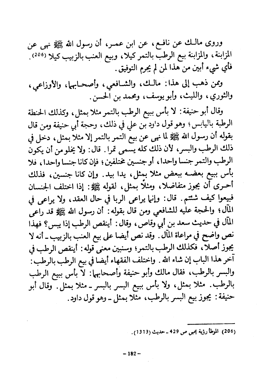 وَرَوَى مَالِكٌ عَنْ نَافِعٍ عَنِ ابْنِ عُمَرَ أن رَسُولَ اللَّهِ صَلَّى اللَّهُ عَلَيْهِ وَسَلَّمَ نَهَى عَنِ الْمُزَابَنَةِ وَالْمُزَابَنَةُ بَيْعُ الرُّطَبِ بِالتَّمْرِ كَيْلًا وَبَيْعُ الْعِنَبِ بِالزَّبِيبِ كَيْلًا فَأَيُّ شَيْءٍ أَبْيَنُ مِنْ هَذَا لِمَنْ لَمْ يُحْرَمِ التَّوْفِيقَ وَمِمَّنْ ذَهَبَ إِلَى هَذَا مَالِكٌ وَالشَّافِعِيُّ وَأَصْحَابُهُمَا وَالْأَوْزَاعِيُّ وَالثَّوْرِيُّ وَاللَّيْثُ وَأَبُو يُوسُفَ وَمُحَمَّدُ بْنُ الْحَسَنِ وَقَالَ أَبُو حَنِيفَةَ لَا بَأْسَ بِبَيْعِ الرُّطَبِ بِالتَّمْرِ مِثْلًا بِمِثْلٍ وَكَذَلِكَ الْحِنْطَةُ الرَّطْبَةُ بِالْيَابِسِ وَهُوَ قَوْلُ دَاوُدَ بْنِ عَلِيٍّ فِي ذَلِكَ وَحُجَّةُ أَبِي حَنِيفَةَ وَمَنْ قَالَ بِقَوْلِهِ أَنَّ رَسُولَ اللَّهِ صَلَّى اللَّهُ عَلَيْهِ وسلم لَمَّا نَهَى عَنْ بَيْعِ التَّمْرِ بِالتَّمْرِ إِلَّا مِثْلًا بِمِثْلٍ دَخَلَ فِي ذَلِكَ الرُّطَبُ وَالْبُسْرُ لِأَنَّ ذَلِكَ كُلَّهُ يُسَمَّى تَمْرًا قَالَ وَلَا يَخْلُو مِنْ أَنْ يَكُونَ الرُّطَبُ وَالتَّمْرُ جِنْسًا وَاحِدًا أَوْ جِنْسَيْنِ مُخْتَلِفَيْنِ فَإِنْ كَانَا جِنْسًا وَاحِدًا فَلَا بَأْسَ بِبَيْعِ بَعْضِهِ بِبَعْضٍ مِثْلًا بِمِثْلٍ يَدًا بِيَدٍ وَإِنْ كَانَا جِنْسَيْنِ فَذَلِكَ أحرى أن يجوز متفضالا وَمِثْلًا بِمِثْلٍ لِقَوْلِهِ صَلَّى اللَّهُ عَلَيْهِ وَسَلَّمَ إِذَا اخْتَلَفَ الْجِنْسَانِ فَبِيعُوا كَيْفَ شِئْتُمْ قَالَ وَإِنَّمَا يُرَاعَى الرِّبَا فِي حَالِ الْعَقْدِ وَلَا يُرَاعَى فِي الْمَآلِ وَالْحُجَّةُ عَلَيْهِ لِلشَّافِعِيِّ وَمَنْ قَالَ بِقَوْلِهِ أَنَّ رَسُولَ اللَّهِ صَلَّى اللَّهُ عَلَيْهِ وَسَلَّمَ قَدْ رَاعَى الْمَآلَ فِي حَدِيثِ سَعْدِ بْنِ أَبِي وَقَّاصٍ وَقَالَ أَيَنْقُصُ الرُّطَبُ إِذَا يَبِسَ فَهَذَا نَصٌّ وَاضِحٌ فِي مُرَاعَاةِ الما وَقَدْ نَصَّ أَيْضًا عَلَى بَيْعِ الْعِنَبِ بِالزَّبِيبِ أَنَّهُ لَا يَجُوزُ أَصْلًا فَكَذَلِكَ الرُّطَبُ بِالتَّمْرِ وَسَنُبَيِّنُ مَعْنَى قَوْلِهِ أَيَنْقُصُ الرُّطَبُ فِي آخِرِ هَذَا الْبَابِ إِنْ شَاءَ اللَّهُ وَاخْتَلَفَ الْفُقَهَاءُ أَيْضًا فِي بَيْعِ الرُّطَبِ بِالرُّطَبِ وَالْبُسْرِ بِالرُّطَبِ فَقَالَ مَالِكٌ وَأَبُو حَنِيفَةَ وَأَصْحَابُهُمَا لَا بَأْسَ بِبَيْعِ الرُّطَبِ بِالرُّطَبِ مِثْلًا بِمِثْلٍ وَلَا بَأْسَ بِبَيْعِ الْبُسْرِ بِالْبُسْرِ مِثْلًا بِمِثْلٍ وَقَالَ أَبُو حَنِيفَةَ يَجُوزُ بَيْعُ الْبُسْرِ بِالرُّطَبِ مِثْلًا بِمِثْلٍ وَهُوَ قَوْلُ دَاوُدَ