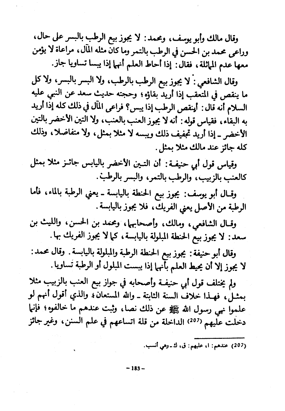 وَقَالَ مَالِكٌ وَأَبُو يُوسُفَ وَمُحَمَّدٌ لَا يَجُوزُ بَيْعُ الرُّطَبِ بِالْبُسْرِ عَلَى حَالٍ وَرَاعَى مُحَمَّدُ بْنُ الْحَسَنِ فِي الرُّطَبِ بِالتَّمْرِ وَمَا كَانَ مِثْلَهُ الْمَآلَ مُرَاعَاةً لَا يُؤْمَنُ مَعَهَا عَدَمُ الْمُمَاثَلَةِ فَقَالَ إِذَا أَحَاطَ الْعِلْمُ أَنَّهُمَا إِذَا يَبِسَا تَسَاوَيَا جَازَ وَقَالَ الشَّافِعِيُّ لَا يَجُوزُ بَيْعُ الرُّطَبِ بِالرُّطَبِ وَلَا الْبُسْرِ بِالْبُسْرِ وَلَا كُلِّ مَا يَنْقُصُ فِي الْمُتَعَقَّبِ إِذَا أُرِيدَ بَقَاؤُهُ وَحُجَّتُهُ حَدِيثُ سَعْدٍ عَنِ النَّبِيِّ عَلَيْهِ السَّلَامُ أَنَّهُ قَالَ أَيُنْقُصُ الرُّطَبُ إِذَا يَبِسَ فَرَاعَى الْمَآلَ فِي ذَلِكَ كُلِّهِ إِذَا أُرِيدَ بِهِ الْبَقَاءُ فَقِيَاسُ قَوْلِهِ أَنَّهُ لَا يَجُوزُ الْعِنَبُ بِالْعِنَبِ وَلَا التِّينُ الْأَخْضَرُ بِالتِّينِ الْأَخْضَرِ إِذَا أُرِيدَ تَجْفِيفُ ذَلِكَ وَيُبْسُهُ لَا مِثْلًا بِمِثْلٍ وَلَا مُتَفَاضِلًا وَذَلِكَ كُلُّهُ جَائِزٌ عِنْدَ مَالِكٍ مِثْلًا بِمِثْلٍ وَقِيَاسُ قَوْلِ أَبِي حَنِيفَةَ أَنَّ التِّينَ الْأَخْضَرَ بِالْيَابِسِ جَائِزٌ مِثْلًا بِمِثْلٍ كَالْعِنَبِ بِالزَّبِيبِ وَالرُّطَبِ بِالتَّمْرِ وَالْبُسْرِ بِالرُّطَبِ وَقَالَ أَبُو يُوسُفَ يَجُوزُ بَيْعُ الْحِنْطَةِ بِالْيَابِسَةِ يَعْنِي الرَّطْبَةِ بِالْمَاءِ فَأَمَّا الرَّطْبَةُ مِنَ الْأَصْلِ يَعْنِي الْفَرِيكَ فَلَا يَجُوزُ بِالْيَابِسَةِ وَقَالَ الشَّافِعِيُّ وَمَالِكٌ وَأَصْحَابُهُمَا وَمُحَمَّدُ بْنُ الْحَسَنِ وَاللَّيْثُ بْنُ سَعْدٍ لَا يَجُوزُ بَيْعُ الْحِنْطَةِ الْمَبْلُولَةِ بِالْيَابِسَةِ كَمَا لَا يَجُوزُ الْفَرِيكُ بِهَا وَقَالَ أَبُو حَنِيفَةَ يَجُوزُ بَيْعُ الْحِنْطَةِ الرَّطْبَةِ وَالْمَبْلُولَةِ بِالْيَابِسَةِ وَقَالَ مُحَمَّدٌ لَا يَجُوزُ إِلَّا أَنْ يُحِيطَ الْعِلْمُ بِأَنَّهُمَا إِذَا يَبِسَتِ الْمَبْلُولُ أَوِ الرَّطْبَةُ تَسَاوَيَا وَلَمْ يَخْتَلِفْ قَوْلُ أَبِي حَنِيفَةَ وَأَصْحَابِهِ فِي جَوَازِ بَيْعِ الْعِنَبِ بِالزَّبِيبِ مِثْلًا بِمِثْلٍ فَهَذَا خِلَافُ السُّنَّةِ الثَّابِتَةِ وَاللَّهُ الْمُسْتَعَانُ وَالَّذِي أَقُولُ إِنَّهُمْ لَوْ عَلِمُوا نَهْيَ رَسُولِ اللَّهِ صَلَّى اللَّهُ عَلَيْهِ وَسَلَّمَ عَنْ ذَلِكَ نَصًّا وَثَبَتَ عندهم ماخالفوه فَإِنَّمَا دَخَلَتْ عَلَيْهِمُ الدَّاخِلَةُ مِنْ قِلَّةِ اتِّسَاعِهِمْ فِي عِلْمِ السُّنَنِ وَغَيْرُ جَائِزٍ