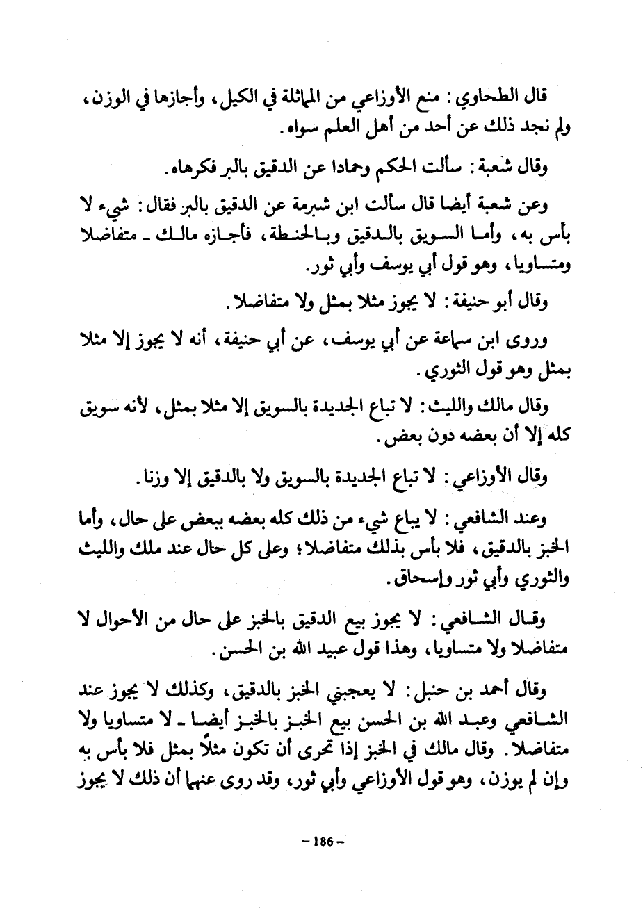 قَالَ الطَّحَاوِيُّ مَنَعَ الْأَوْزَاعِيُّ مِنَ الْمُمَاثَلَةِ فِي الْكَيْلِ وَأَجَازَهَا فِي الْوَزْنِ وَلَمْ نَجِدْ ذَلِكَ عَنْ أَحَدٍ مِنْ أَهْلِ الْعِلْمِ سِوَاهُ وَقَالَ شُعْبَةُ سَأَلْتُ الْحَكَمَ وَحَمَّادًا عَنِ الدَّقِيقِ بِالْبُرِّ فَكَرِهَاهُ وَعَنْ شُعْبَةَ أَيْضًا قَالَ سَأَلْتُ ابْنَ شُبْرُمَةَ عَنِ الدَّقِيقِ بِالْبُرِّ فَقَالَ شَيْءٌ لَا بَأْسَ بِهِ وَأَمَّا السَّوِيقُ بِالدَّقِيقِ وَبِالْحِنْطَةِ فَأَجَازَهُ مَالِكٌ مُتَفَاضِلًا وَمُتَسَاوِيًا وَهُوَ قَوْلُ أَبِي يُوسُفَ وَأَبِي ثَوْرٍ وَقَالَ أَبُو حَنِيفَةَ لَا يَجُوزُ مثلا بمثل ولا متفضالا وَرَوَى ابْنُ سَمَاعَةَ عَنْ أَبِي يُوسُفَ عَنْ أَبِي حَنِيفَةَ أَنَّهُ لَا يَجُوزُ إِلَّا مِثْلًا بمثل وهو قول الثوري وقال مالك والليث لاتباع الْجَدِيدَةُ بِالسَّوِيقِ إِلَّا مِثْلًا بِمِثْلٍ لِأَنَّهُ سَوِيقٌ كُلُّهُ إِلَّا أَنَّ بَعْضَهُ دُونَ بَعْضٍ وَقَالَ الأوزاعي لاتباع الْجَدِيدَةُ بِالسَّوِيقِ وَلَا بِالدَّقِيقِ إِلَّا وَزْنًا وَعِنْدَ الشَّافِعِيِّ لَا يُبَاعُ شَيْءٌ مِنْ ذَلِكَ كُلِّهِ بَعْضُهُ بِبَعْضٍ عَلَى حَالٍ وَأَمَّا الْخُبْزُ بِالدَّقِيقِ فَلَا بَأْسَ بِذَلِكَ مُتَفَاضِلًا وَعَلَى كُلِّ حَالٍ عند مالك والليث وَالثَّوْرِيِّ وَأَبِي ثَوْرٍ وَإِسْحَاقَ وَقَالَ الشَّافِعِيُّ لَا يَجُوزُ بَيْعُ الدَّقِيقِ بِالْخُبْزِ عَلَى حَالٍ مِنَ الأحوال لا متفضالا وَلَا مُتَسَاوِيًا وَهَذَا قَوْلُ عُبَيْدِ اللَّهِ بْنِ الْحَسَنِ وَقَالَ أَحْمَدُ بْنُ حَنْبَلٍ لَا يُعْجِبُنِي الْخُبْزُ بِالدَّقِيقِ وَكَذَلِكَ لَا يَجُوزُ عِنْدَ الشَّافِعِيِّ وَعَبْدِ اللَّهِ بْنِ الْحَسَنِ بَيْعُ الْخُبْزِ بِالْخُبْزِ أيضا لا متساويا ولا متفضالا وَقَالَ مَالِكٌ فِي الْخُبْزِ إِذَا تَحَرَّى أَنْ تَكُونَ مِثْلًا بِمِثْلٍ فَلَا بَأْسَ بِهِ وَإِنْ لَمْ يُوزَنْ وَهُوَ قَوْلُ الْأَوْزَاعِيِّ وَأَبِي ثَوْرٍ وَقَدْ رُوِيَ عَنْهُمْ أَنَّ ذَلِكَ لَا يَجُوزُ