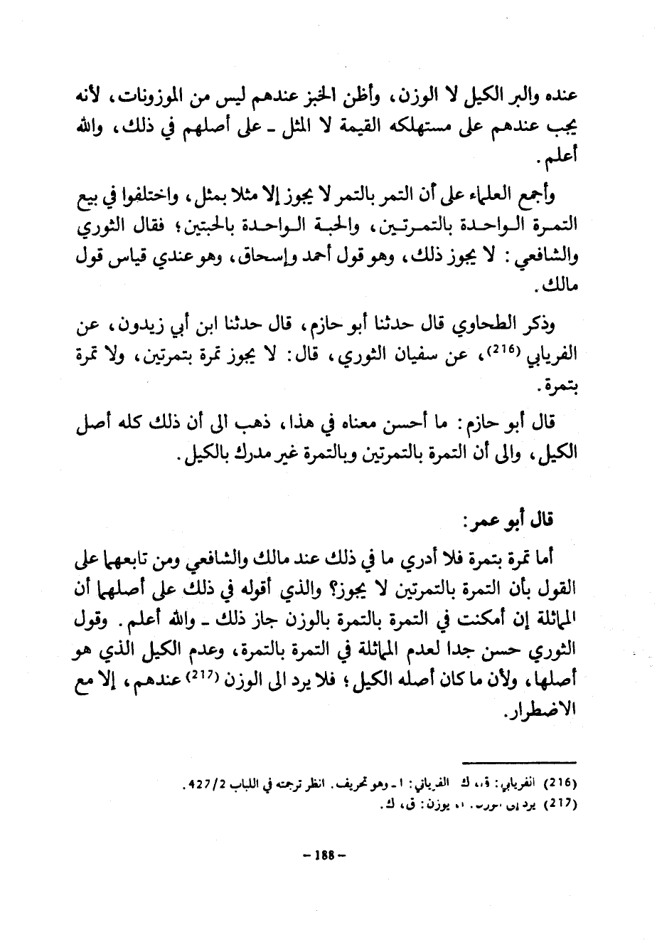 عنده والبر والكيل لَا الْوَزْنُ وَأَظُنُّ الْخُبْزَ عِنْدَهُمْ لَيْسَ مِنَ الْمَوْزُونَاتِ لِأَنَّهُ يَجِبُ عِنْدَهُ عَلَى مُسْتَهْلِكِهِ الْقِيمَةُ لَا الْمِثْلُ عَلَى أَصْلِهِمْ فِي ذَلِكَ وَاللَّهُ أَعْلَمُ وَأَجْمَعَ الْعُلَمَاءُ عَلَى أَنَّ التَّمْرَ بِالتَّمْرِ لَا يَجُوزُ إِلَّا مِثْلًا بِمِثْلٍ وَاخْتَلَفُوا فِي بيع التمرة الواحدة بالتمرتين والحبة الواحدة بالحبيتين فَقَالَ الثَّوْرِيُّ وَالشَّافِعِيُّ لَا يَجُوزُ ذَلِكَ وَهُوَ قَوْلُ أَحْمَدَ وَإِسْحَاقَ وَهُوَ عِنْدِي قِيَاسُ قَوْلِ مَالِكٍ وَذَكَرَ الطَّحَاوِيُّ قَالَ حَدَّثَنَا أَبُو حَازِمٍ قَالَ حَدَّثَنَا ابْنُ أَبِي زَيْدُونَ عَنِ الْفِرْيَابِيِّ عَنْ سُفْيَانَ الثَّوْرِيِّ قَالَ لَا يَجُوزُ تَمْرَةٌ بِتَمْرَتَيْنِ وَلَا تَمْرَةٌ بِتَمْرَةٍ قَالَ أَبُو حَازِمٍ مَا أَحْسَنَ مَعْنَاهُ فِي هَذَا ذَهَبَ إِلَى أَنَّ ذَلِكَ كُلَّهُ أَصْلُ الْكَيْلِ وَإِلَى أَنَّ التَّمْرَةَ بِالتَّمْرَتَيْنِ وَبِالتَّمْرَةِ غَيْرُ مُدْرَكٍ بِالْكَيْلِ قَالَ أَبُو عُمَرَ أَمَّا تَمْرَةٌ بِتَمْرَةٍ فَلَا أَدْرِي مَا فِي ذَلِكَ عِنْدَ مَالِكٍ وَالشَّافِعِيِّ وَمَنْ تَابَعَهُمَا عَلَى الْقَوْلِ بِأَنَّ التَّمْرَةَ بِالتَّمْرَتَيْنِ لَا يَجُوزُ وَالَّذِي أَقُولُهُ فِي ذَلِكَ عَلَى أَصْلِهِمَا أَنَّ الْمُمَاثَلَةَ إِنْ أَمْكَنَتْ فِي التَّمْرَةِ بِالتَّمْرَةِ بِالْوَزْنِ جَازَ ذَلِكَ وَاللَّهُ أَعْلَمُ وَقَوْلُ الثَّوْرِيِّ حَسَنٌ جِدًّا لِعَدَمِ الْمُمَاثَلَةِ فِي التَّمْرَةِ بِالتَّمْرَةِ وَعَدَمِ الْكَيْلِ الَّذِي هُوَ أَصْلُهَا وَلِأَنَّ مَا كَانَ أَصْلُهُ الْكَيْلَ فَلَا يُرَدُّ إِلَى الْوَزْنِ عِنْدَهُمْ إِلَّا مَعَ الِاضْطِرَارِ