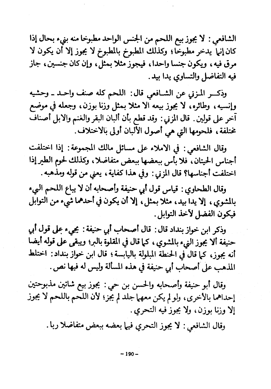 الشَّافِعِيُّ لَا يَجُوزُ بَيْعُ اللَّحْمِ مِنَ الْجِنْسِ الواحد مطبوخا منه بنيء بِحَالٍ إِذَا كَانَ إِنَّمَا يُدَّخَرُ مَطْبُوخًا وَكَذَلِكَ الْمَطْبُوخُ بِالْمَطْبُوخِ لَا يَجُوزُ إِلَّا أَنْ يَكُونَ لَا مَرَقَ فِيهِ وَيَكُونَ جِنْسًا وَاحِدًا فَيَجُوزُ مِثْلًا بِمِثْلٍ وَإِنْ كَانَ جِنْسَيْنِ جَازَ فِيهِ التَّفَاضُلُ وَالتَّسَاوِي يَدًا بِيَدٍ وَذَكَرَ الْمُزَنِيُّ عَنِ الشَّافِعِيِّ قَالَ اللَّحْمُ كُلُّهُ صِنْفٌ وَاحِدٌ وَحْشِيُّهُ وَإِنْسِيُّهُ وَطَائِرُهُ لَا يَجُوزُ بَيْعُهُ إِلَّا مِثْلًا بِمِثْلٍ وَزْنًا بِوَزْنٍ وَجَعَلَهُ فِي مَوْضِعٍ آخَرَ عَلَى قَوْلَيْنِ قَالَ الْمُزَنِيُّ وَقَدْ قُطِعَ بِأَنَّ أَلْبَانَ الْبَقَرِ وَالْغَنَمِ وَالْإِبِلِ أَصْنَافٌ مُخْتَلِفَةٌ فَلُحُومُهَا الَّتِي هِيَ أُصُولُ الْأَلْبَانِ أَوْلَى بِالِاخْتِلَافِ وَقَالَ الشَّافِعِيُّ فِي الْإِمْلَاءِ عَلَى مَسَائِلِ مَالِكٍ الْمَجْمُوعَةِ إِذَا اخْتَلَفَتْ أَجْنَاسُ الْحِيتَانِ فَلَا بَأْسَ بِبَعْضِهَا بِبَعْضٍ مُتَفَاضِلًا وَكَذَلِكَ لُحُومُ الطَّيْرِ إِذَا اخْتَلَفَتْ أَجْنَاسُهَا قَالَ الْمُزَنِيُّ وَفِي هَذَا كِفَايَةٌ يَعْنِي مِنْ قَوْلِهِ وَمَذْهَبِهِ وَقَالَ الطَّحَاوِيُّ قِيَاسُ قَوْلِ أَبِي حَنِيفَةَ وَأَصْحَابِهِ أَنْ لَا يُبَاعَ اللَّحْمُ النيء بِالْمَشْوِيِّ إِلَّا يَدًا بِيَدٍ مِثْلًا بِمِثْلٍ إِلَّا أَنْ يَكُونَ فِي أَحَدِهِمَا شَيْءٌ مِنَ التَّوَابِلِ فَيَكُونَ الْفَضْلُ لِآخِذِ التَّوَابِلِ وَذَكَرَ ابْنُ خَوَّازِ بِنْدَادَ قَالَ قَالَ أَصْحَابُ أَبِي حَنِيفَةَ يَجِيءُ على قول أبي حنيفة ألا يجوز النيء بِالْمَشْوِيِّ كَمَا قَالَ فِي الْمَقْلُوَّةِ بِالْبُرِّ وَيَبْقَى عَلَى قَوْلِهِ أَيْضًا أَنَّهُ يَجُوزُ كَمَا قَالَ فِي الْحِنْطَةِ الْمَبْلُولَةِ بِالْيَابِسَةِ قَالَ ابْنُ خَوَّازِ بِنْدَادَ اخْتَلَطَ الْمَذْهَبُ عَلَى أَصْحَابِ أَبِي حَنِيفَةَ فِي هَذِهِ الْمَسْأَلَةِ وَلَيْسَ لَهُ فِيهَا نَصٌّ وَقَالَ أَبُو حَنِيفَةَ وَأَصْحَابُهُ وَالْحَسَنُ بْنُ حَيٍّ يَجُوزُ بَيْعُ شَاتَيْنِ مَذْبُوحَتَيْنِ إِحْدَاهُمَا بِالْأُخْرَى وَلَوْ لَمْ يَكُنْ مَعَهُمَا جِلْدٌ لَمْ يَجُزْ لِأَنَّ اللَّحْمَ بِاللَّحْمِ لَا يَجُوزُ إِلَّا وَزْنًا بِوَزْنٍ ولا يجوز فيه التحري وقال الشافعي لايجوز التَّحَرِّي فِيمَا بَعْضُهُ بِبَعْضٍ مُتَفَاضِلًا رِبًا