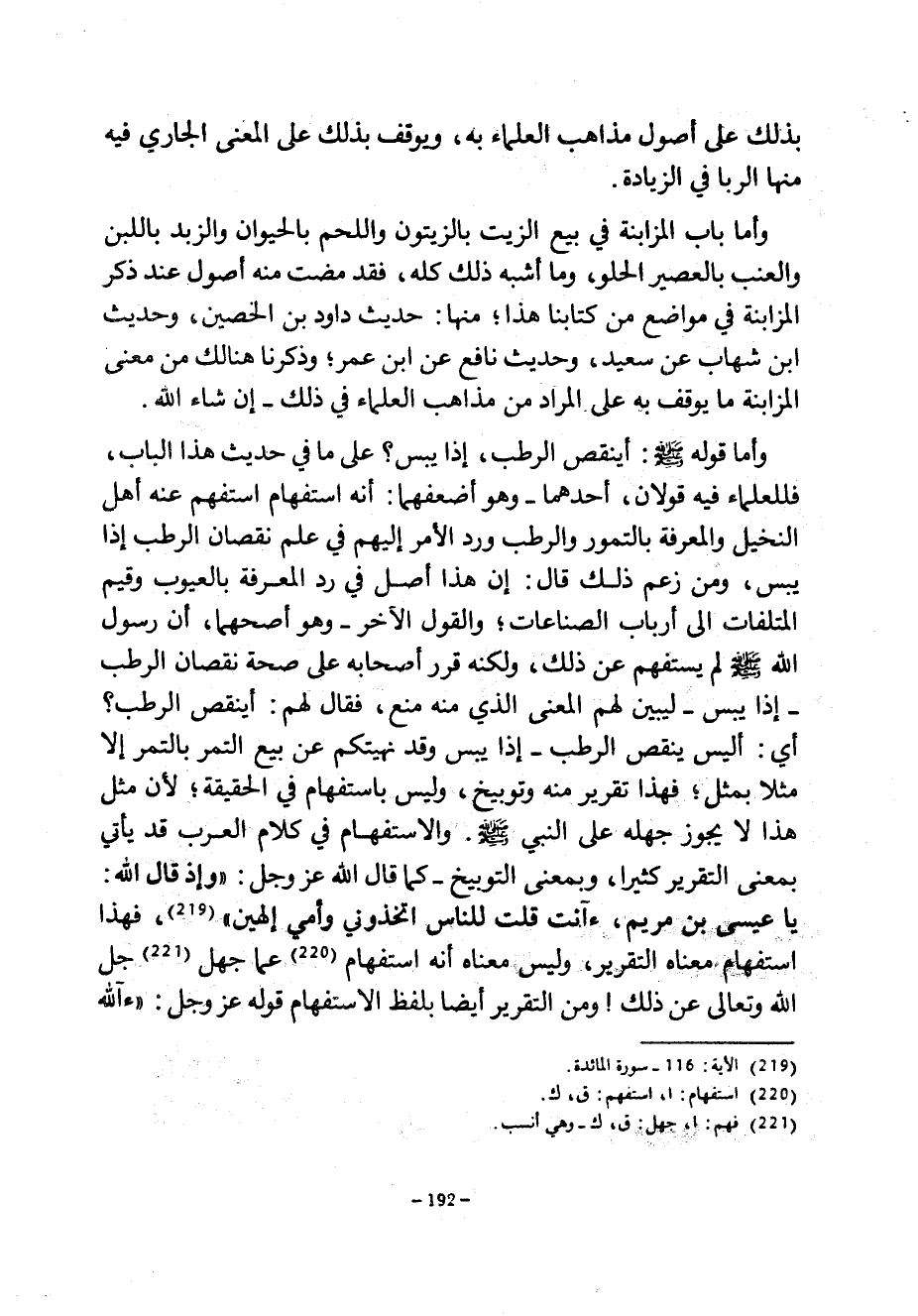 بِذَلِكَ عَلَى أُصُولِ مَذَاهِبِ الْعُلَمَاءِ بِهِ وَيُوقَفَ بِذَلِكَ عَلَى الْمَعْنَى الْجَارِي فِيهِ مِنْهَا الرِّبَا في الزيادة وأما باب المزبانة فِي بَيْعِ الزَّيْتِ بِالزَّيْتُونِ وَاللَّحْمِ بِالْحَيَوَانِ وَالزُّبْدِ بِاللَّبَنِ وَالْعِنَبِ بِالْعَصِيرِ الْحُلْوِ وَمَا أَشْبَهَ ذَلِكَ كُلَّهُ فَقَدْ مَضَتْ مِنْهُ أَصُولٌ عِنْدَ ذِكْرِ الْمُزَابَنَةِ فِي مَوَاضِعَ مِنْ كِتَابِنَا هَذَا مِنْهَا حَدِيثُ دَاوُدَ بْنِ الْحُصَيْنِ وَحَدِيثُ ابْنِ شِهَابٍ عَنْ سَعِيدٍ وَحَدِيثُ نَافِعٍ عَنِ ابْنِ عُمَرَ وَذَكَرْنَا هُنَالِكَ مِنْ مَعْنَى الْمُزَابَنَةِ مَا يُوقَفُ بِهِ عَلَى الْمُرَادِ مِنْ مَذَاهِبِ الْعُلَمَاءِ فِي ذَلِكَ إِنْ شَاءَ اللَّهُ وَأَمَّا قَوْلُهُ صَلَّى اللَّهُ عَلَيْهِ وَسَلَّمَ أَيَنْقُصُ الرُّطَبُ إِذَا يَبِسَ عَلَى مَا فِي حَدِيثِ هَذَا الْبَابِ فَلِلْعُلَمَاءِ فِيهِ قَوْلَانِ أَحَدُهُمَا وَهُوَ أَضْعَفُهُمَا أَنَّهُ اسْتِفْهَامٌ اسْتَفْهَمَ عَنْهُ أَهْلَ النَّخِيلِ وَالْمَعْرِفَةِ بِالتُّمُورِ وَالرُّطَبِ وَرَدَّ الْأَمْرَ إِلَيْهِمْ فِي عِلْمِ نُقْصَانِ الرُّطَبِ إِذَا يَبِسَ وَمَنْ زَعَمَ ذَلِكَ قَالَ إِنَّ هَذَا أَصْلٌ فِي رَدِّ الْمَعْرِفَةِ بِالْعُيُوبِ وَقِيَمِ المتلفات إلى أرباب النصاعات وَالْقَوْلُ الْآخَرُ وَهُوَ أَصَحُّهُمَا أَنَّ رَسُولَ اللَّهِ صَلَّى اللَّهُ عَلَيْهِ وَسَلَّمَ لَمْ يَسْتَفْهِمْ عَنْ ذَلِكَ وَلَكِنَّهُ قَرَّرَ أَصْحَابَهُ عَلَى صِحَّةِ نُقْصَانِ الرُّطَبِ إِذَا يَبِسَ لِيُبَيِّنَ لَهُمُ الْمَعْنَى الَّذِي مِنْهُ مَنَعَ فَقَالَ لَهُمْ أَيَنْقُصُ الرُّطَبُ أَيْ أَلَيْسَ يَنْقُصُ الرُّطَبُ إِذَا يَبِسَ وَقَدْ نَهَيْتُكُمْ عَنْ بَيْعِ التَّمْرِ بِالتَّمْرِ إِلَّا مِثْلًا بِمِثْلٍ فَهَذَا تَقْرِيرٌ مِنْهُ وَتَوْبِيخٌ وَلَيْسَ بِاسْتِفْهَامٍ فِي الْحَقِيقَةِ لِأَنَّ مِثْلَ هَذَا لَا يَجُوزُ جَهْلُهُ عَلَى النَّبِيِّ صَلَّى اللَّهُ عَلَيْهِ وَسَلَّمَ وَالِاسْتِفْهَامُ فِي كَلَامِ الْعَرَبِ قَدْ يَأْتِي بِمَعْنَى التَّقْرِيرِ كَثِيرًا وَبِمَعْنَى التَّوْبِيخِ كَمَا قَالَ اللَّهُ عَزَّ وجل وإذ قال الله يا عيسى بن مريم ءآنت قُلْتَ لِلنَّاسِ اتَّخِذُونِي وَأُمِّيَ إِلَهَيْنِ فَهَذَا اسْتِفْهَامٌ مَعْنَاهُ التَّقْرِيرُ وَلَيْسَ مَعْنَاهُ أَنَّهُ اسْتِفْهَامٌ عَمَّا جَهِلَ جَلَّ اللَّهُ وَتَعَالَى عَنْ ذَلِكَ وَمِنَ التَّقْرِيرِ أَيْضًا بِلَفْظِ الِاسْتِفْهَامِ قَوْلُهُ عَزَّ وَجَلَّ ءآلله