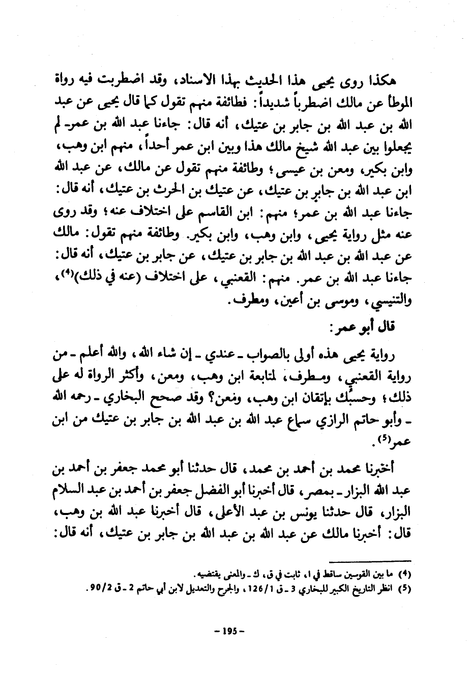 هَكَذَا رَوَى يَحْيَى هَذَا الْحَدِيثَ بِهَذَا الْإِسْنَادِ وَقَدِ اضْطَرَبَتْ فِيهِ رُوَاةُ الْمُوَطَّأِ عَنْ مَالِكٍ اضْطِرَابًا شَدِيدًا فَطَائِفَةٌ مِنْهُمْ تَقُولُ كَمَا قَالَ يَحْيَى عَنْ عَبْدِ اللَّهِ بْنِ عَبْدِ اللَّهِ بْنِ جَابِرِ بْنِ عَتِيكٍ أَنَّهُ قَالَ جَاءَنَا عَبْدُ اللَّهِ بْنُ عُمَرَ لَمْ يَجْعَلُوا بَيْنَ عَبْدِ اللَّهِ شَيْخِ مَالِكٍ هَذَا وَبَيْنَ ابْنِ عُمَرَ أَحَدًا مِنْهُمُ ابْنُ وَهْبٍ وَابْنُ بُكَيْرٍ وَمَعْنُ بْنُ عِيسَى وَطَائِفَةٌ مِنْهُمْ تَقُولُ عَنْ مالك عن عبد الله ابن عَبْدِ اللَّهِ بْنِ جَابِرِ بْنِ عَتِيكٍ عَنْ عتيك بن الحرث بْنِ عَتِيكٍ أَنَّهُ قَالَ جَاءَنَا عَبْدُ اللَّهِ بْنُ عُمَرَ مِنْهُمُ ابْنُ الْقَاسِمِ عَلَى اخْتِلَافٍ عَنْهُ وَقَدْ رُوِيَ عَنْهُ مِثْلُ رِوَايَةِ يَحْيَى وَابْنِ وَهْبٍ وَابْنِ بُكَيْرٍ وَطَائِفَةٌ مِنْهُمْ تَقُولُ مَالِكٌ عَنْ عَبْدِ اللَّهِ بْنِ عَبْدِ اللَّهِ بْنِ جَابِرِ بْنِ عَتِيكٍ عَنْ جَابِرِ بْنِ عَتِيكٍ أَنَّهُ قَالَ جَاءَنَا عَبْدُ اللَّهِ بْنُ عُمَرَ مِنْهُمُ الْقَعْنَبِيُّ عَلَى اخْتِلَافٍ (عَنْهُ فِي ذَلِكَ) وَالتِّنِّيسِيُّ وَمُوسَى بْنُ أَعْيَنَ وَمُطَرِّفٌ قَالَ أَبُو عُمَرَ رِوَايَةُ يَحْيَى هَذِهِ أَوْلَى بِالصَّوَابِ عِنْدِي إِنْ شَاءَ اللَّهُ وَاللَّهُ أَعْلَمُ مِنْ رِوَايَةِ الْقَعْنَبِيِّ وَمُطَرِّفٍ لِمُتَابَعَةِ ابْنِ وَهْبٍ وَمَعْنٍ وَأَكْثَرِ الرُّوَاةِ لَهُ عَلَى ذَلِكَ وَحَسْبُكَ بِإِتْقَانِ ابْنِ وَهْبٍ وَمَعْنٍ وَقَدْ صَحَّحَ الْبُخَارِيُّ رَحِمَهُ اللَّهُ وَأَبُو حَاتِمٍ الرَّازِيُّ سَمَاعَ عَبْدِ اللَّهِ بْنِ عَبْدِ اللَّهِ بْنِ عَبْدِ اللَّهِ بْنِ جَابِرِ بْنِ عَتِيكٍ مِنَ ابْنِ عُمَرَ أَخْبَرَنَا مُحَمَّدُ بْنُ أَحْمَدَ بْنِ مُحَمَّدٍ قَالَ حَدَّثَنَا أَبُو مُحَمَّدٍ جَعْفَرُ بْنُ أَحْمَدَ بْنِ عَبْدِ اللَّهِ الْبَزَّارُ بِمِصْرَ قَالَ أَخْبَرَنَا أَبُو الْفَضْلِ جَعْفَرُ بْنُ أَحْمَدَ بْنِ عَبْدِ السَّلَامِ الْبَزَّارُ قال حدثنا يونس بن عبد العلى قَالَ أَخْبَرَنَا عَبْدُ اللَّهِ بْنُ وَهْبٍ قَالَ أَخْبَرَنَا مَالِكٌ عَنْ عَبْدِ اللَّهِ بْنِ عَبْدِ اللَّهِ بْنِ جَابِرِ بْنِ عَتِيكٍ أَنَّهُ قَالَ