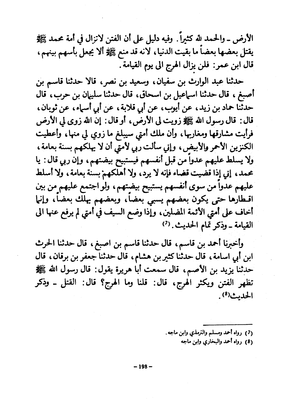 الْأَرْضِ وَالْحَمْدُ لِلَّهِ كَثِيرًا وَفِيهِ دَلِيلٌ عَلَى أَنَّ الْفِتَنَ لَا تَزَالُ فِي أَمَةِ مُحَمَّدٍ صَلَّى اللَّهُ عَلَيْهِ وَسَلَّمَ يَقْتُلُ بَعْضُهَا بَعْضًا مَا بَقِيَتِ الدُّنْيَا لِأَنَّهُ قَدْ مُنِعَ صَلَّى اللَّهُ عَلَيْهِ وَسَلَّمَ أَلَّا يُجْعَلَ بَأْسُهُمْ بَيْنَهُمْ قَالَ ابْنُ عُمَرَ فَلَنْ يَزَالَ الْهَرْجُ إِلَى يَوْمِ الْقِيَامَةِ حَدَّثَنَا عَبْدُ الْوَارِثِ بْنُ سُفْيَانَ وَسَعِيدُ بْنُ نَصْرٍ قَالَا حَدَّثَنَا قَاسِمُ بْنُ أَصْبَغَ قَالَ حَدَّثَنَا إِسْمَاعِيلُ بْنُ إِسْحَاقَ قَالَ حَدَّثَنَا سُلَيْمَانُ بْنُ حَرْبٍ قَالَ حَدَّثَنَا حَمَّادُ بْنُ زَيْدٍ عَنْ أَيُّوبَ عَنْ أَبِي قِلَابَةَ عَنْ أَبِي أَسْمَاءَ عَنْ ثَوْبَانَ قَالَ قَالَ رَسُولُ اللَّهِ صَلَّى اللَّهُ عَلَيْهِ وَسَلَّمَ زُوِيَتْ لِيَ الْأَرْضُ أَوْ قَالَ إِنَّ اللَّهَ زَوَى لِيَ الْأَرْضَ فَرَأَيْتُ مَشَارِقَهَا وَمَغَارِبَهَا وَأَنَّ مُلْكَ أُمَّتِي سَيَبْلُغُ مَا زُوِيَ لِي مِنْهَا وَأُعْطِيتُ الْكَنْزَيْنِ الْأَحْمَرَ وَالْأَبْيَضَ وَإِنِّي سَأَلْتُ رَبِّي لِأُمَّتِي أن لا يهكلهم بِسَنَةٍ بِعَامَّةٍ وَلَا يُسَلِّطَ عَلَيْهِمْ عَدُوًّا مِنْ قِبَلِ أَنْفُسِهِمْ فَيَسْتَبِيحَ بَيْضَتَهُمْ وَإِنَّ رَبِّي قَالَ يَا مُحَمَّدُ إِنِّي إِذَا قَضَيْتُ قَضَاءً فَإِنَّهُ لَا يُرَدُّ وَلَا أُهْلِكُهُمْ بِسَنَةٍ بِعَامَّةٍ وَلَا أُسَلِّطُ عَلَيْهِمْ عَدُوًّا مِنْ سِوَى أَنْفُسِهِمْ يَسْتَبِيحُ بَيْضَتَهُمْ وَلَوِ اجْتَمَعَ عَلَيْهِمْ مِنْ بَيْنِ أَقْطَارِهَا حَتَّى يَكُونَ بَعْضُهُمْ يَسْبِي بَعْضًا وَبَعْضُهُمْ يُهْلِكُ بَعْضًا وَإِنَّمَا أَخَافُ عَلَى أُمَّتِي الْأَئِمَّةَ الْمُضِلِّينَ وَإِذَا وُضِعَ السَّيْفُ فِي أُمَّتِي لَمْ يُرْفَعْ عَنْهَا إِلَى الْقِيَامَةِ وَذَكَرَ تَمَامَ الْحَدِيثِ وَأَخْبَرَنَا أَحْمَدُ بْنُ قَاسِمٍ قَالَ حَدَّثَنَا قَاسِمُ بْنُ أَصْبَغَ قال حدثنا الحرث ابن أَبِي أُسَامَةَ قَالَ حَدَّثَنَا كَثِيرُ بْنُ هِشَامٍ قَالَ حَدَّثَنَا جَعْفَرُ بْنُ بُرْقَانَ قَالَ حَدَّثَنَا يَزِيدُ بْنُ الْأَصَمِّ قَالَ سَمِعْتُ أَبَا هُرَيْرَةَ يَقُولُ قَالَ رَسُولُ اللَّهِ صَلَّى اللَّهُ عَلَيْهِ وَسَلَّمَ تَظْهَرُ الْفِتَنُ وَيَكْثُرُ الْهَرْجُ قَالَ قُلْنَا وَمَا الْهَرْجُ قَالَ الْقَتْلُ وَذَكَرَ الْحَدِيثَ