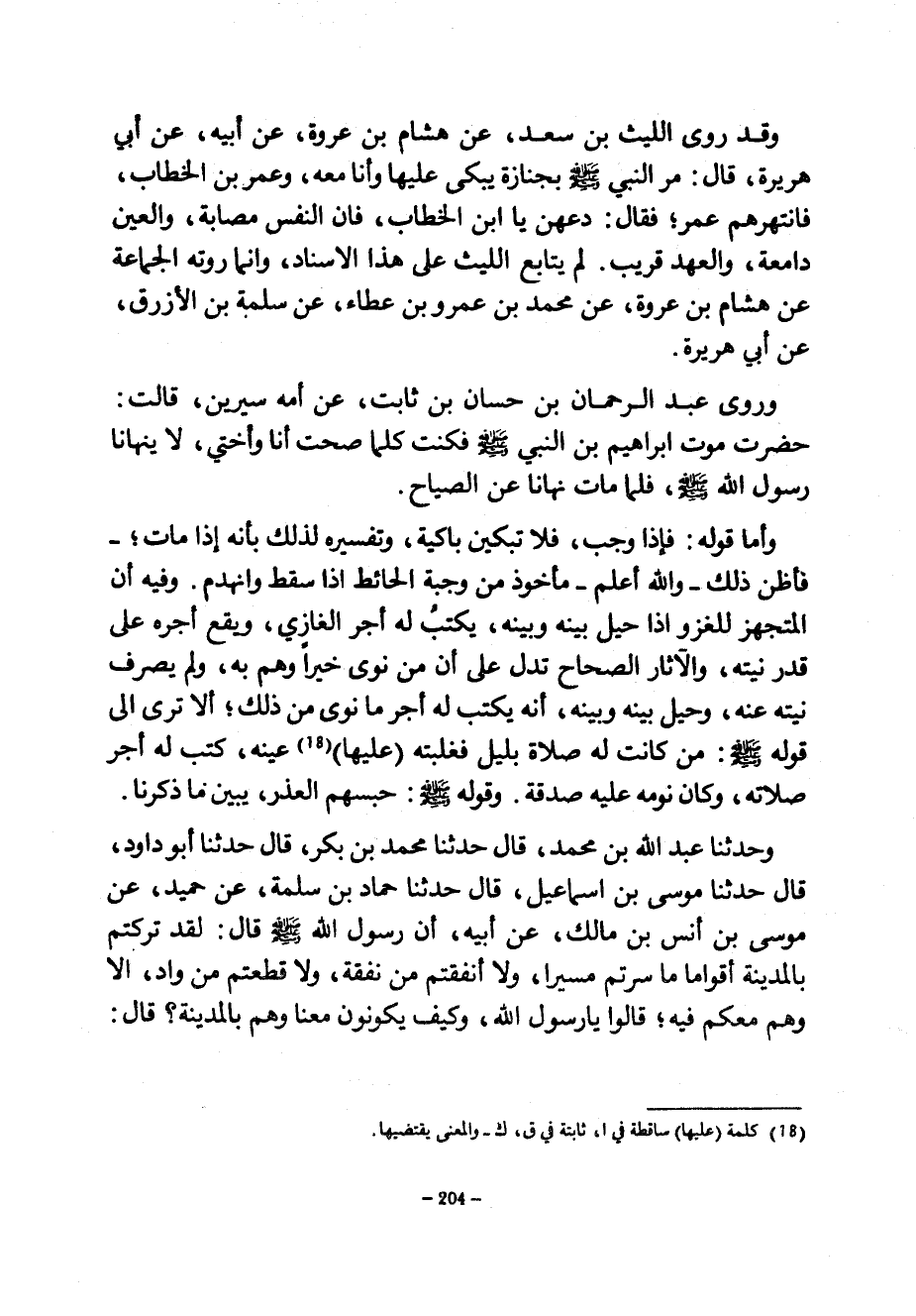 وَقَدْ رَوَى اللَّيْثُ بْنُ سَعْدٍ عَنْ هِشَامِ بْنِ عُرْوَةَ عَنْ أَبِيهِ عَنْ أَبِي هُرَيْرَةَ قَالَ مَرَّ النَّبِيُّ صَلَّى اللَّهُ عَلَيْهِ وَسَلَّمَ بِجِنَازَةٍ يُبْكَى عَلَيْهَا وَأَنَا مَعَهُ وَعُمَرُ بْنُ الْخَطَّابِ فَانْتَهَرَهُمْ عُمَرُ فَقَالَ دَعْهُنَّ يَا ابْنَ الخطاب فإن النفس مصابة والعين دَامِعَةً وَالْعَهْدَ قَرِيبٌ لَمْ يُتَابَعِ اللَّيْثُ عَلَى هَذَا الْإِسْنَادِ وَإِنَّمَا رَوَتْهُ الْجَمَاعَةُ عَنْ هِشَامِ بْنِ عُرْوَةَ عَنْ مُحَمَّدِ بْنِ عَمْرِو بْنِ عَطَاءٍ عَنِ سَلَمَةَ بْنِ الْأَزْرَقِ عَنْ أَبِي هريرة وروى عبد الرحمان بْنُ حَسَّانَ بْنِ ثَابِتٍ عَنْ أُمِّهِ سِيرِينَ قالت حضرت موت إِبْرَاهِيمَ بْنِ النَّبِيِّ صَلَّى اللَّهُ عَلَيْهِ وَسَلَّمَ فَكُنْتُ كُلَّمَا صِحْتُ أَنَا وَأُخْتِي لَا يَنْهَانَا رَسُولُ اللَّهِ صَلَّى اللَّهُ عَلَيْهِ وَسَلَّمَ فَلَمَّا مَاتَ نَهَانَا عن الصياح وأما قوله فإذا وجب فلاتبكين باكية وتفسير لِذَلِكَ بِأَنَّهُ إِذَا مَاتَ فَأَظُنُّ ذَلِكَ وَاللَّهُ أَعْلَمُ مَأْخُوذٌ مِنْ وَجْبَةِ الْحَائِطِ إِذَا سَقَطَ وَانْهَدَمَ وَفِيهِ أَنَّ الْمُتَجَهِّزَ لِلْغَزْوِ إِذَا حِيلَ بَيْنَهُ وَبَيْنَهُ يُكْتَبُ لَهُ أَجْرُ الْغَازِي وَيَقَعُ أَجْرُهُ عَلَى قَدْرِ نِيَّتِهِ وَالْآثَارُ الصِّحَاحُ تَدُلُّ عَلَى أَنَّ مَنْ نَوَى خَيْرًا وَهَمَّ بِهِ وَلَمْ يَصْرِفْ نِيَّتَهُ عَنْهُ وَحِيلَ بَيْنَهُ وَبَيْنَهُ أَنَّهُ يُكْتَبُ لَهُ أَجْرُ مَا نَوَى مِنْ ذلك أَلَا تَرَى إِلَى قَوْلِهِ صَلَّى اللَّهُ عَلَيْهِ وَسَلَّمَ مَنْ كَانَتْ لَهُ صَلَاةٌ بِلَيْلٍ فَغَلَبَتْهُ (عَلَيْهَا) عَيْنُهُ كُتِبَ لَهُ أَجَرَ صَلَاتِهِ وَكَانَ نَوْمُهُ عَلَيْهِ صَدَقَةً وَقَوْلِهِ صَلَّى اللَّهُ عَلَيْهِ وَسَلَّمَ حَبَسَهُمُ الْعُذْرُ يُبَيِّنُ مَا ذَكَرْنَا وَحَدَّثَنَا عَبْدُ اللَّهِ بْنُ مُحَمَّدٍ قَالَ حَدَّثَنَا مُحَمَّدُ بْنُ بَكْرٍ قَالَ حَدَّثَنَا أَبُو دَاوُدَ قَالَ حَدَّثَنَا مُوسَى بْنُ إِسْمَاعِيلَ قَالَ حَدَّثَنَا حَمَّادُ بْنُ سَلَمَةَ عَنْ حُمَيْدٍ عَنْ مُوسَى بْنِ أَنَسِ بْنِ مَالِكٍ عَنْ أَبِيهِ أَنَّ رَسُولَ اللَّهِ صَلَّى اللَّهُ عَلَيْهِ وَسَلَّمَ قَالَ لَقَدْ تَرَكْتُمْ بِالْمَدِينَةِ أَقْوَامًا مَا سِرْتُمْ مَسِيرًا وَلَا أَنْفَقْتُمْ مِنْ نَفَقَةٍ وَلَا قَطَعْتُمْ مِنْ وَادٍ إِلَّا وَهُمْ مَعَكُمْ فِيهِ قَالُوا يَا رسول الله وكيف يكونون معنا وَهُمْ بِالْمَدِينَةِ قَالَ