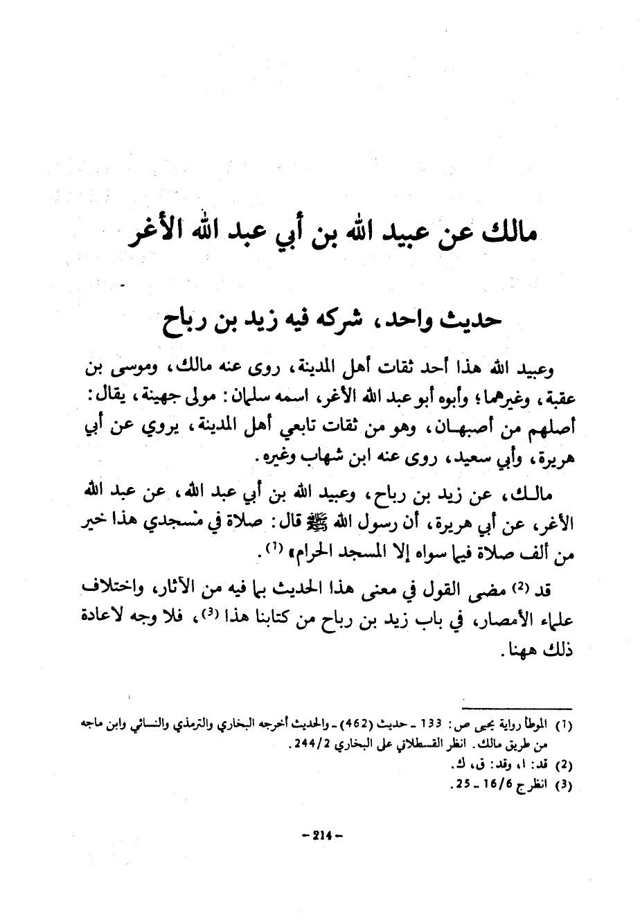 مَالِكٌ عَنْ عُبَيْدِ اللَّهِ بْنِ أَبِي عَبْدِ اللَّهِ الْأَغَرِّ حَدِيثٌ وَاحِدٌ شَرِكَهُ فِيهِ زَيْدُ بْنُ رَبَاحٍ وَعُبَيْدُ اللَّهِ هَذَا أَحَدُ ثِقَاتِ أَهْلِ الْمَدِينَةِ رَوَى عَنْهُ مَالِكٌ وَمُوسَى بْنُ عُقْبَةَ وَغَيْرُهُمَا وَأَبُوهُ أَبُو عَبْدِ اللَّهِ الْأَغَرُّ اسْمُهُ سَلْمَانُ مَوْلَى جُهَيْنَةَ يُقَالُ أَصْلُهُمْ مِنْ أَصْبَهَانَ وَهُوَ مِنْ ثِقَاتِ تَابِعِي أَهْلِ الْمَدِينَةِ يَرْوِي عَنْ أَبِي هُرَيْرَةَ وَأَبِي سَعِيدٍ رَوَى عَنْهُ ابْنُ شِهَابٍ وَغَيْرُهُ مَالِكٌ عَنْ زَيْدِ بْنِ رَبَاحٍ وَعُبَيْدِ اللَّهِ بْنِ أَبِي عَبْدِ اللَّهِ عَنْ عَبْدِ اللَّهِ الْأَغَرِّ عَنْ أَبِي هُرَيْرَةَ أَنَّ رَسُولَ اللَّهِ صَلَّى اللَّهُ عَلَيْهِ وَسَلَّمَ قَالَ صَلَاةٌ فِي مَسْجِدِي هَذَا خَيْرٌ مِنْ أَلْفِ صَلَاةٍ فِيمَا سِوَاهُ إِلَّا الْمَسْجِدَ الْحَرَامَ قَدْ مَضَى الْقَوْلُ فِي مَعْنَى هَذَا الْحَدِيثِ بِمَا فِيهِ مِنَ الْآثَارِ وَاخْتِلَافِ عُلَمَاءِ الْأَمْصَارِ فِي بَابِ زَيْدِ بْنِ رَبَاحٍ مِنْ كِتَابِنَا هَذَا فَلَا وَجْهَ لِإِعَادَةِ ذَلِكَ ههنا