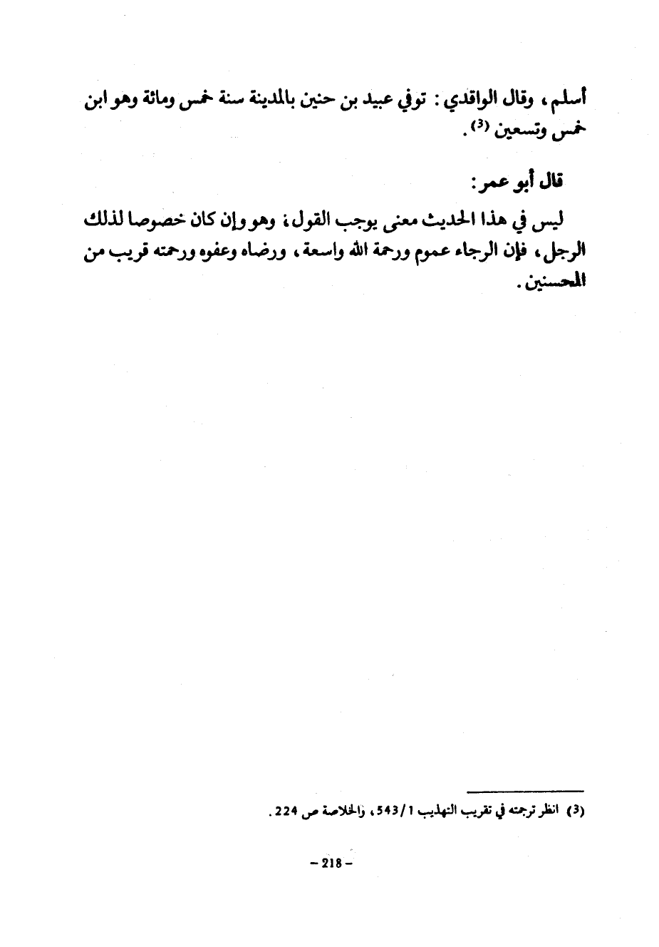 أَسْلَمَ وَقَالَ الْوَاقِدِيُّ تُوُفِّيَ عُبَيْدُ بْنُ حُنَيْنٍ بِالْمَدِينَةِ سَنَةَ خَمْسٍ وَمِائَةٍ وَهُوَ ابْنُ خَمْسٍ وَتِسْعِينَ قَالَ أَبُو عُمَرَ لَيْسَ فِي هَذَا الْحَدِيثِ مَعْنًى يُوجِبُ الْقَوْلَ وَهُوَ وَإِنْ كَانَ خُصُوصًا لِذَلِكَ الرَّجُلِ فَإِنَّ الرَّجَاءَ عُمُومٌ وَرَحْمَةَ اللَّهِ وَاسِعَةٌ وَرِضَاهُ وَعَفْوَهُ وَرَحْمَتَهُ قَرِيبٌ مِنَ المحسنين