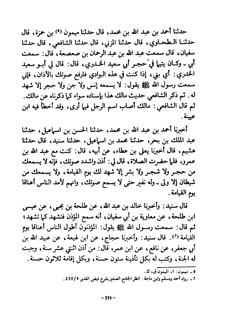 حَدَّثَنَا أَحْمَدُ بْنُ عَبْدِ اللَّهِ بْنِ مُحَمَّدِ قَالَ حَدَّثَنَا مَيْمُونُ بْنُ حَمْزَةَ قَالَ حَدَّثَنَا الطَّحَاوِيُّ قَالَ حَدَّثَنَا الْمُزَنِيُّ قَالَ حَدَّثَنَا الشَّافِعِيُّ قَالَ حَدَّثَنَا سُفْيَانُ قَالَ سَمِعْتُ عَبْدَ اللَّهِ بن عبد الرحمان بْنِ صَعْصَعَةَ قَالَ سَمِعْتُ أَبِي وَكَانَ يَتِيمًا فِي حِجْرِ أَبِي سَعِيدٍ الْخُدْرِيِّ قَالَ قَالَ لِي أَبُو سَعِيدٍ الْخُدْرِيُّ أَيْ بُنَيَّ إِذَا كُنْتَ فِي هَذِهِ الْبَوَادِي فَارْفَعْ صَوْتَكَ بِالْأَذَانِ فَإِنِّي سَمِعْتُ رَسُولَ اللَّهِ صَلَّى اللَّهُ عَلَيْهِ وَسَلَّمَ يَقُولُ لَا يَسْمَعُهُ إِنْسٌ وَلَا جِنٌّ وَلَا حَجَرٌ إِلَّا شَهِدَ لَهُ ثُمَّ ذَكَرَ الشَّافِعِيُّ حَدِيثَ مَالِكٍ هَذَا بِإِسْنَادِهِ سَوَاءً كَمَا ذَكَرْنَاهُ عَنْ مَالِكٍ ثُمَّ قَالَ الشَّافِعِيُّ مَالِكٌ أَصَابَ اسْمَ الرَّجُلِ فِيمَا أَرَى وَقَدْ أَخْطَأَ فِيهِ ابْنُ عُيَيْنَةَ أَخْبَرَنَا أَحْمَدُ بْنُ عَبْدِ اللَّهِ بْنِ مُحَمَّدِ حَدَّثَنَا الْحَسَنُ بْنُ إِسْمَاعِيلَ حَدَّثَنَا عَبْدُ الْمَلِكِ بْنُ بَحْرٍ حَدَّثَنَا مُحَمَّدُ بْنُ إِسْمَاعِيلَ حَدَّثَنَا سُنَيْدٌ قَالَ حَدَّثَنَا هُشَيْمٌ قَالَ أَخْبَرَنَا يَعْلَى بْنُ عَطَاءٍ عَنِ أَبِيهِ قَالَ كُنْتُ مَعَ عَبْدِ اللَّهِ بْنِ عَمْرٍو فَلَمَّا حَضَرَتِ الصَّلَاةُ قَالَ لِي أَذِّنْ وَاشْدُدْ صَوْتَكَ فَإِنَّهُ لَا يَسْمَعُكَ مِنْ حَجَرٍ وَلَا شَجَرٍ وَلَا بَشَرٍ إِلَّا شَهِدَ لَكَ يَوْمَ الْقِيَامَةِ وَلَا يَسْمَعُكَ مِنْ شَيْطَانٍ إِلَّا وَلَّى وَلَهُ نَفِيرٌ حَتَّى لَا يَسْمَعَ صَوْتَكَ وَإِنَّهُمْ لَأَمَدُّ النَّاسِ أَعْنَاقًا يَوْمَ الْقِيَامَةِ قَالَ سُنَيْدٌ وَأَخْبَرَنَا خَالِدُ بْنُ عَبْدِ اللَّهِ عَنْ طَلْحَةَ بن يحيى عن عيسى ابن طَلْحَةَ عَنْ مُعَاوِيَةَ بْنِ أَبِي سُفْيَانَ أَنَّهُ سَمِعَ الْمُؤَذِّنَ فَتَشَهَّدَ كَمَا تَشَهَّدَ ثُمَّ قَالَ سَمِعْتُ رَسُولَ اللَّهِ صَلَّى اللَّهُ عَلَيْهِ وسلم يَقُولُ الْمُؤَذِّنُونَ أَطْوَلُ النَّاسِ أَعْنَاقًا يَوْمَ الْقِيَامَةِ قَالَ سُنَيْدٌ وَأَخْبَرَنَا حَجَّاجٌ عَنِ ابْنُ لَهِيعَةَ عَنْ عُبَيْدِ اللَّهِ بْنِ أَبِي جَعْفَرٍ عَنْ نَافِعٍ عَنِ ابْنِ عُمَرَ قَالَ مَنْ أَذَّنَ اثنتي عشر سَنَةً وَجَبَتْ لَهُ الْجَنَّةُ وَكُتِبَ لَهُ بِكُلِّ تَأْذِينَةٍ سِتُّونَ حَسَنَةً وَبِكُلِّ إِقَامَةٍ ثَلَاثُونَ حَسَنَةً