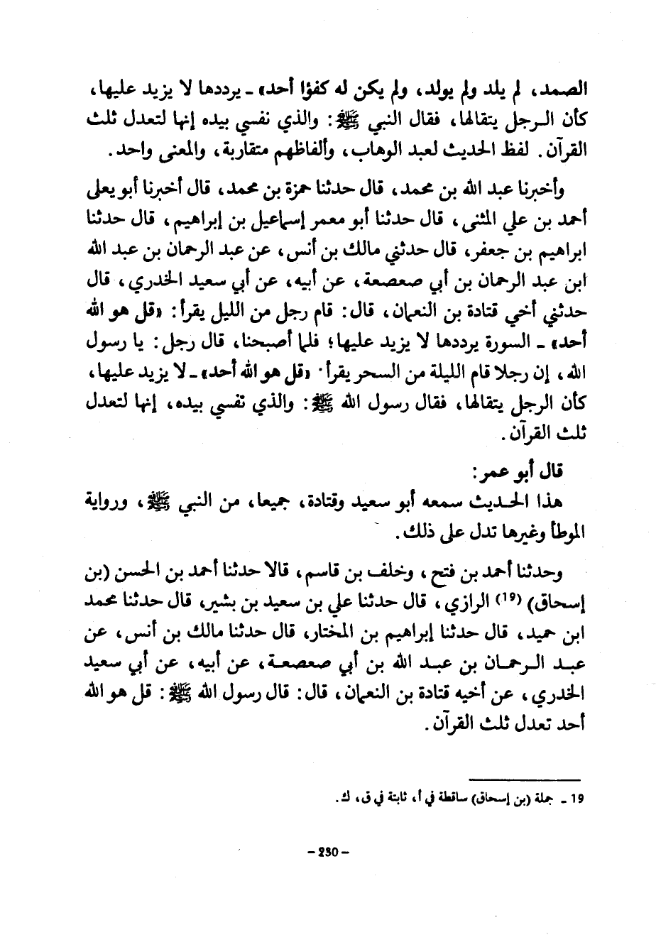 الصَّمَدُ لَمْ يَلِدْ وَلَمْ يُولَدْ وَلَمْ يَكُنْ له كفؤا أَحَدٌ يُرَدِّدُهَا لَا يَزِيدُ عَلَيْهَا كَأَنَّ الرَّجُلَ يَتَقَالُّهَا فَقَالَ النَّبِيُّ صَلَّى اللَّهُ عَلَيْهِ وَسَلَّمَ وَالَّذِي نَفْسِي بِيَدِهِ إِنَّهَا لَتَعْدِلُ ثُلُثَ الْقُرْآنِ لَفْظُ الْحَدِيثِ لِعَبْدِ الْوَهَّابِ وَأَلْفَاظُهُمْ مُتَقَارِبَةٌ وَالْمَعْنَى وَاحِدٌ وَأَخْبَرَنَا عَبْدُ اللَّهِ بْنُ مُحَمَّدٍ قَالَ حَدَّثَنَا حَمْزَةُ بْنُ مُحَمَّدٍ قَالَ أَخْبَرَنَا أَبُو يُعْلَى أَحْمَدُ بْنُ عَلِيٍّ الْمُثَنَّى قَالَ حَدَّثَنَا أَبُو مَعْمَرٍ إِسْمَاعِيلُ بْنُ إِبْرَاهِيمَ قَالَ حَدَّثَنَا إِبْرَاهِيمُ بْنُ جَعْفَرٍ قَالَ حَدَّثَنِي مَالِكُ بْنُ أنس عن عبد الرحمان بن عبد الله ابن عبد الرحمان بْنِ أَبِي صَعْصَعَةَ عَنْ أَبِيهِ عَنْ أَبِي سَعِيدٍ الْخُدْرِيِّ قَالَ حَدَّثَنِي أَخِي قَتَادَةُ بْنُ النُّعْمَانِ قَالَ قَامَ رَجُلٌ مِنَ اللَّيْلِ يَقْرَأُ قُلْ هُوَ اللَّهُ أَحَدٌ السُّورَةَ يُرَدِّدُهَا لَا يَزِيدُ عَلَيْهَا فَلَمَّا أَصْبَحْنَا قَالَ رَجُلٌ يَا رَسُولَ اللَّهِ إِنَّ رَجُلًا قَامَ اللَّيْلَةَ مِنَ السَّحَرِ يَقْرَأُ قُلْ هُوَ اللَّهُ أَحَدٌ لَا يَزِيدُ عَلَيْهَا كَأَنَّ الرَّجُلَ يَتَقَالُّهَا فَقَالَ رَسُولُ اللَّهِ صَلَّى اللَّهُ عَلَيْهِ وَسَلَّمَ وَالَّذِي نَفْسِي بِيَدِهِ إِنَّهَا لَتَعْدِلُ ثُلُثَ الْقُرْآنِ قَالَ أَبُو عُمَرَ هَذَا الْحَدِيثُ سَمِعَهُ أَبُو سَعِيدٍ وَقَتَادَةُ جَمِيعًا مِنَ النَّبِيِّ صَلَّى اللَّهُ عَلَيْهِ وَسَلَّمَ وَرِوَايَةُ الْمُوَطَّأِ وَغَيْرُهَا تَدُلُّ عَلَى ذَلِكَ وَحَدَّثَنَا أَحْمَدُ بْنُ فَتْحٍ وَخَلَفُ بْنُ قَاسِمٍ قَالَا حَدَّثَنَا أَحْمَدُ بْنُ الْحَسَنِ (بْنِ إِسْحَاقَ) الرَّازِيُّ قَالَ حَدَّثَنَا عَلِيُّ بْنُ سَعِيدِ بْنِ بَشِيرٍ قَالَ حَدَّثَنَا مُحَمَّدُ ابن حُمَيْدٍ قَالَ حَدَّثَنَا إِبْرَاهِيمُ بْنُ الْمُخْتَارِ قَالَ حدثنا مالك بن أنس عن عبد الرحمان بْنِ عَبْدِ اللَّهِ بْنِ أَبِي صَعْصَعَةَ عَنْ أَبِيهِ عَنْ أَبِي سَعِيدٍ الْخُدْرِيِّ عَنِ أَخِيهِ قَتَادَةَ بْنِ النُّعْمَانِ قَالَ قَالَ رَسُولُ اللَّهِ صَلَّى اللَّهُ عَلَيْهِ وَسَلَّمَ قُلْ هُوَ اللَّهُ أَحَدٌ تَعْدِلُ ثُلُثَ الْقُرْآنِ