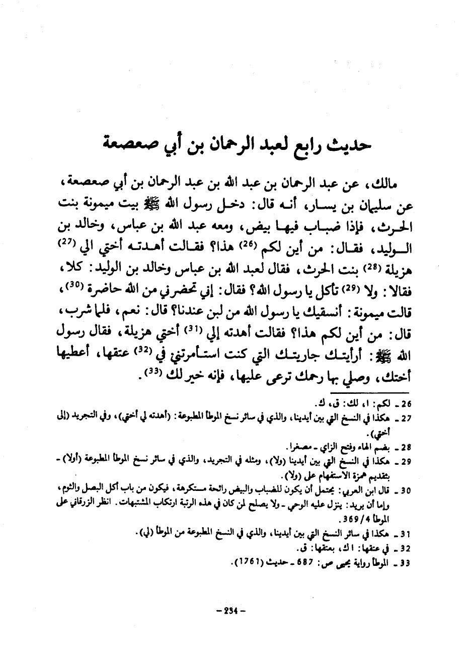 حديث رابع لعبد الرحمان بن أبي صعصعة مالك نع عبد الرحمان بن عبد الله بن عبد الرحمان بْنِ أَبِي صَعْصَعَةَ عَنْ سُلَيْمَانَ بْنِ يَسَارٍ أَنَّهُ قَالَ دَخَلَ رَسُولُ اللَّهِ صَلَّى اللَّهُ عَلَيْهِ وَسَلَّمَ بيت ميمونة بنت الحرث فَإِذَا ضِبَابٌ فِيهَا بَيْضٌ وَمَعَهُ عَبْدُ اللَّهِ بن عباس وخالد بن الوليد فقال كمن أين لكم هذا فقالت أهدته أختي إلي هزيلة بنت الحرث فقال عَبْدُ اللَّهِ بْنُ عَبَّاسٍ وَخَالِدُ بْنُ الْوَلِيدِ كُلَا فَقَالَا وَلَا تَأْكُلُ يَا رَسُولَ اللَّهِ فَقَالَ إِنِّي تَحْضُرُنِي مِنَ اللَّهِ حَاضِرَةٌ قَالَتْ مَيْمُونَةُ أَنَسْقِيكَ يَا رَسُولَ اللَّهِ مِنْ لَبَنٍ عِنْدَنَا قَالَ نَعَمْ فَلَمَّا شَرِبَ قَالَ مِنْ أَيْنَ لَكُمْ هَذَا فَقَالَتْ أَهْدَتْهُ إِلَيَّ أُخْتِي هُزَيْلَةُ فَقَالَ رَسُولُ اللَّهِ صَلَّى اللَّهُ عَلَيْهِ وَسَلَّمَ أَرَأَيْتُكِ جَارِيَتَكِ الَّتِي كُنْتِ اسْتَأْمَرْتِنِي فِي عِتْقِهَا أَعْطِيهَا أُخْتَكِ وَصِلِي بِهَا رَحِمَكِ تَرْعَى عَلَيْهَا فَإِنَّهُ خَيْرٌ لَكِ