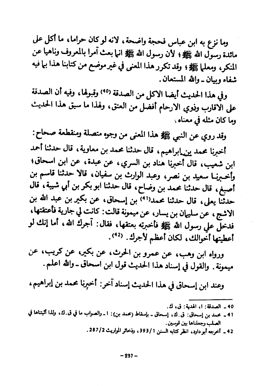 وَمَا نَزَعَ بِهِ ابْنُ عَبَّاسٍ فَحُجَّةٌ وَاضِحَةٌ لِأَنَّهُ لَوْ كَانَ حَرَامًا مَا أُكِلَ عَلَى مَائِدَةِ رَسُولُ اللَّهِ صَلَّى اللَّهُ عَلَيْهِ وَسَلَّمَ لِأَنْ رَسُولَ اللَّهِ صَلَّى اللَّهُ عَلَيْهِ وَسَلَّمَ إِنَّمَا بُعِثَ آمِرًا بِالْمَعْرُوفِ وَنَاهِيًا عَنِ الْمُنْكَرِ وَمُعَلِّمًا صَلَّى اللَّهُ عَلَيْهِ وَسَلَّمَ وَقَدْ تَكَرَّرَ هَذَا الْمَعْنَى فِي غَيْرِ مَوْضِعٍ مِنْ كِتَابِنَا هَذَا بِمَا فِيهِ شِفَاءٌ وَبَيَانٌ وَاللَّهُ الْمُسْتَعَانُ وَفِي هَذَا الْحَدِيثِ أَيْضًا الْأَكْلُ مِنَ الصَّدَقَةِ وَقَبُولُهَا وَفِيهِ أَنَّ الصَّدَقَةَ عَلَى الْأَقَارِبِ وَذَوِي الْأَرْحَامِ أَفْضَلُ مِنَ الْعِتْقِ وَلِهَذَا مَا سِيقَ هَذَا الْحَدِيثُ وَمَا كَانَ مِثْلَهُ فِي مَعْنَاهُ وَقَدْ رُوِيَ عَنِ النَّبِيِّ صَلَّى اللَّهُ عَلَيْهِ وَسَلَّمَ هَذَا الْمَعْنَى مِنْ وُجُوهٍ مُتَّصِلَةٍ وَمُنْقَطِعَةٍ صِحَاحٍ أَخْبَرَنَا مُحَمَّدُ بْنُ إِبْرَاهِيمَ قَالَ حَدَّثَنَا مُحَمَّدُ بْنُ معاوية قال حدثنا أحمد ابن شُعَيْبٍ قَالَ أَخْبَرَنَا هَنَّادُ بْنُ السُّرِّيِّ عَنْ عَبْدَةَ عَنِ ابْنِ إِسْحَاقَ وَأَخْبَرَنَا سَعِيدُ بْنُ نَصْرٍ وَعَبْدُ الْوَارِثِ بْنُ سُفْيَانَ قَالَا حَدَّثَنَا قَاسِمُ بْنُ أَصْبَغَ قَالَ حَدَّثَنَا مُحَمَّدُ بْنُ وَضَّاحٍ قَالَ حَدَّثَنَا أَبُو بَكْرِ بْنُ أَبِي شَيْبَةَ قَالَ حَدَّثَنَا يَعْلَى قَالَ حَدَّثَنَا مُحَمَّدُ بْنُ إِسْحَاقَ عَنْ بُكَيْرِ بْنِ عَبْدِ اللَّهِ بْنِ الْأَشَجِّ عَنْ سُلَيْمَانَ بْنِ يَسَارٍ عَنْ مَيْمُونَةَ قَالَتْ كَانَتْ لِي جَارِيَةٌ فَأَعْتَقْتُهَا فَدَخَلَ عَلَيَّ رَسُولُ اللَّهِ صَلَّى اللَّهُ عَلَيْهِ وَسَلَّمَ فَأَخْبَرْتُهُ بِعِتْقِهَا فَقَالَ آجَرَكِ اللَّهُ أَمَا إِنَّكِ لَوْ أَعْطَيْتِهَا أخوالك لكان أعظم لجرك ورواه ابْنُ وَهْبٍ عَنْ عَمْرِو بْنِ الْحَرْثِ عَنْ بُكَيْرٍ عَنْ كُرَيْبٍ عَنْ مَيْمُونَةَ وَالْقَوْلُ فِي إِسْنَادِ هَذَا الْحَدِيثِ قَوْلُ ابْنِ إِسْحَاقَ وَاللَّهُ أَعْلَمُ وَعِنْدَ ابْنِ إِسْحَاقَ فِي هَذَا الْحَدِيثِ إِسْنَادٌ آخَرُ أَخْبَرَنَا مُحَمَّدُ بْنُ إِبْرَاهِيمَ