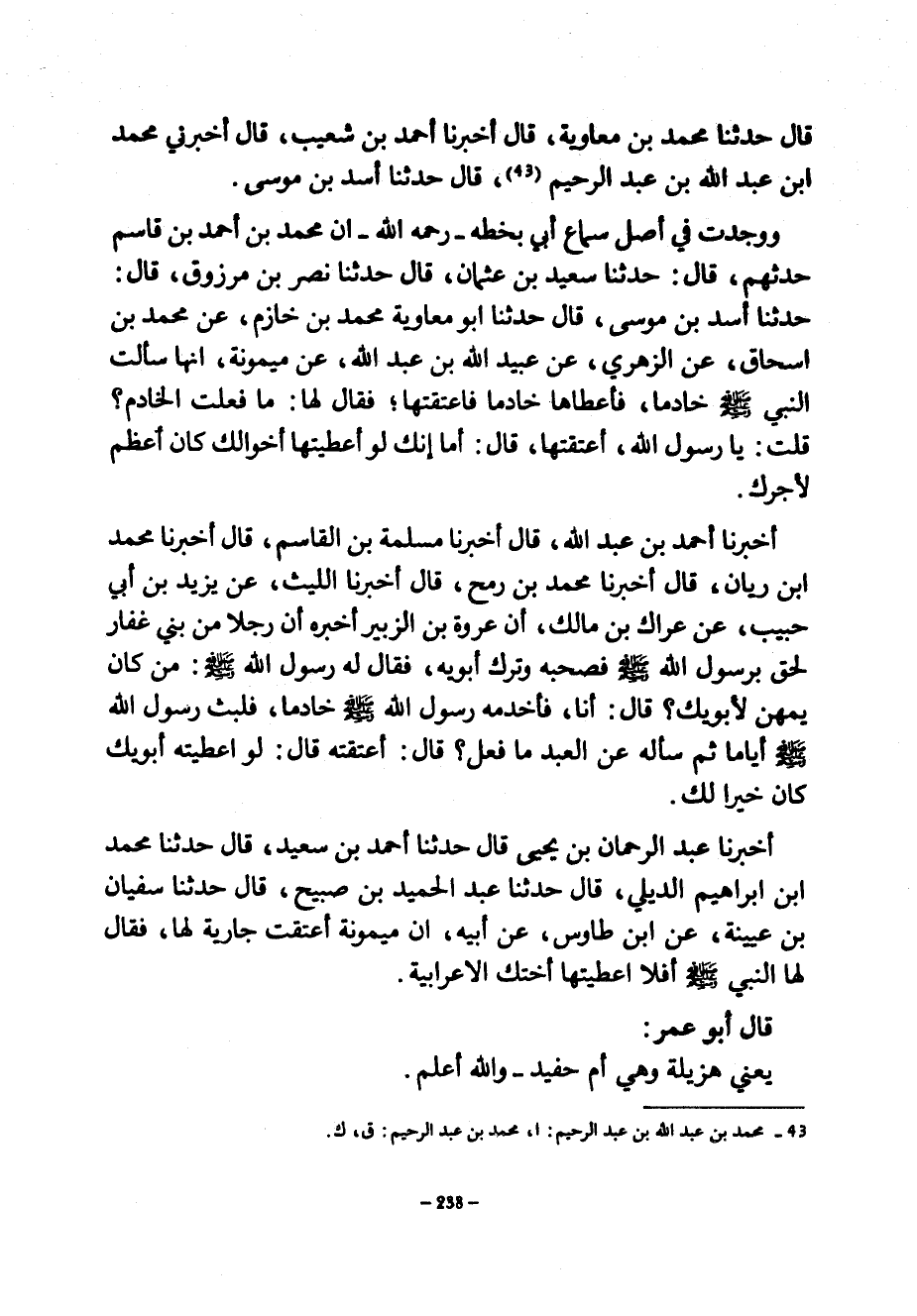 قَالَ حَدَّثَنَا مُحَمَّدُ بْنُ مُعَاوِيَةَ قَالَ أَخْبَرَنَا أَحْمَدُ بْنُ شعيب قال أخبرني محمد ابن عَبْدِ اللَّهِ بْنِ عَبْدِ الرَّحِيمِ قَالَ حَدَّثَنَا أَسَدُ بْنُ مُوسَى وَوَجَدْتُ فِي أَصْلِ سَمَاعِ أَبِي بِخَطِّهِ رَحِمَهُ اللَّهُ أَنَّ مُحَمَّدَ بْنَ أَحْمَدَ بْنِ قَاسِمٍ حَدَّثَهُمْ قَالَ حَدَّثَنَا سَعِيدُ بْنُ عُثْمَانَ قَالَ حَدَّثَنَا نَصْرُ بْنُ مَرْزُوقٍ قَالَ حَدَّثَنَا أَسَدُ بْنُ مُوسَى قَالَ حَدَّثَنَا أَبُو مُعَاوِيَةَ مُحَمَّدُ بْنُ خَازِمٍ عَنْ مُحَمَّدِ بْنِ إِسْحَاقَ عَنِ الزُّهْرِيِّ عَنْ عُبَيْدِ اللَّهِ بْنِ عَبْدِ اللَّهِ عَنْ مَيْمُونَةَ أَنَّهَا سَأَلَتِ النَّبِيَّ صَلَّى اللَّهُ عَلَيْهِ وَسَلَّمَ خَادِمًا فَأَعْطَاهَا خَادِمًا فَأَعْتَقَتْهَا فَقَالَ لَهَا مَا فَعَلَتِ الْخَادِمُ قُلْتُ يَا رَسُولَ اللَّهِ أَعْتَقْتُهَا قَالَ أَمَا إِنَّكِ لَوْ أَعْطَيْتِهَا أَخْوَالَكِ كَانَ أَعْظَمَ لِأَجْرِكِ أَخْبَرَنَا أَحْمَدُ بْنُ عَبْدِ اللَّهِ قَالَ أَخْبَرَنَا مسلمة بن القاسم قال أخبرنا محمد ابن رَيَّانَ قَالَ أَخْبَرَنَا مُحَمَّدُ بْنُ رُمْحٍ قَالَ أَخْبَرَنَا اللَّيْثُ عَنْ يَزِيدَ بْنِ أَبِي حَبِيبٍ عَنْ عِرَاكِ بْنِ مَالِكٍ أَنَّ عُرْوَةَ بْنَ الزُّبَيْرِ أَخْبَرَهُ أَنَّ رَجُلًا مِنْ بَنِي غِفَارٍ لَحِقَ بِرَسُولِ اللَّهِ صَلَّى اللَّهُ عَلَيْهِ وَسَلَّمَ فَصَحِبَهُ وَتَرَكَ أَبَوَيْهِ فَقَالَ لَهُ رَسُولُ اللَّهِ صَلَّى اللَّهُ عَلَيْهِ وَسَلَّمَ مَنْ كَانَ يَمْهُنُ لِأَبَوَيْكَ قَالَ أَنَا فَأَخْدَمَهُ رَسُولُ اللَّهِ صَلَّى اللَّهُ عَلَيْهِ وَسَلَّمَ خَادِمًا فَلَبِثَ رَسُولُ اللَّهِ صَلَّى اللَّهُ عَلَيْهِ وَسَلَّمَ أَيَّامًا ثُمَّ سَأَلَهُ عَنِ الْعَبْدِ مَا فَعَلَ قَالَ أَعْتَقْتُهُ قَالَ لَوْ أَعْطَيْتَهُ أَبَوَيْكَ كَانَ خَيْرًا لَكَ أَخْبَرَنَا عبد الرحمان بْنُ يَحْيَى قَالَ حَدَّثَنَا أَحْمَدُ بْنُ سَعِيدٍ قَالَ حَدَّثَنَا محمد ابن إِبْرَاهِيمَ الدِّيلِيُّ قَالَ حَدَّثَنَا عَبْدُ الْحَمِيدِ بْنُ صُبَيْحٍ قَالَ حَدَّثَنَا سُفْيَانُ بْنُ عُيَيْنَةَ عَنِ ابْنِ طَاوُسٍ عَنْ أَبِيهِ أَنَّ مَيْمُونَةَ أَعْتَقَتْ جَارِيَةً لَهَا فَقَالَ لَهَا النَّبِيُّ صَلَّى اللَّهُ عَلَيْهِ وَسَلَّمَ أَفَلَا أَعْطَيْتِهَا أُخْتَكِ الْأَعْرَابِيَّةَ قَالَ أَبُو عُمَرَ يَعْنِي هُزَيْلَةَ وَهِيَ أُمُّ حُفَيْدٍ والله أعلم