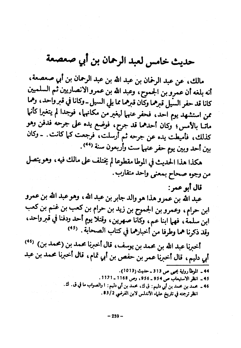 حديث خامس لعبد الرحمان بن أبي صعصعة مالك عن عبد الرحمان بن عبد الله بن عبد الرحمان بْنِ أَبِي صَعْصَعَةَ أَنَّهُ بَلَغَهُ أَنْ عَمْرَو بْنَ الْجَمُوحِ وَعَبْدَ اللَّهِ بْنَ عَمْرٍو الْأَنْصَارِيَّيْنِ ثُمَّ السُّلَمِيَّيْنِ كَانَا قَدْ حَفَرَ السَّيْلُ قَبْرَهُمَا وَكَانَ قَبْرُهُمَا مِمَّا يَلِي السَّيْلَ وَكَانَا فِي قَبْرٍ وَاحِدٍ وَهُمَا مِمَّنِ اسْتُشْهِدَ يَوْمَ أُحُدٍ فَحَفَرَ عَنْهُمَا لِيُغَيِّرَ مِنْ مَكَانِهِمَا فَوُجِدَا لَمْ يَتَغَيَّرَا كَأَنَّمَا مَاتَا بِالْأَمْسِ وَكَانَ أَحَدُهُمَا قَدْ جُرِحَ فَوَضَعَ يَدَهُ عَلَى جُرْحِهِ فَدُفِنَ وَهُوَ كَذَلِكَ فَأُمِيطَتْ يَدُهُ عَنْ جُرْحِهِ ثُمَّ أُرْسِلَتْ فَرَجَعَتْ كَمَا كَانَتْ وَكَانَ بَيْنَ أُحُدٍ وَبَيْنَ يَوْمِ حُفِرَ عَنْهُمَا سِتٌّ وَأَرْبَعُونَ سَنَةً هَكَذَا هَذَا الْحَدِيثُ فِي الْمُوَطَّأِ مَقْطُوعًا لَمْ يُخْتَلَفْ عَلَى مَالِكٍ فِيهِ وَهُوَ يَتَّصِلُ مِنْ وُجُوهٍ صِحَاحٍ بِمَعْنًى وَاحِدٍ مُتَقَارِبٍ قَالَ أَبُو عُمَرَ عَبْدُ اللَّهِ بْنُ عَمْرٍو هَذَا هُوَ وَالِدُ جَابِرِ بْنِ عَبْدِ اللَّهِ وَهُوَ عَبْدُ اللَّهِ بن عمرو ابن حرام وعمرو بن الجموح بن زَيْدِ بْنِ حَرَامِ بْنِ كَعْبِ بْنِ غَنْمِ بن كعب ابن سَلَمَةَ فَهُمَا ابْنَا عَمٍّ وَكَانَا صِهْرَيْنِ وَقُتِلَا يَوْمَ أُحُدٍ وَدُفِنَا فِي قَبْرٍ وَاحِدٍ وَقَدْ ذكرناهما وطرفا من أخبراهما فِي كِتَابِ الصَّحَابَةِ أَخْبَرَنَا عَبْدُ اللَّهِ بْنُ مُحَمَّدِ بْنِ يُوسُفَ قَالَ أَخْبَرَنَا مُحَمَّدُ بْنُ (مُحَمَّدِ بْنِ) أَبِي دُلَيْمٍ قَالَ أَخْبَرَنَا عُمَرُ بْنُ حَفْصِ بْنِ أَبِي تَمَّامٍ قَالَ أَخْبَرَنَا مُحَمَّدُ بْنُ عَبْدِ