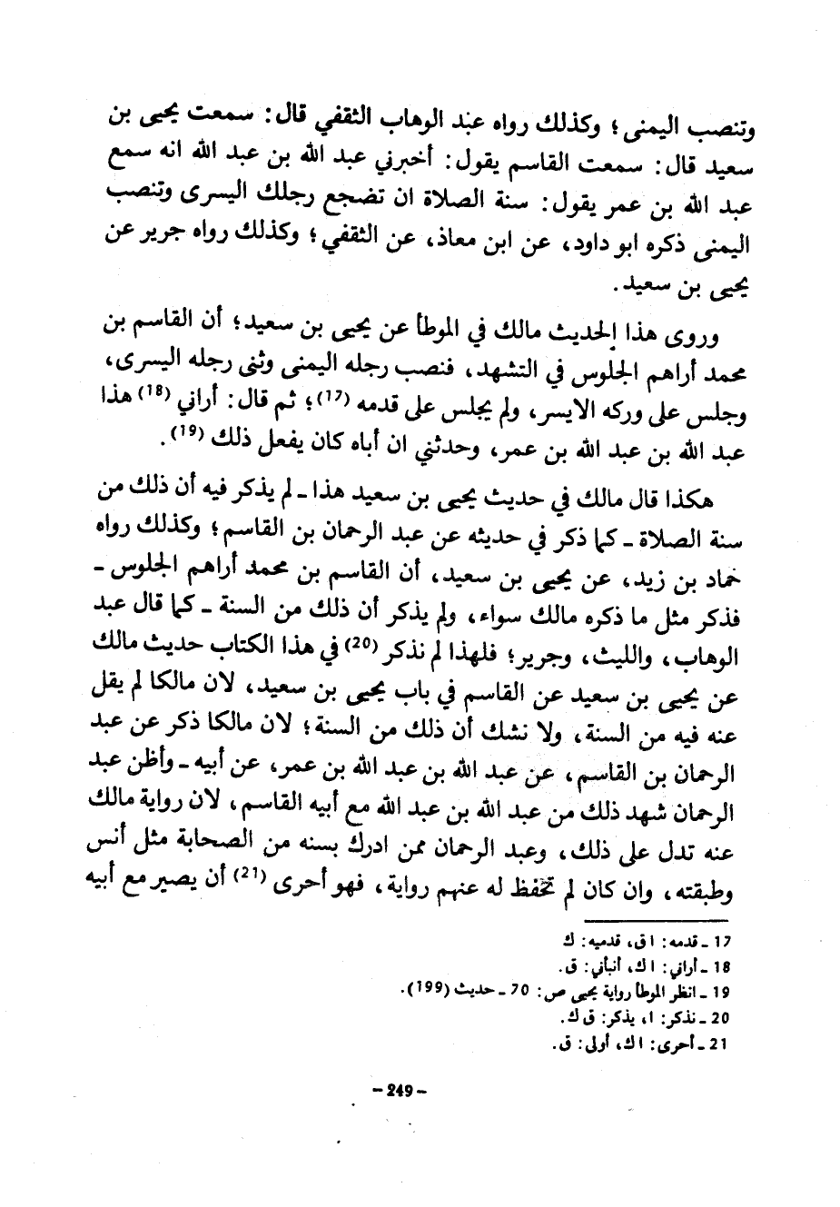وَتَنْصِبَ الْيُمْنَى وَكَذَلِكَ رَوَاهُ عَبْدُ الْوَهَّابِ الثَّقَفِيُّ قَالَ سَمِعْتُ يَحْيَى بْنَ سَعِيدٍ قَالَ سَمِعْتُ الْقَاسِمَ يَقُولُ أَخْبَرَنِي عَبْدُ اللَّهِ بْنُ عَبْدِ اللَّهِ أَنَّهُ سَمِعَ عَبْدَ اللَّهِ بْنَ عُمَرَ يَقُولُ سُنَّةُ الصَّلَاةِ أَنْ تُضْجِعَ رِجْلَكَ الْيُسْرَى وتنصب اليمنى ذكره أبو داود عن بن مُعَاذٍ عَنِ الثَّقَفِيِّ وَكَذَلِكَ رَوَاهُ جَرِيرٌ عَنْ يَحْيَى بْنِ سَعِيدٍ وَرَوَى هَذَا الْحَدِيثَ مَالِكٌ فِي الْمُوَطَّأِ عَنْ يَحْيَى بْنِ سَعِيدٍ أَنَّ الْقَاسِمَ بْنَ مُحَمَّدٍ أَرَاهُمُ الْجُلُوسَ فِي التَّشَهُّدِ فَنَصَبَ رِجْلَهُ الْيُمْنَى وَثَنَى رِجْلَهُ الْيُسْرَى وَجَلَسَ عَلَى وَرِكِهِ الْأَيْسَرِ وَلَمْ يَجْلِسْ عَلَى قَدَمِهِ ثُمَّ قَالَ أَرَانِي هَذَا عَبْدِ اللَّهِ بْنِ عَبْدِ اللَّهِ بْنِ عُمَرَ وَحَدَّثَنِي أَنَّ أَبَاهُ كَانَ يَفْعَلُ ذَلِكَ هَكَذَا قَالَ مَالِكٌ فِي حَدِيثِ يَحْيَى بْنِ سَعِيدٍ هَذَا لَمْ يَذْكُرْ فِيهِ أَنَّ ذَلِكَ مِنْ سُنَّةِ الصَّلَاةِ كَمَا ذكر في حديثه عن عبد الرحمان بْنِ الْقَاسِمِ وَكَذَلِكَ رَوَاهُ حَمَّادُ بْنُ زَيْدٍ عَنْ يَحْيَى بْنِ سَعِيدٍ أَنَّ الْقَاسِمَ بْنَ مُحَمَّدٍ أَرَاهُمُ الْجُلُوسَ فَذَكَرَ مِثْلَ مَا ذَكَرَهُ مَالِكٌ سَوَاءً وَلَمْ يَذْكُرْ أَنَّ ذَلِكَ مِنَ السُّنَّةِ كَمَا قَالَ عَبْدُ الْوَهَّابِ وَاللَّيْثُ وَجَرِيرٌ فَلِهَذَا لَمْ نَذْكُرْ فِي هَذَا الْكِتَابِ حَدِيثَ مَالِكٍ عَنْ يَحْيَى بْنِ سَعِيدٍ عَنِ الْقَاسِمِ فِي بَابِ يَحْيَى بْنِ سَعِيدٍ لِأَنَّ مَالِكًا لَمْ يَقُلْ عَنْهُ فِيهِ مِنَ السُّنَّةِ وَلَا نَشُكُّ أَنَّ ذَلِكَ مِنَ السُّنَّةِ لِأَنَّ مَالِكًا ذكر عن عبد الرحمان بْنِ الْقَاسِمِ عَنْ عَبْدِ اللَّهِ بْنِ عَبْدِ اللَّهِ بْنِ عُمَرَ عَنْ أَبِيهِ وَأَظُنُّ عَبْدَ الرحمان شَهِدَ ذَلِكَ مِنْ عَبْدِ اللَّهِ بْنِ عَبْدِ اللَّهِ مَعَ أَبِيهِ الْقَاسِمِ لِأَنَّ رِوَايَةَ مَالِكٍ عنه تدل على ذلك وعبد الرحمان مِمَّنْ أَدْرَكَ بِسِنِّهِ مِنَ الصَّحَابَةِ مِثْلَ أَنَسٍ وَطَبَقَتِهِ وَإِنْ كَانَ لَمْ تُحْفَظْ لَهُ عَنْهُمْ رِوَايَةٌ فَهُوَ أَحْرَى أَنْ يَصِيرَ مَعَ أَبِيهِ