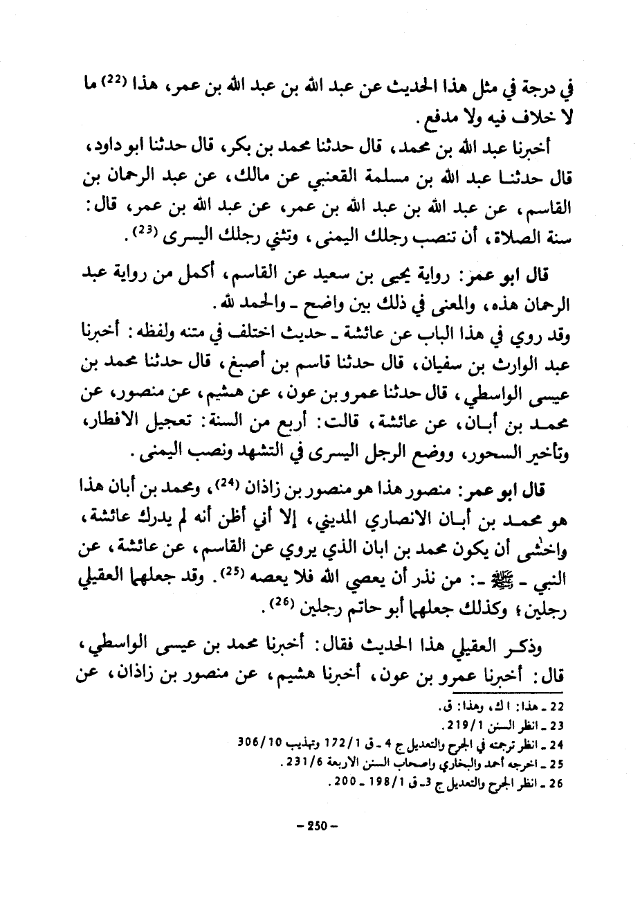 فِي دَرَجَةٍ فِي مِثْلِ هَذَا الْحَدِيثَ عَنْ عَبْدِ اللَّهِ بْنِ عَبْدِ اللَّهِ بْنِ عمر هَذَا مَا لَا خِلَافَ فِيهِ وَلَا مَدْفَعَ أَخْبَرَنَا عَبْدُ اللَّهِ بْنُ مُحَمَّدٍ قَالَ حَدَّثَنَا مُحَمَّدُ بْنُ بَكْرٍ قَالَ حَدَّثَنَا أَبُو دَاوُدَ قَالَ حَدَّثَنَا عَبْدُ اللَّهِ بْنُ مَسْلَمَةَ الْقَعْنَبِيُّ عن مالك عن عبد الرحمان بْنِ الْقَاسِمِ عَنْ عَبْدِ اللَّهِ بْنِ عَبْدِ اللَّهِ بْنِ عُمَرَ عَنْ عَبْدِ اللَّهِ بْنِ عُمَرَ قَالَ سُنَّةُ الصَّلَاةِ أَنْ تَنْصِبَ رِجْلَكَ الْيُمْنَى وَتَثْنِيَ رِجْلَكَ الْيُسْرَى قَالَ أَبُو عُمَرَ رِوَايَةُ يَحْيَى بْنِ سَعِيدٍ عَنِ الْقَاسِمِ أَكْمَلُ من رواية عبد الرحمان هَذِهِ وَالْمَعْنَى فِي ذَلِكَ بَيَّنٌ وَاضِحٌ وَالْحَمْدُ لِلَّهِ وَقَدْ رُوِيَ فِي هَذَا الْبَابِ عَنْ عَائِشَةَ حَدِيثٌ اخْتُلِفَ فِي مَتْنِهِ وَلَفْظِهِ أَخْبَرَنَا عَبْدُ الْوَارِثِ بْنُ سُفْيَانَ قَالَ حَدَّثَنَا قَاسِمُ بْنُ أَصْبَغَ قَالَ حَدَّثَنَا مُحَمَّدُ بْنُ عِيسَى الْوَاسِطِيُّ قَالَ حَدَّثَنَا عَمْرُو بْنُ عَوْنٍ عَنْ هُشَيْمٍ عَنْ مَنْصُورٍ عَنْ مُحَمَّدِ بْنِ أَبَانٍ عَنْ عَائِشَةَ قَالَتْ أَرْبَعٌ مِنَ السُّنَّةِ تَعْجِيلُ الْإِفْطَارِ وَتَأْخِيرُ السُّحُورِ وَوَضْعُ الرِّجْلِ الْيُسْرَى فِي التَّشَهُّدِ وَنَصْبُ الْيُمْنَى قَالَ أَبُو عُمَرَ مَنْصُورٌ هَذَا هُوَ مَنْصُورُ بْنُ زَاذَانَ وَمُحَمَّدُ بْنُ أَبَانٍ هَذَا هُوَ مُحَمَّدُ بْنُ أَبَانٍ الْأَنْصَارِيُّ الْمَدِينِيُّ إِلَّا أَنِّي أَظُنُّ أَنَّهُ لَمْ يُدْرِكْ عَائِشَةَ وَأَخْشَى أَنْ يَكُونَ مُحَمَّدَ بْنَ أَبَانٍ الَّذِي يَرْوِي عَنِ الْقَاسِمِ عَنْ عَائِشَةَ عَنِ النَّبِيِّ صَلَّى اللَّهُ عَلَيْهِ وَسَلَّمَ مَنْ نَذَرَ أَنْ يَعْصِيَ اللَّهَ فَلَا يَعْصِهِ وَقَدْ جَعَلَهُمَا الْعُقَيْلِيُّ رَجُلَيْنِ وَكَذَلِكَ جَعَلَهُمَا أَبُو حَاتِمٍ رَجُلَيْنِ وَذَكَرَ الْعُقَيْلِيُّ هَذَا الْحَدِيثَ فَقَالَ أَخْبَرَنَا مُحَمَّدُ بْنُ عِيسَى الْوَاسِطِيُّ قَالَ أَخْبَرَنَا عَمْرُو بْنُ عَوْنٍ أَخْبَرَنَا هُشَيْمٌ عَنْ مَنْصُورِ بْنِ زَاذَانَ عن