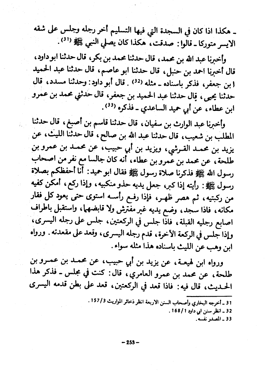 هَكَذَا إِذَا كَانَ فِي السَّجْدَةِ الَّتِي فِيهَا التسليم أخر رجله رجلس عَلَى شِقِّهِ الْأَيْسَرِ مُتَوَرِّكًا قَالُوا صَدَقْتَ هَكَذَا كَانَ يُصَلِّي النَّبِيِّ صَلَّى اللَّهُ عَلَيْهِ وَسَلَّمَ وَأَخْبَرَنَا عَبْدُ اللَّهِ بْنُ مُحَمَّدٍ قَالَ حَدَّثَنَا مُحَمَّدُ بْنُ بَكْرٍ قَالَ حَدَّثَنَا أَبُو دَاوُدَ قَالَ أَخْبَرَنَا أَحْمَدُ بْنُ حَنْبَلٍ قَالَ حَدَّثَنَا أَبُو عَاصِمٍ قَالَ حَدَّثَنَا عَبْدُ الحميد ابن جَعْفَرٍ فَذَكَرَ بِإِسْنَادِهِ مِثْلَهُ قَالَ أَبُو دَاوُدَ وَحَدَّثَنَا مُسَدَّدٌ قَالَ حَدَّثَنَا يَحْيَى قَالَ حَدَّثَنَا عَبْدُ الْحَمِيدِ بْنُ جَعْفَرٍ قَالَ حَدَّثَنِي مُحَمَّدُ بن عمرو ابن عَطَاءٍ عَنْ أَبِي حُمَيْدٍ السَّاعِدِيِّ فَذَكَرَهُ وَأَخْبَرَنَا عَبْدُ الْوَارِثِ بْنُ سُفْيَانَ قَالَ حَدَّثَنَا قَاسِمُ بْنُ أَصْبَغَ قَالَ حَدَّثَنَا الْمُطَّلِبُ بْنُ شُعَيْبٍ قَالَ حَدَّثَنَا عَبْدُ اللَّهِ بْنُ صَالِحٍ قَالَ حَدَّثَنَا اللَّيْثُ عَنْ يَزِيدَ بْنِ مُحَمَّدٍ الْقُرَشِيِّ وَيَزِيدَ بْنِ أَبِي حَبِيبٍ عَنْ مُحَمَّدِ بْنِ عمرو بن طلحة عن محمد بن عمرو بْنِ عَطَاءٍ أَنَّهُ كَانَ جَالِسًا مَعَ نَفَرٍ مِنْ أَصْحَابِ رَسُولِ اللَّهِ صَلَّى اللَّهُ عَلَيْهِ وَسَلَّمَ فَذَكَرْنَا صَلَاةَ رَسُولِ اللَّهِ صَلَّى اللَّهُ عَلَيْهِ وَسَلَّمَ فَقَالَ أَبُو حُمَيْدٍ أَنَا أَحْفَظُكُمْ بِصَلَاةِ رَسُولِ اللَّهِ صَلَّى اللَّهُ عَلَيْهِ وَسَلَّمَ رَأَيْتُهُ إِذَا كَبَّرَ جَعَلَ يَدَيْهِ حَذْوَ مَنْكِبَيْهِ وإذا كرع أمكن كفيه من ركبتيه ثم هصر ظهر فَإِذَا رَفَعَ رَأْسَهُ اسْتَوَى حَتَّى يَعُودَ كُلُّ فَقَارٍ مَكَانَهُ فَإِذَا سَجَدَ وَضَعَ يَدَيْهِ غَيْرَ مُفْتَرِشٍ وَلَا قَابِضَهُمَا وَاسْتَقْبَلَ بِأَطْرَافِ أَصَابِعِ رِجْلَيْهِ الْقِبْلَةَ فَإِذَا جَلَسَ فِي الرَّكْعَتَيْنِ جَلَسَ عَلَى رِجْلِهِ الْيُسْرَى وَإِذَا جَلَسَ فِي الرَّكْعَةِ الْآخِرَةِ قَدَّمَ رِجْلَهُ الْيُسْرَى وَقَعَدَ عَلَى مَقْعَدَتِهِ وَرَوَاهُ ابْنُ وَهْبٍ عَنِ اللَّيْثِ بِإِسْنَادِهِ هَذَا مِثْلَهُ سَوَاءً وَرَوَاهُ ابْنُ لَهِيعَةَ عَنْ يَزِيدَ بْنِ أَبِي حَبِيبٍ عَنْ مُحَمَّدِ بْنِ عَمْرِو بْنِ طَلْحَةَ عَنْ مُحَمَّدِ بْنِ عَمْرٍو الْعَامِرِيِّ قَالَ كُنْتُ فِي مَجْلِسٍ فَذَكَرَ هَذَا الْحَدِيثَ قَالَ فِيهِ فَإِذَا قَعَدَ فِي الرَّكْعَتَيْنِ قَعَدَ عَلَى بَطْنِ قَدَمِهِ الْيُسْرَى
