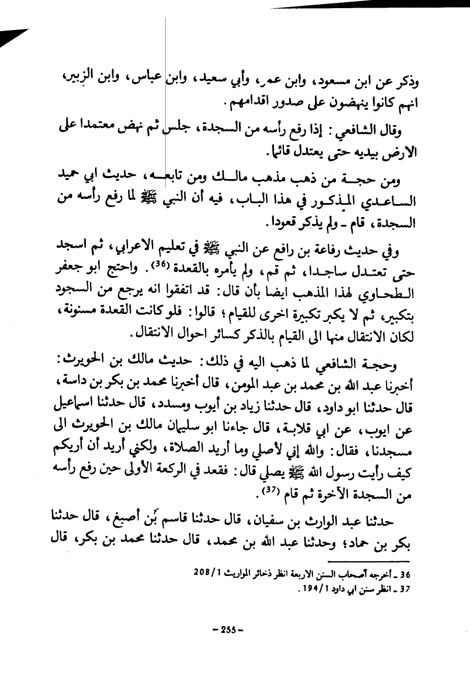 وَذُكِرَ عَنِ ابْنِ مَسْعُودٍ وَابْنِ عُمَرَ وَأَبِي سَعِيدٍ وَابْنِ عَبَّاسٍ وَابْنِ الزُّبَيْرِ أَنَّهُمْ كَانُوا يَنْهَضُونَ عَلَى صُدُورِ أَقْدَامِهِمْ وَقَالَ الشَّافِعِيُّ إِذَا رَفَعَ رَأْسَهُ مِنَ السَّجْدَةِ جَلَسَ ثُمَّ نَهَضَ مُعْتَمِدًا عَلَى الْأَرْضِ بِيَدَيْهِ حَتَّى يَعْتَدِلَ قَائِمًا وَمِنْ حُجَّةِ مَنْ ذَهَبَ مَذْهَبَ مَالِكٍ وَمَنْ تَابَعَهُ حَدِيثُ أَبِي حُمَيْدٍ السَّاعِدِيِّ الْمَذْكُورُ فِي هَذَا الْبَابِ فِيهِ أَنَّ النَّبِيَّ صَلَّى اللَّهُ عَلَيْهِ وَسَلَّمَ لَمَّا رَفَعَ رَأْسَهُ مِنَ السَّجْدَةِ قَامَ وَلَمْ يَذْكُرْ قُعُودًا وَفِي حَدِيثِ رِفَاعَةَ بْنِ رَافِعٍ عَنِ النَّبِيِّ صَلَّى اللَّهُ عَلَيْهِ وَسَلَّمَ فِي تَعْلِيمِ الْأَعْرَابِيِّ ثُمَّ اسْجُدْ حَتَّى تَعْتَدِلَ سَاجِدًا ثُمَّ قُمْ وَلَمْ يَأْمُرْهُ بِالْقَعْدَةِ وَاحْتَجَّ أَبُو جَعْفَرٍ الطَّحَاوِيُّ لِهَذَا الْمَذْهَبِ أَيْضًا بِأَنْ قَالَ قَدِ اتَّفَقُوا أَنَّهُ يُرْجَعُ مِنَ السجود بتكبير ثم لا يكبر تكبيرة أُخْرَى لِلْقِيَامِ قَالُوا فَلَوْ كَانَتِ الْقَعْدَةُ مَسْنُونَةً لَكَانَ الِانْتِقَالُ مِنْهَا إِلَى الْقِيَامِ بِالذِّكْرِ كَسَائِرِ أَحْوَالِ الِانْتِقَالِ وَحُجَّةُ الشَّافِعِيِّ لِمَا ذَهَبَ إِلَيْهِ فِي ذَلِكَ حَدِيثُ مَالِكِ بْنِ الْحُوَيْرِثِ أَخْبَرَنَا عَبْدُ اللَّهِ بْنُ مُحَمَّدِ بْنِ عَبْدِ الْمُؤْمِنِ قَالَ أَخْبَرَنَا مُحَمَّدُ بْنُ بَكْرِ بْنِ دَاسَةَ قَالَ حَدَّثَنَا أَبُو دَاوُدَ قَالَ حَدَّثَنَا زِيَادُ بْنُ أَيُّوبَ وَمُسَدَّدٌ قَالَ حَدَّثَنَا إِسْمَاعِيلُ عَنْ أَيُّوبَ عَنْ أَبِي قِلَابَةَ قَالَ جَاءَنَا أَبُو سُلَيْمَانَ مَالِكُ بْنُ الْحُوَيْرِثِ إِلَى مَسْجِدِنَا فَقَالَ وَاللَّهِ إِنِّي لَأُصَلِّي وَمَا أُرِيدُ الصَّلَاةَ وَلَكِنِّي أُرِيدُ أَنْ أُرِيَكُمْ كَيْفَ رَأَيْتُ رَسُولَ اللَّهِ صَلَّى اللَّهُ عَلَيْهِ وَسَلَّمَ يُصَلِّي قَالَ فَقَعَدَ فِي الرَّكْعَةِ الْأُولَى حِينَ رَفَعَ رَأْسَهُ مِنَ السَّجْدَةِ الْآخِرَةِ ثُمَّ قَامَ حَدَّثَنَا عَبْدُ الْوَارِثِ بْنُ سُفْيَانَ قَالَ حَدَّثَنَا قَاسِمُ بْنُ أَصْبَغَ قَالَ حَدَّثَنَا بَكْرُ بْنُ حَمَّادٍ وَحَدَّثَنَا عَبْدُ اللَّهِ بْنُ مُحَمَّدٍ قَالَ حَدَّثَنَا مُحَمَّدُ بْنُ بَكْرٍ قَالَ