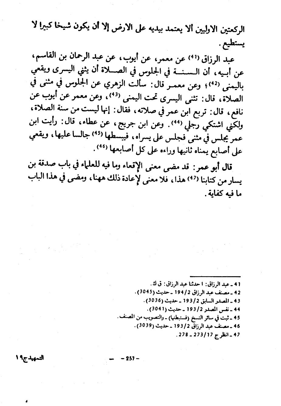الرَّكْعَتَيْنِ الْأُولَيَيْنِ أَلَّا يَعْتَمِدَ بِيَدَيْهِ عَلَى الْأَرْضِ إِلَّا أَنْ يَكُونَ شَيْخًا كَبِيرًا لَا يَسْتَطِيعُ عَبْدُ الرَّزَّاقِ عَنْ مَعْمَرٍ عَنْ أَيُّوبَ عَنْ عبد الرحمان بْنِ الْقَاسِمِ عَنْ أَبِيهِ أَنَّ السُّنَّةَ فِي الْجُلُوسِ فِي الصَّلَاةِ أَنْ يَثْنِيَ الْيُسْرَى وَيُقْعِيَ بِالْيُمْنَى وَعَنْ مَعْمَرٍ قَالَ سَأَلْتُ الزُّهْرِيَّ عَنِ الْجُلُوسِ فِي مَثْنًى فِي الصَّلَاةِ قَالَ تَثْنِي الْيُسْرَى تَحْتَ الْيُمْنَى وَعَنْ مَعْمَرٍ عَنْ أَيُّوبَ عَنْ نَافِعٍ قَالَ تَرَبَّعَ ابْنُ عُمَرَ فِي صَلَاتِهِ فَقَالَ إِنَّهَا لَيْسَتْ مِنْ سُنَّةِ الصَّلَاةِ وَلَكِنِّي أَشْتَكِي رِجْلِي وَعَنِ ابْنِ جُرَيْجٍ عَنْ عَطَاءٍ قَالَ رَأَيْتُ ابْنَ عُمَرَ يَجْلِسُ فِي مَثْنًى فَجَلَسَ عَلَى يُسْرَاهُ فَيَبْسُطُهَا جَالِسًا عَلَيْهَا وَيُقْعِي عَلَى أَصَابِعِ يُمْنَاهُ ثَانِيهَا وَرَاءَهُ عَلَى كُلِّ أَصَابِعِهَا قَالَ أَبُو عُمَرَ قَدْ مَضَى مَعْنَى الْإِقْعَاءِ وَمَا فِيهِ لِلْعُلَمَاءِ فِي بَابِ صَدَقَةَ بْنِ يَسَارٍ مِنْ كِتَابِنَا هَذَا فَلَا مَعْنَى لِإِعَادَةِ ذَلِكَ ههنا وَمَضَى فِي هَذَا الْبَابِ مَا فِيهِ كِفَايَةٌ