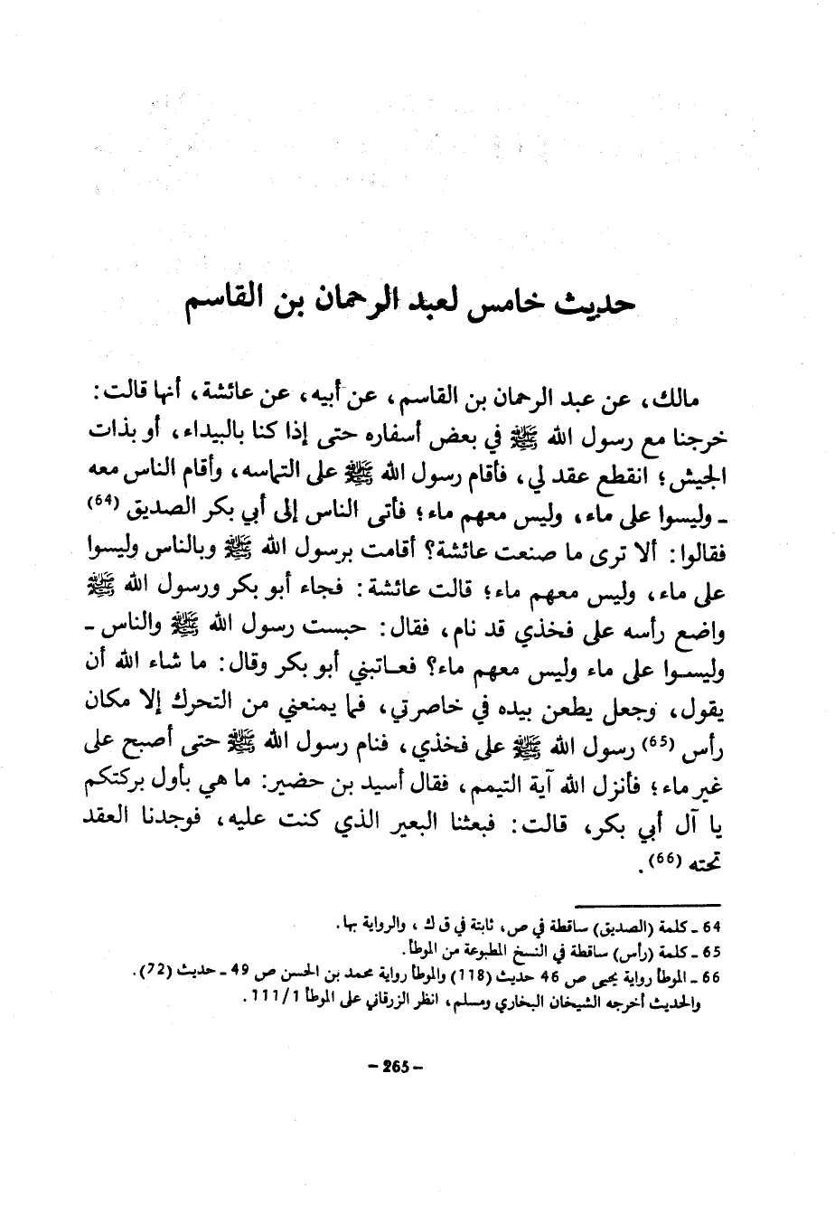 حديث خامس لعبد الرحمان بن القاسم مالك عن عبد الرحمان بْنِ الْقَاسِمِ عَنْ أَبِيهِ عَنْ عَائِشَةَ أَنَّهَا قَالَتْ خَرَجْنَا مَعَ رَسُولِ اللَّهِ صَلَّى اللَّهُ عَلَيْهِ وَسَلَّمَ فِي بَعْضِ أَسْفَارِهِ حَتَّى إِذَا كُنَّا بِالْبَيْدَاءِ أَوْ بِذَاتِ الْجَيْشِ انْقَطَعَ عِقْدٌ لِي فَأَقَامَ رَسُولُ اللَّهِ صَلَّى اللَّهُ عَلَيْهِ وَسَلَّمَ عَلَى الْتِمَاسِهِ وَأَقَامَ النَّاسُ مَعَهُ وَلَيْسُوا عَلَى مَاءٍ وَلَيْسَ مَعَهُمْ مَاءٌ فَأَتَى النَّاسُ إِلَى أَبِي بَكْرٍ الصِّدِّيقِ فَقَالُوا أَلَا تَرَى مَا صَنَعَتْ عَائِشَةُ أَقَامَتْ بِرَسُولِ اللَّهِ صَلَّى اللَّهُ عَلَيْهِ وَسَلَّمَ وَبِالنَّاسِ وَلَيْسُوا عَلَى مَاءٍ وَلَيْسَ مَعَهُمْ مَاءٌ قَالَتْ عَائِشَةُ فَجَاءَ أَبُو بَكْرٍ وَرَسُولُ اللَّهِ صَلَّى اللَّهُ عَلَيْهِ وَسَلَّمَ وَاضِعٌ رَأْسَهُ عَلَى فَخِذِي قَدْ نَامَ فَقَالَ حَبَسْتِ رَسُولُ اللَّهِ صَلَّى اللَّهُ عَلَيْهِ وَسَلَّمَ وَالنَّاسُ وَلَيْسُوا عَلَى مَاءٍ وَلَيْسَ مَعَهُمْ مَاءٌ فَعَاتَبَنِي أَبُو بَكْرٍ وَقَالَ مَا شَاءَ اللَّهُ أَنْ يَقُولَ وَجَعَلَ يَطْعَنُ بِيَدِهِ فِي خَاصِرَتِي فَمَا يَمْنَعُنِي مِنَ التَّحَرُّكِ إِلَّا مَكَانُ رَأْسَ رَسُولِ اللَّهِ صَلَّى اللَّهُ عَلَيْهِ وَسَلَّمَ على فَخِذِي فَنَامَ رَسُولُ اللَّهِ صَلَّى اللَّهُ عَلَيْهِ وَسَلَّمَ حَتَّى أَصْبَحَ عَلَى غَيْرِ مَاءٍ فَأَنْزَلَ اللَّهُ آيَةَ التَّيَمُّمِ فَقَالَ أُسَيْدُ بْنُ حُضَيْرٍ مَا هِيَ بِأَوَّلِ بَرَكَتِكُمْ يَا آلَ أَبِي بَكْرٍ قَالَتْ فَبَعَثْنَا الْبَعِيرَ الَّذِي كُنْتُ عَلَيْهِ فَوَجَدْنَا الْعِقْدَ تَحْتَهُ