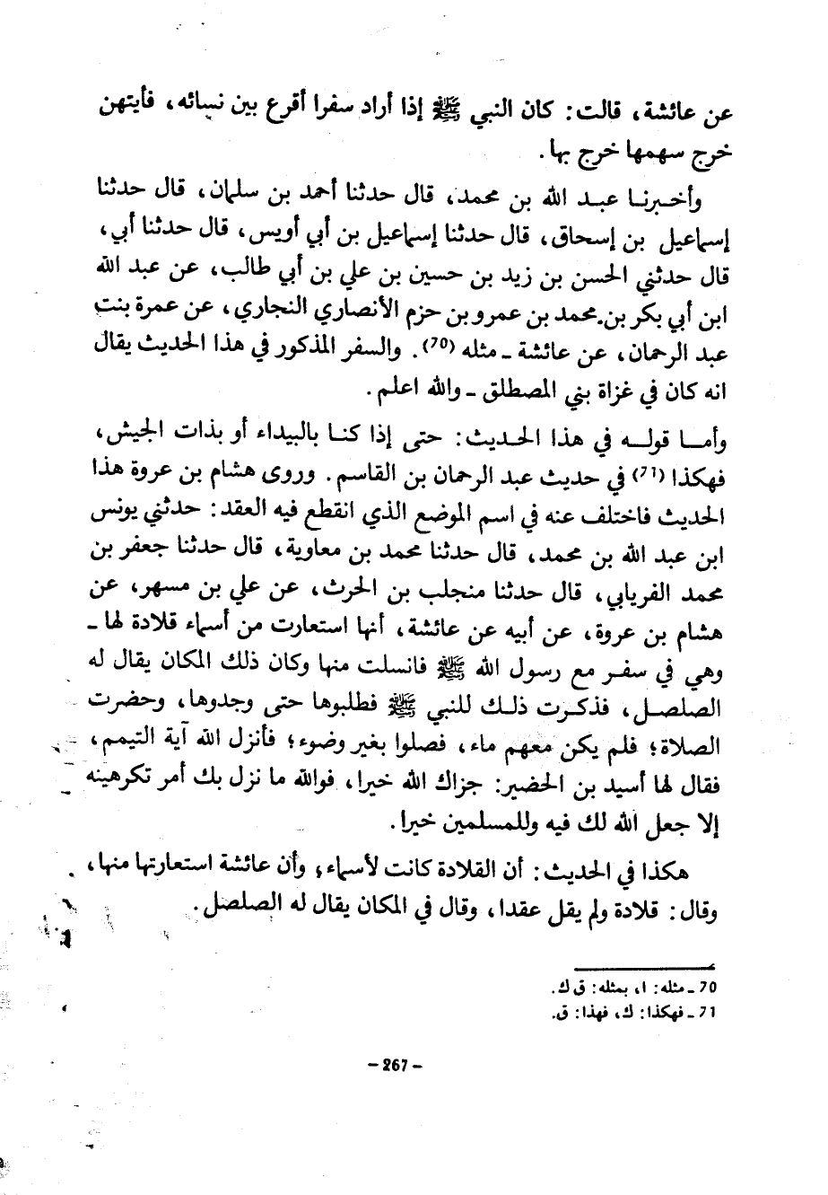 عَنْ عَائِشَةَ قَالَتْ كَانَ النَّبِيُّ صَلَّى اللَّهُ عَلَيْهِ وَسَلَّمَ إِذَا أَرَادَ سَفَرًا أَقْرَعَ بَيْنَ نِسَائِهِ فَأَيَّتُهُنَّ خَرَجَ سَهْمُهَا خَرَجَ بِهَا وَأَخْبَرَنَا عَبْدُ اللَّهِ بْنُ مُحَمَّدٍ قَالَ حَدَّثَنَا أَحْمَدُ بْنُ سَلْمَانَ قَالَ حَدَّثَنَا إِسْمَاعِيلُ بْنُ إِسْحَاقَ قَالَ حَدَّثَنَا إِسْمَاعِيلُ بْنُ أَبِي أُوَيْسٍ قَالَ حَدَّثَنَا أَبِي قَالَ حَدَّثَنِي الْحَسَنُ بْنُ زَيْدِ بْنِ حُسَيْنِ بْنِ عَلِيِّ بْنِ أَبِي طَالِبٍ عن عبد الله ابن أَبِي بَكْرِ بْنِ مُحَمَّدِ بْنِ عَمْرِو بْنِ حَزْمٍ الْأَنْصَارِيِّ النَّجَّارِيِّ عَنْ عَمْرَةَ بِنْتِ عَبْدِ الرحمان عَنْ عَائِشَةَ مِثْلَهُ وَالسَّفَرُ الْمَذْكُورُ فِي هَذَا الْحَدِيثِ يُقَالَ إِنَّهُ كَانَ فِي غَزَاةِ بَنِي الْمُصْطَلِقِ وَاللَّهُ أَعْلَمُ وَأَمَّا قَوْلُهُ فِي هَذَا الْحَدِيثِ حَتَّى إِذَا كُنَّا بِالْبَيْدَاءِ أَوْ بِذَاتِ الجيس فهكذا في حديث عبد الرحمان بْنِ الْقَاسِمِ وَرَوَى هِشَامُ بْنُ عُرْوَةَ هَذَا الْحَدِيثَ فَاخْتَلَفَ عَنْهُ فِي اسْمِ الْمَوْضِعِ الَّذِي انقطع فيه العقد حدثني يونس ابن عَبْدُ اللَّهِ بْنُ مُحَمَّدٍ قَالَ حَدَّثَنَا مُحَمَّدُ بْنُ مُعَاوِيَةَ قَالَ حَدَّثَنَا جَعْفَرُ بْنُ مُحَمَّدٍ الْفِرْيَابِيُّ قَالَ حَدَّثَنَا مُنْجَلِبُ بْنُ الْحَرْثِ عَنْ عَلِيُّ بْنُ مُسْهِرٍ عَنْ هِشَامِ بْنِ عُرْوَةَ عَنْ أَبِيهِ عَنْ عَائِشَةَ أَنَّهَا اسْتَعَارَتْ مِنْ أَسْمَاءَ قِلَادَةً لَهَا وَهِيَ فِي سَفَرٍ مَعَ رَسُولِ اللَّهِ صَلَّى اللَّهُ عَلَيْهِ وَسَلَّمَ فَانْسَلَّتْ مِنْهَا وَكَانَ ذَلِكَ الْمَكَانُ يُقَالَ لَهُ الصُّلْصُلُ فَذَكَرَتْ ذَلِكَ لِلنَّبِيِّ صَلَّى اللَّهُ عَلَيْهِ وَسَلَّمَ فَطَلَبُوهَا حَتَّى وَجَدُوهَا وَحَضَرَتِ الصَّلَاةُ فَلَمْ يَكُنْ مَعَهُمْ مَاءٌ فَصَلَّوْا بِغَيْرِ وُضُوءٍ فَأَنْزَلَ اللَّهُ آيَةَ التَّيَمُّمِ فَقَالَ لَهَا أُسَيْدُ بْنُ الْحُضَيْرِ جَزَاكِ اللَّهُ خَيْرًا فَوَاللَّهِ مَا نَزَلَ بِكِ أَمْرٌ تَكْرَهِينَهُ إِلَّا جَعَلَ اللَّهُ لَكِ فِيهِ وَلِلْمُسْلِمِينَ خَيْرًا هَكَذَا فِي الْحَدِيثِ أَنَّ الْقِلَادَةَ كَانَتْ لِأَسْمَاءَ وَأَنَّ عَائِشَةَ اسْتَعَارَتْهَا مِنْهَا وَقَالَ قِلَادَةً وَلَمْ يَقُلْ عِقْدًا وَقَالَ فِي الْمَكَانِ يُقَالَ لَهُ الصُّلْصُلُ