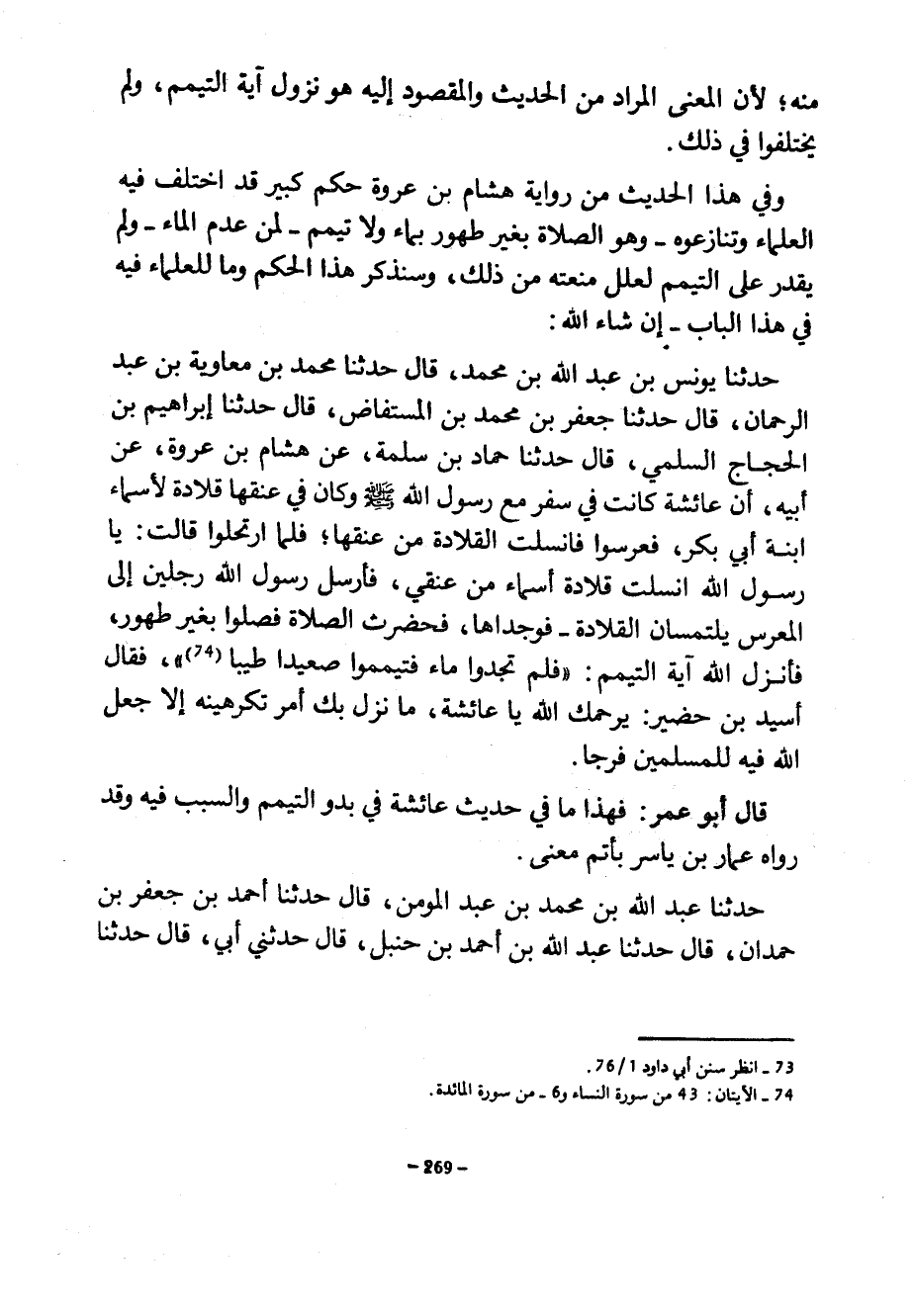 مِنْهُ لِأَنَّ الْمَعْنَى الْمُرَادَ مِنَ الْحَدِيثِ وَالْمَقْصُودَ إِلَيْهِ هُوَ نُزُولُ آيَةِ التَّيَمُّمِ وَلَمْ يَخْتَلِفُوا فِي ذَلِكَ وَفِي هَذَا الْحَدِيثِ مِنْ رِوَايَةِ هِشَامِ بْنِ عُرْوَةَ حُكْمٌ كَبِيرٌ قَدِ اخْتَلَفَ فِيهِ الْعُلَمَاءُ وَتَنَازَعُوهُ وَهُوَ الصَّلَاةُ بِغَيْرِ طَهُورٍ بِمَاءٍ وَلَا تَيَمُّمَ لِمَنْ عَدِمَ الْمَاءَ وَلَمْ يَقْدِرْ عَلَى التَّيَمُّمِ لِعِلَلٍ مَنَعَتْهُ مِنْ ذَلِكَ وَسَنَذْكُرُ هَذَا الْحُكْمَ وَمَا لِلْعُلَمَاءِ فِيهِ فِي هذا الباب إن شاءالله حَدَّثَنَا يُونُسُ بْنُ عَبْدِ اللَّهِ بْنِ مُحَمَّدِ قَالَ حَدَّثَنَا مُحَمَّدُ بْنُ مُعَاوِيَةَ بْنِ عَبْدِ الرحمان قَالَ حَدَّثَنَا جَعْفَرُ بْنُ مُحَمَّدِ بْنِ الْمُسْتَفَاضِ قَالَ حَدَّثَنَا إِبْرَاهِيمُ بْنُ الْحَجَّاجِ السُّلَمِيُّ قَالَ حَدَّثَنَا حَمَّادُ بْنُ سَلَمَةَ عَنْ هِشَامِ بْنِ عُرْوَةَ عَنْ أَبِيهِ أَنَّ عَائِشَةَ كَانَتْ فِي سَفَرٍ مَعَ رَسُولِ اللَّهِ صَلَّى اللَّهُ عَلَيْهِ وَسَلَّمَ وَكَانَ فِي عُنُقِهَا قِلَادَةٌ لِأَسْمَاءَ ابْنَةِ أَبِي بَكْرٍ فَعَرَّسُوا فَانْسَلَّتِ الْقِلَادَةُ مِنْ عُنُقِهَا فَلَمَّا ارْتَحَلُوا قَالَتْ يَا رَسُولَ اللَّهِ انْسَلَّتْ قِلَادَةُ أَسْمَاءَ مِنْ عُنُقِي فَأَرْسَلَ رَسُولُ اللَّهِ رَجُلَيْنِ إِلَى الْمَعْرَسِ يَلْتَمِسَانِ الْقِلَادَةَ فَوَجَدَاهَا فَحَضَرَتِ الصَّلَاةُ فَصَلَّوْا بِغَيْرِ طَهُورٍ فَأَنْزَلَ اللَّهُ آيَةَ التَّيَمُّمِ فَلَمْ تَجِدُوا مَاءً فَتَيَمَّمُوا صَعِيدًا طَيِّبًا فَقَالَ أُسَيْدُ بْنُ حُضَيْرٍ يَرْحَمُكِ اللَّهُ يَا عَائِشَةُ مَا نَزَلَ بِكِ أَمْرٌ تَكْرَهِينَهُ إِلَّا جَعَلَ اللَّهُ فِيهِ لِلْمُسْلِمِينَ فَرَجًا قَالَ أَبُو عُمَرَ فَهَذَا مَا فِي حَدِيثِ عَائِشَةَ فِي بُدُوِّ التَّيَمُّمِ وَالسَّبَبِ فِيهِ وَقَدْ رَوَاهُ عَمَّارُ بْنُ يَاسِرٍ بِأَتَمِّ مَعْنًى حَدَّثَنَا عَبْدُ اللَّهِ بْنُ مُحَمَّدِ بْنِ عَبْدِ الْمُؤْمِنِ قَالَ حَدَّثَنَا أَحْمَدُ بْنُ جَعْفَرِ بْنِ حَمْدَانَ قَالَ حَدَّثَنَا عَبْدُ اللَّهِ بْنُ أَحْمَدَ بْنِ حَنْبَلٍ قَالَ حَدَّثَنِي أَبِي قَالَ حَدَّثَنَا