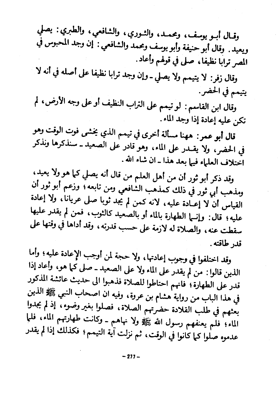 وَقَالَ أَبُو يُوسُفَ وَمُحَمَّدٌ وَالثَّوْرِيُّ وَالشَّافِعِيُّ وَالطَّبَرِيُّ يُصَلِّي وَيُعِيدُ وَقَالَ أَبُو حَنِيفَةَ وَأَبُو يُوسُفَ ومحمد والشافعي إن وجد المحبوس في الصمر تُرَابًا نَظِيفًا صَلَّى فِي قَوْلِهِمْ وَأَعَادَ وَقَالَ زُفَرُ لَا يَتَيَمَّمُ وَلَا يُصَلِّي وَإِنْ وَجَدَ تُرَابًا نَظِيفًا عَلَى أَصْلِهِ فِي أَنَّهُ لَا يَتَيَمَّمُ فِي الْحَضَرِ وَقَالَ ابْنُ الْقَاسِمِ لَوْ تَيَمَّمَ عَلَى التُّرَابِ النَّظِيفِ أَوْ عَلَى وَجْهِ الْأَرْضِ لَمْ تَكُنْ عَلَيْهِ إِعَادَةٌ إِذَا وَجَدَ الماء قال أبو عمر ههنا مَسْأَلَةٌ أُخْرَى فِي تَيَمُّمِ الَّذِي يَخْشَى فَوْتَ الْوَقْتِ وَهُوَ فِي الْحَضَرِ وَلَا يَقْدِرُ عَلَى الْمَاءِ وَهُوَ قَادِرٌ عَلَى الصَّعِيدِ سَنَذْكُرُهَا وَنَذْكُرُ اخْتِلَافَ الْعُلَمَاءِ فِيمَا بَعْدَ هَذَا إِنْ شَاءَ اللَّهُ وَقَدْ ذَكَرَ أَبُو ثَوْرٍ أَنَّ مِنْ أَهْلِ الْعِلْمِ مَنْ قَالَ إِنَّهُ يُصَلِّي كَمَا هُوَ وَلَا يُعِيدُ وَمَذْهَبُ أَبِي ثَوْرٍ فِي ذَلِكَ كَمَذْهَبِ الشَّافِعِيِّ وَمَنْ تَابَعَهُ وَزَعَمَ أَبُو ثَوْرٍ أَنَّ الْقِيَاسَ أَنْ لَا إِعَادَةَ عَلَيْهِ لِأَنَّهُ كَمَنْ لَمْ يَجِدْ ثَوْبًا صَلَّى عُرْيَانًا وَلَا إِعَادَةَ عَلَيْهِ قَالَ وَإِنَّمَا الطَّهَارَةُ بِالْمَاءِ أَوْ بِالصَّعِيدِ كَالثَّوْبِ فَمَنْ لَمْ يَقْدِرْ عَلَيْهَا سَقَطَتْ عَنْهُ وَالصَّلَاةُ لَهُ لَازِمَةٌ عَلَى حَسَبِ قُدْرَتِهِ وَقَدْ أَدَّاهَا فِي وَقْتِهَا عَلَى قَدْرِ طَاقَتِهِ وَقَدِ اخْتَلَفُوا فِي وُجُوبِ إِعَادَتِهَا وَلَا حُجَّةَ لِمَنْ أَوْجَبَ الْإِعَادَةَ عَلَيْهِ وَأَمَّا الَّذِينَ قَالُوا مَنْ لَمْ يَقْدِرْ عَلَى الْمَاءِ وَلَا عَلَى الصَّعِيدِ صَلَّى كَمَا هُوَ وَأَعَادَ إِذَا قَدَرَ عَلَى الطَّهَارَةِ فَإِنَّهُمُ احْتَاطُوا لِلصَّلَاةِ فَذَهَبُوا إِلَى حَدِيثِ عَائِشَةَ الْمَذْكُورِ فِي هَذَا الْبَابِ مِنْ رِوَايَةِ هِشَامِ بْنِ عُرْوَةَ وَفِيهِ أَنَّ أَصْحَابَ النَّبِيِّ صَلَّى اللَّهُ عَلَيْهِ وَسَلَّمَ الَّذِينَ بَعَثَهُمْ فِي طَلَبِ الْقِلَادَةِ حَضَرَتْهُمُ الصَّلَاةُ فَصَلَّوْا بِغَيْرِ وُضُوءٍ إِذْ لَمْ يَجِدُوا الْمَاءَ فَلَمْ يُعَنِّفْهُمْ رَسُولُ اللَّهِ صَلَّى اللَّهُ عَلَيْهِ وَسَلَّمَ وَلَا نَهَاهُمْ وَكَانَتْ طَهَارَتُهُمُ الْمَاءَ فَلَمَّا عَدِمُوهُ صَلَّوْا كَمَا كَانُوا فِي الْوَقْتِ ثُمَّ نَزَلَتْ آيَةُ التَّيَمُّمِ فَكَذَلِكَ إِذَا لَمْ يَقْدِرْ