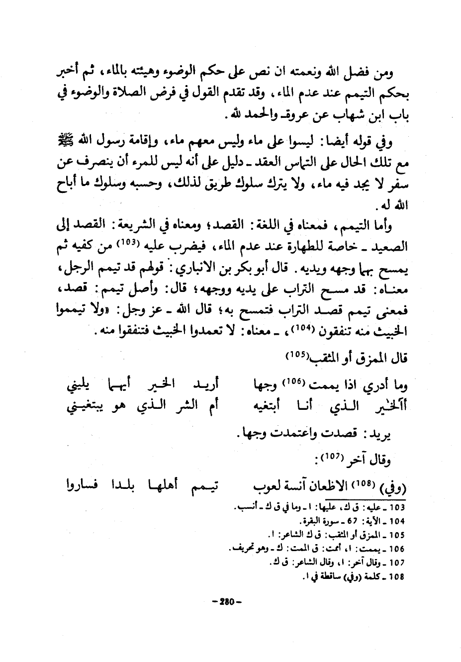 وَمِنْ فَضْلِ اللَّهِ وَنِعْمَتِهِ أَنْ نَصَّ عَلَى حُكْمِ الْوُضُوءِ وَهَيْئَتِهِ بِالْمَاءِ ثُمَّ أَخْبَرَ بِحُكْمِ التَّيَمُّمِ عِنْدَ عَدَمِ الْمَاءِ وَقَدْ تَقَدَّمَ الْقَوْلُ في فرض الصلاة ولاوضوء فِي بَابِ ابْنِ شِهَابٍ عَنْ عُرْوَةَ وَالْحَمْدُ لِلَّهِ وَفِي قَوْلِهِ أَيْضًا لَيْسُوا عَلَى مَاءٍ وَلَيْسَ مَعَهُمْ مَاءٌ وَإِقَامَةِ رَسُولُ اللَّهِ صَلَّى اللَّهُ عَلَيْهِ وَسَلَّمَ مَعَ تِلْكَ الْحَالِ عَلَى التماس العقددليل عَلَى أَنَّهُ لَيْسَ لِلْمَرْءِ أَنْ يَنْصَرِفَ عَنْ سَفَرٍ لَا يَجِدُ فِيهِ مَاءً وَلَا يَتْرُكَ سُلُوكَ طَرِيقٍ لِذَلِكَ وَحَسْبُهُ وَسُلُوكُ مَا أَبَاحَ اللَّهُ لَهُ وَأَمَّا التَّيَمُّمُ فَمَعْنَاهُ فِي اللُّغَةِ الْقَصْدُ وَمَعْنَاهُ فِي الشَّرِيعَةِ الْقَصْدُ إِلَى الصَّعِيدِ خاصة للطهارة عند عدم الماء فيضرب عيه مِنْ كَفَّيْهِ ثُمَّ يَمْسَحُ بِهِمَا وَجْهَهُ وَيَدَهُ قَالَ أَبُو بَكْرِ بْنُ الْأَنْبَارِيِّ قَوْلُهُمْ قَدْ تَيَمَّمَ الرَّجُلُ مَعْنَاهُ قَدْ مَسَحَ التُّرَابَ عَلَى يَدَيْهِ وَوَجْهِهِ قَالَ وَأَصْلُ تَيَمَّمَ قَصَدَ فَمَعْنَى تَيَمَّمَ قَصَدَ التُّرَابَ فَتَمَسَّحَ بِهِ قَالَ اللَّهُ عَزَّ وَجَلَّ وَلَا تَيَمَّمُوا الْخَبِيثَ مِنْهُ تُنْفِقُونَ مَعْنَاهُ لَا تَعَمَّدُوا الْخَبِيثَ فَتُنْفِقُوا مِنْهُ قَالَ الْمُمَزَّقُ أَوِ الْمُثَقَّبُ ... وَمَا أَدْرِي إِذَا يَمَّمْتُ وَجْهًا ... أُرِيدُ الْخَيْرَ أَيُّهُمَا يَلِينِي ... ... أَأَلْخَيْرُ الَّذِي أَنَا أَبْتَغِيهِ ... أَمِ الشَّرُّ الَّذِي هُوَ يَبْتَغِينِي ... يُرِيدُ قَصَدْتُ وَاعْتَمَدْتُ وَجْهًا وَقَالَ آخَرُ ... (وَفِي) الْأَظْعَانِ آنِسَةٌ لَعُوبٌ ... تَيَمَّمَ أَهْلُهَا بَلَدًا فَسَارُوا