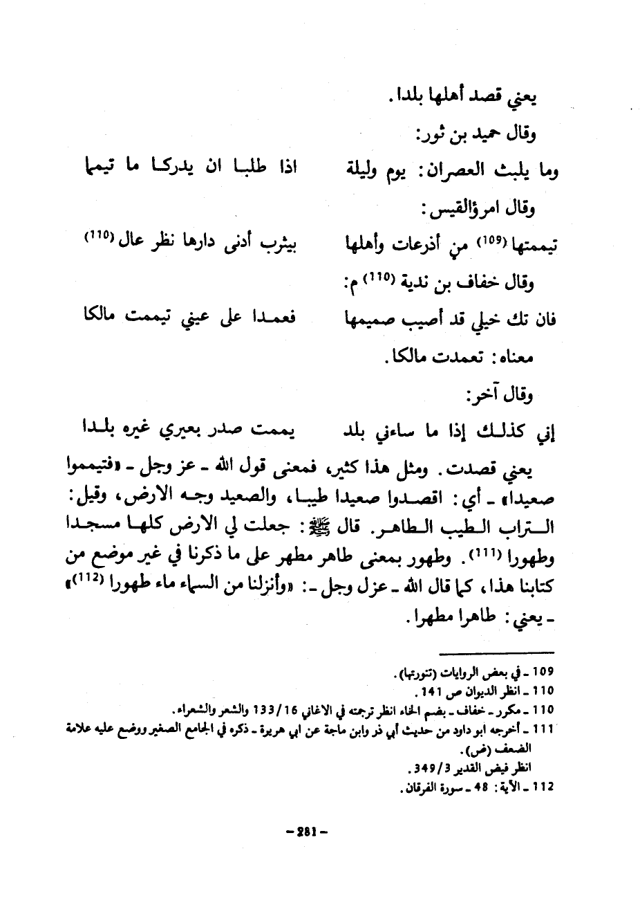 يَعْنِي قَصَدَ أَهْلُهَا بَلَدًا وَقَالَ حُمَيْدُ بْنُ ثَوْرٍ ... وَمَا يَلْبَثُ الْعَصْرَانِ يَوْمٌ وَلَيْلَةٌ ... إِذَا طُلِبَا أَنْ يُدْرِكَا مَا تَيَمَّمَا ... وَقَالَ امْرُؤُ الْقَيْسِ ... تَيَمَّمْتُهَا مِنْ أَذْرُعَاتٍ وَأَهْلُهَا ... بِيَثْرِبَ أَدْنَى دَارِهَا نَظَرٌ عَالِ ... وَقَالَ خَفَّافُ بْنُ نِدِّيَّةٍ م ... فَإِنْ تَكُ خَيْلِي قَدْ أُصِيبَ صَمِيمُهَا ... فَعَمْدًا على عين تَيَمَّمْتُ مَالِكَا ... ... مَعْنَاهُ تَعَمَّدْتُ مَالِكًا وَقَالَ آخَرُ ... إِنِّي كَذَلِكَ إِذَا مَا سَاءَنِي بَلَدٌ ... يَمَّمْتُ صَدْرَ بَعِيرِي غَيْرَهُ بَلَدَا ... يَعْنِي قَصَدْتُ وَمِثْلُ هَذَا كَثِيرٌ فَمَعْنَى قَوْلِ اللَّهِ عَزَّ وَجَلَّ فَتَيَمَّمُوا صَعِيدًا أَيِ اقْصِدُوا صَعِيدًا طَيِّبًا وَالصَّعِيدُ وَجْهُ الْأَرْضِ وَقِيلَ التُّرَابُ الطَّيِّبُ الطَّاهِرُ قَالَ صَلَّى اللَّهُ عَلَيْهِ وَسَلَّمَ جُعِلَتْ لِيَ الْأَرْضُ كلها مسجدا طهورا وَطَهُورٌ بِمَعْنَى طَاهِرٍ مُطَهِّرٍ عَلَى مَا ذَكَرْنَا فِي غَيْرِ مَوْضِعٍ مِنْ كِتَابِنَا هَذَا كَمَا قَالَ اللَّهُ عَزَّ وَجَلَّ وَأَنْزَلْنَا مِنَ السَّمَاءِ ماء طهورا يعني طاهرا مطرها