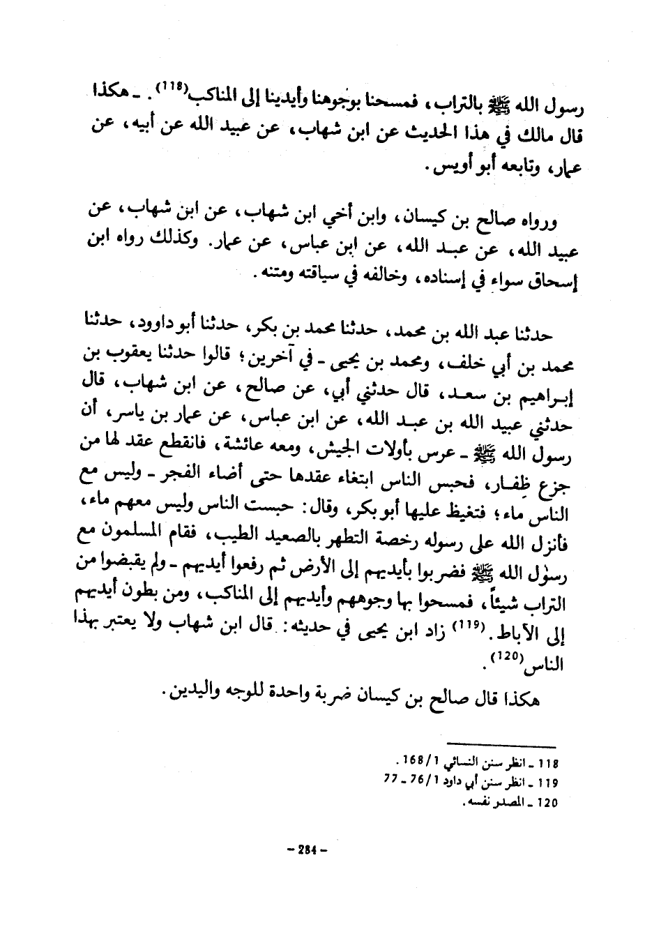 رَسُولِ اللَّهِ صَلَّى اللَّهُ عَلَيْهِ وَسَلَّمَ بِالتُّرَابِ فَمَسَحْنَا بِوُجُوهِنَا وَأَيْدِينَا إِلَى الْمَنَاكِبِ هَكَذَا قَالَ مَالِكٌ فِي هَذَا الْحَدِيثِ عَنِ ابْنِ شِهَابٍ عَنْ عُبَيْدِ اللَّهِ عَنِ أَبِيهِ عَنْ عَمَّارٍ وَتَابَعَهُ أَبُو أُوَيْسٍ وَرَوَاهُ صَالِحُ بْنُ كَيْسَانَ وَابْنُ أَخِي ابْنِ شِهَابٍ عَنِ ابْنِ شِهَابٍ عَنْ عُبَيْدِ اللَّهِ عَنْ عَبْدِ اللَّهِ عَنِ ابْنِ عَبَّاسٍ عَنْ عَمَّارٍ وَكَذَلِكَ رَوَاهُ ابْنُ إِسْحَاقَ سَوَاءً فِي إِسْنَادِهِ وَخَالَفَهُ فِي سِيَاقَتِهِ وَمَتْنِهِ حَدَّثَنَا عَبْدُ اللَّهِ بْنُ مُحَمَّدٍ حَدَّثَنَا مُحَمَّدُ بْنُ بَكْرٍ حَدَّثَنَا أَبُو دَاوُدَ حَدَّثَنَا مُحَمَّدُ بْنُ أَبِي خَلَفٍ وَمُحَمَّدُ بْنُ يَحْيَى فِي آخَرِينَ قَالُوا حَدَّثَنَا يَعْقُوبُ بْنُ إِبْرَاهِيمَ بْنِ سَعْدٍ قَالَ حدثني أَبِي عَنْ صَالِحٍ عَنِ ابْنِ شِهَابٍ قَالَ حَدَّثَنِي عُبَيْدُ اللَّهِ بْنُ عَبْدِ اللَّهِ عَنِ ابْنِ عباس عَنْ عَمَّارِ بْنِ يَاسِرٍ أَنَّ رَسُولَ اللَّهِ صَلَّى اللَّهُ عَلَيْهِ وَسَلَّمَ عَرَّسَ بِأُولَاتِ الْجَيْشِ وَمَعَهُ عَائِشَةُ فَانْقَطَعَ عِقْدٌ لَهَا مِنْ جَزْعِ ظَفَارِ فَحُبِسَ النَّاسُ ابْتِغَاءَ عِقْدِهَا حَتَّى أَضَاءَ الْفَجْرُ وليس مع الناس ماء فتغيظ عليها أبوب كر وَقَالَ حَبَسْتِ النَّاسَ وَلَيْسَ مَعَهُمْ مَاءٌ فَأَنْزَلَ اللَّهُ عَلَى رَسُولِهِ رُخْصَةَ التَّطَهُّرِ بِالصَّعِيدِ الطَّيِّبِ فَقَامَ الْمُسْلِمُونَ مَعَ رَسُولِ اللَّهِ صَلَّى اللَّهُ عَلَيْهِ وَسَلَّمَ فَضَرَبُوا بِأَيْدِيهِمْ إِلَى الْأَرْضِ ثُمَّ رَفَعُوا أَيْدِيَهُمْ وَلَمْ يَقْبِضُوا مِنَ التُّرَابِ شَيْئًا فمسحوا بها وجوهم وَأَيْدِيَهُمْ إِلَى الْمَنَاكِبِ وَمِنْ بُطُونِ أَيْدِيهِمْ إِلَى الْآبَاطِ زَادَ ابْنُ يَحْيَى فِي حَدِيثِهِ قَالَ ابْنُ شِهَابٍ وَلَا يَعْتَبِرُ بِهَذَا النَّاسُ هَكَذَا قَالَ صَالِحُ بْنُ كَيْسَانَ ضَرْبَةٌ وَاحِدَةٌ لِلْوَجْهِ واليدين